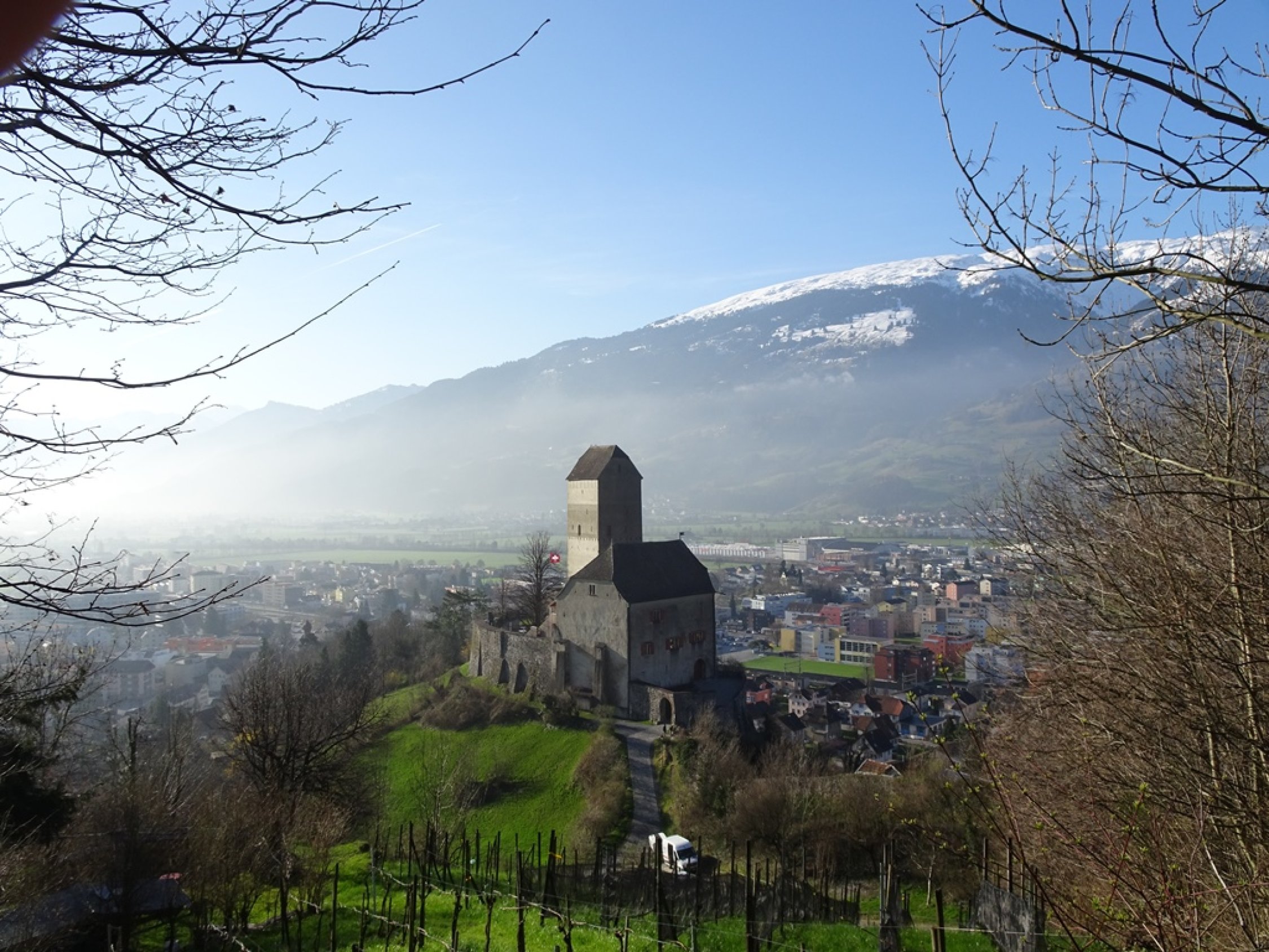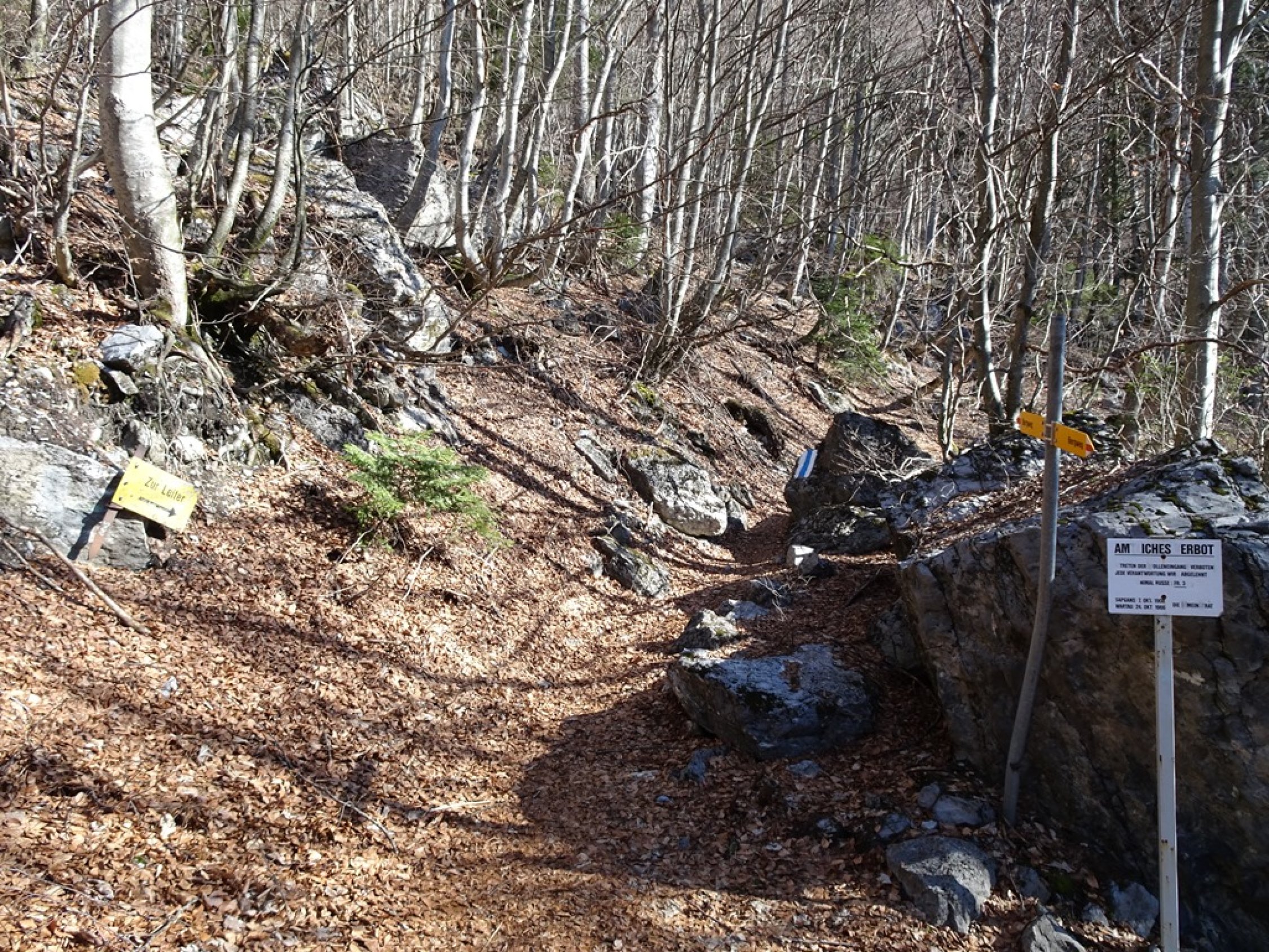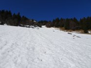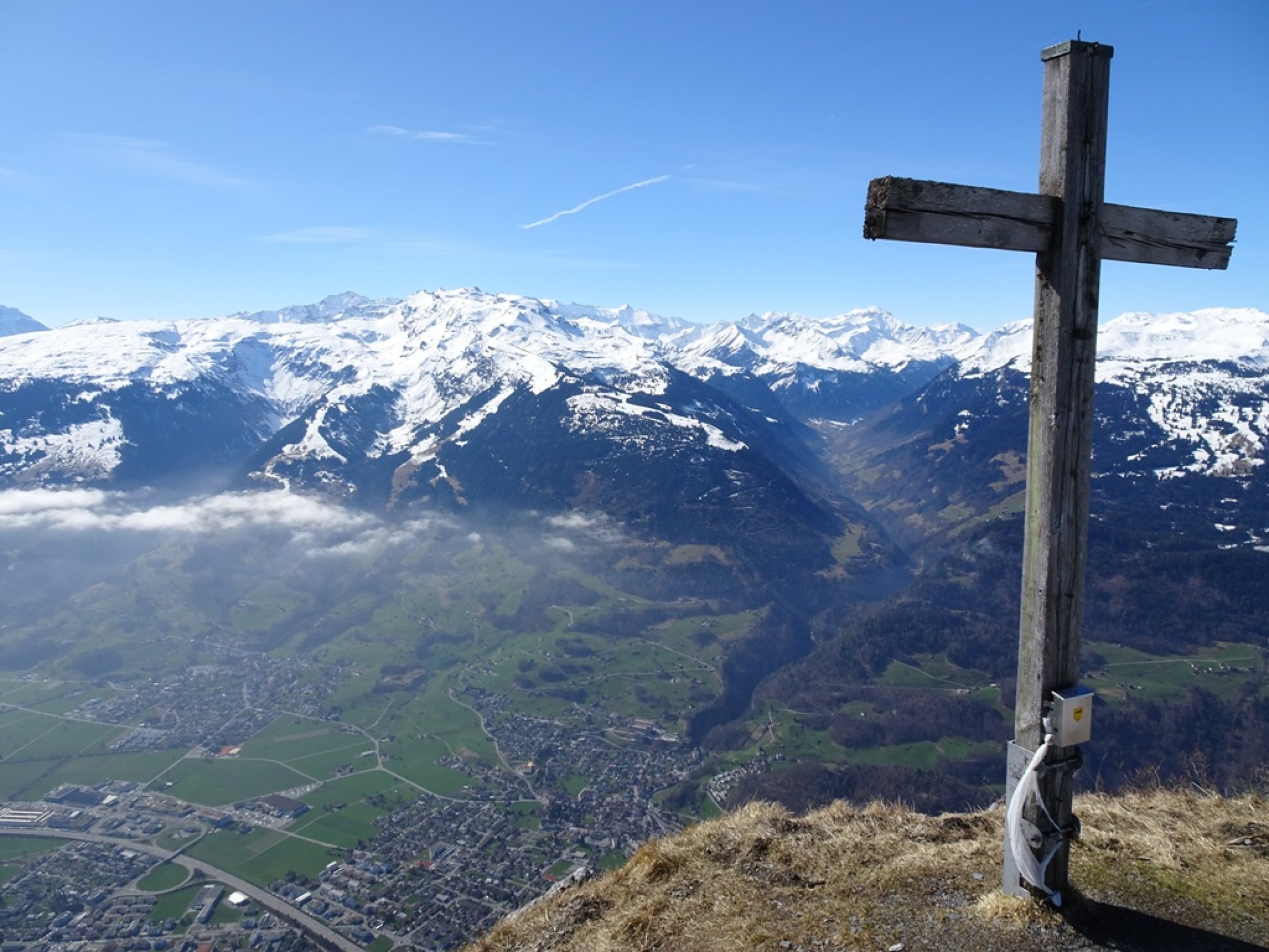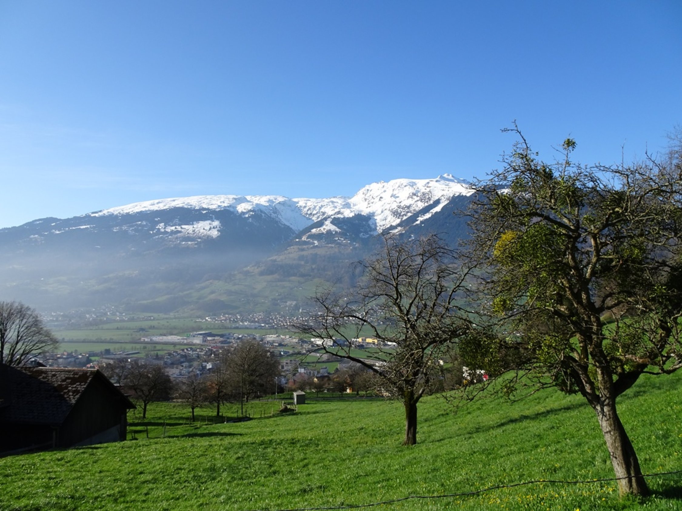 Auch wenn der Gonzen von Sargans aus schneefrei aussieht, liegt in seiner Ostflanke noch einiges an Schnee. Bis zum Älpli auf 1337 Meter ist es schneefrei und trocken. Richtung Lawinenverbauungen liegt ab ca. 1400 Meter Schnee, der bei diesen Temperaturen ziemlich weich war. Zwischen den Verbauungen dann auch knietief oder tiefer eingesunken.