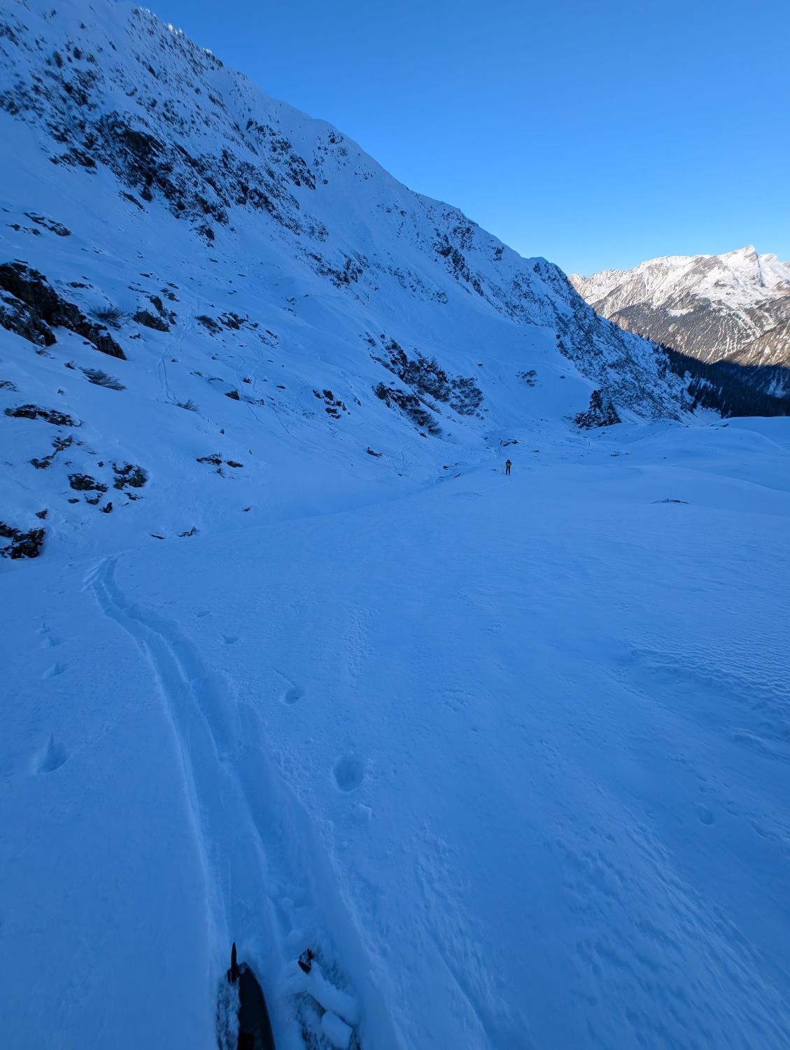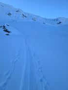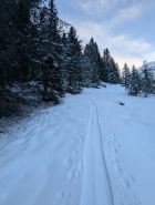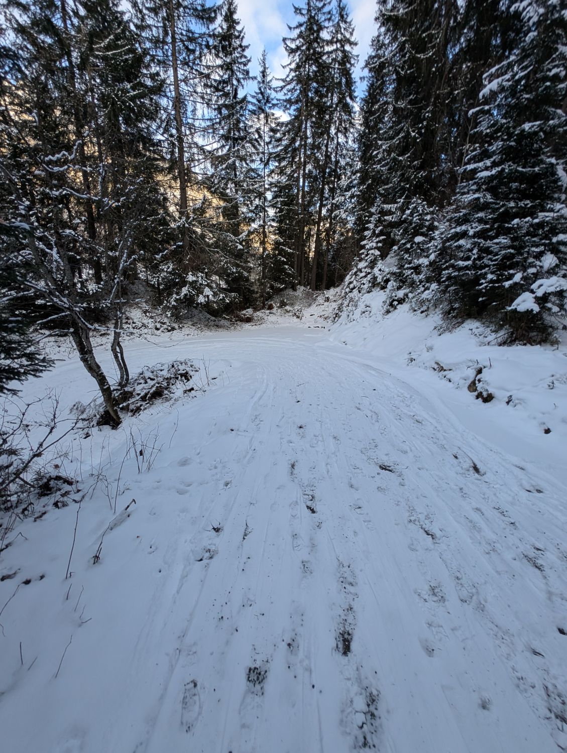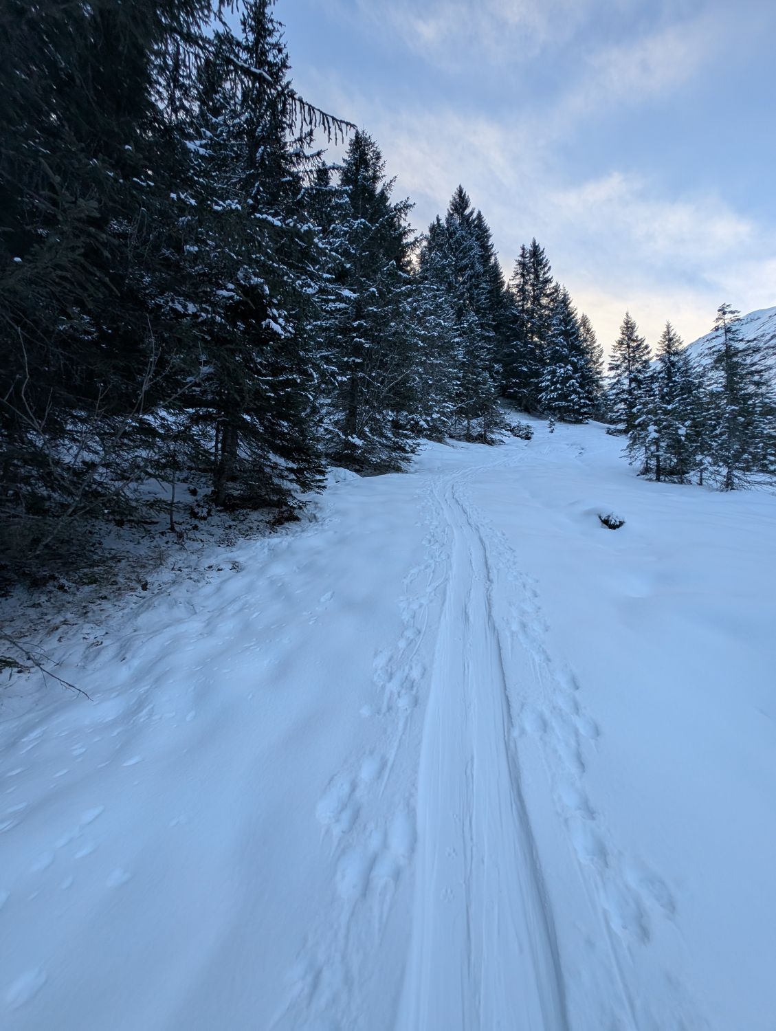 Bis auf Strassenabfahrt im Wald (20 min tragen oder mit Steinski) gute Verhältnisse. Kaum Steinkontakt dank verfestigter Unterlage. Bereich beim Wasserfall querbar. Noch sehr wenige Spuren.