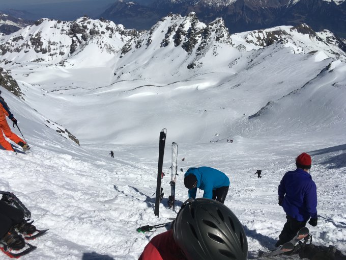 Abfahrt zuoberst pistenähnlich, dann bis Wildsee pulvrig mit Winddeckel. Ging aber gut zum Fahren. Von Widseefurggel gegen Pizolhütte wahlweise pulvrig oder sulzig oder pistenähnlich. Fuhren dann vom Twärrchamm zum Rinderläger, teils toller Sulz. Dann schöne Sulzpiste bis Furt und mit wenigen Grasfahrten :-) auf geschlossener und daher noch schöner Sulzpiste nach Meienberg (Grasfahrten dürften länger werden...).