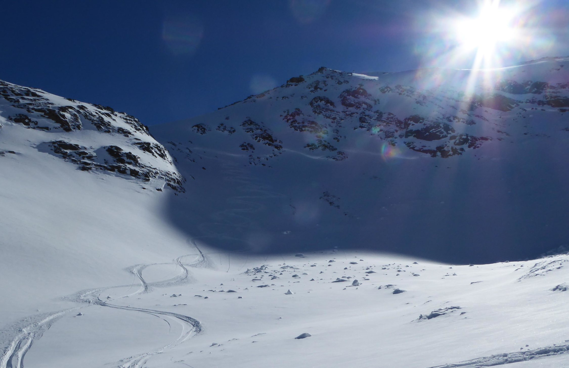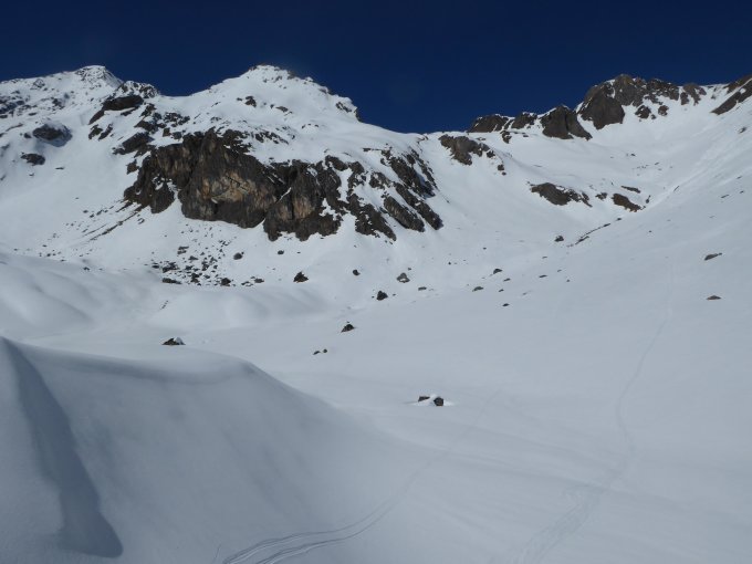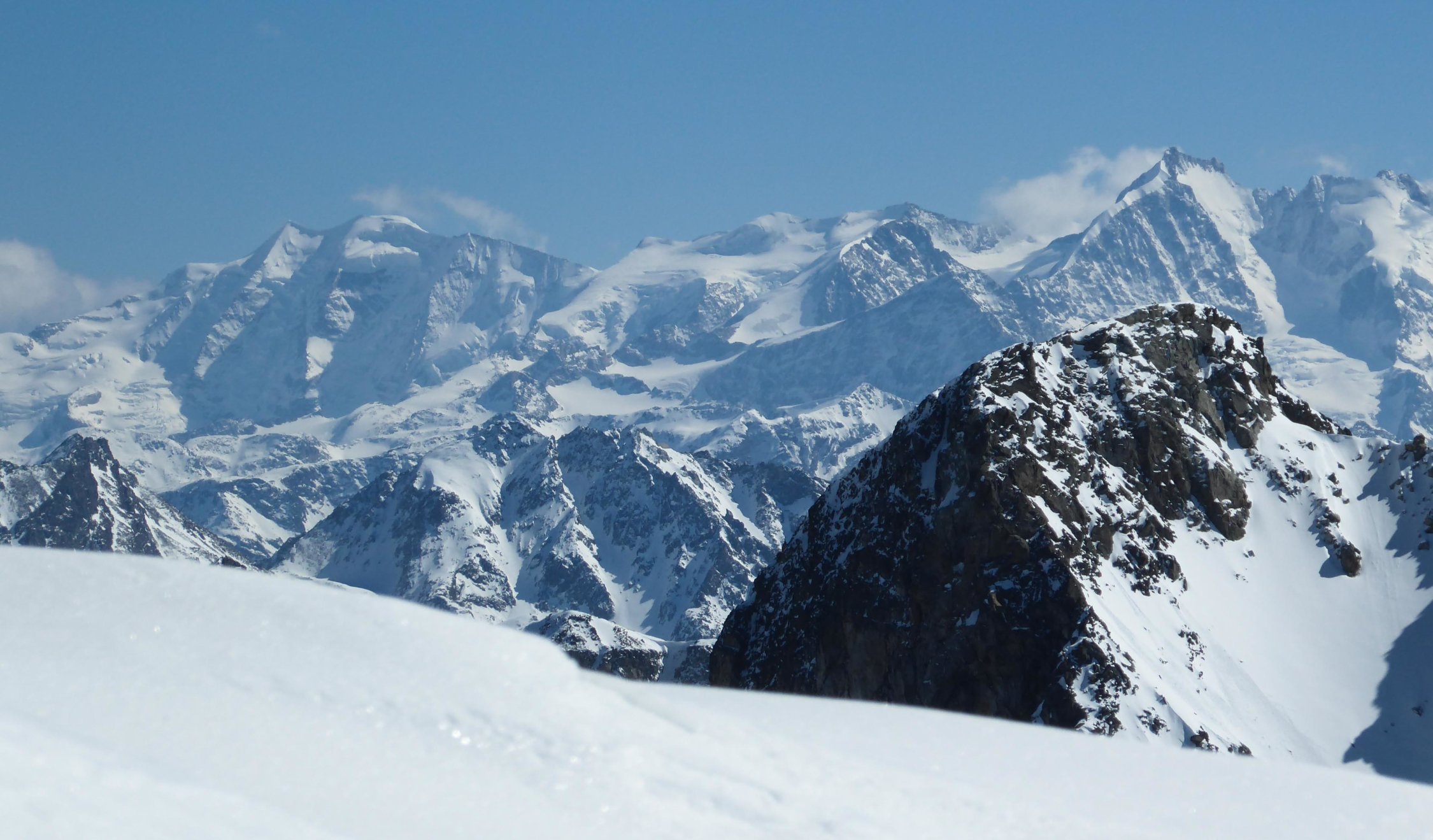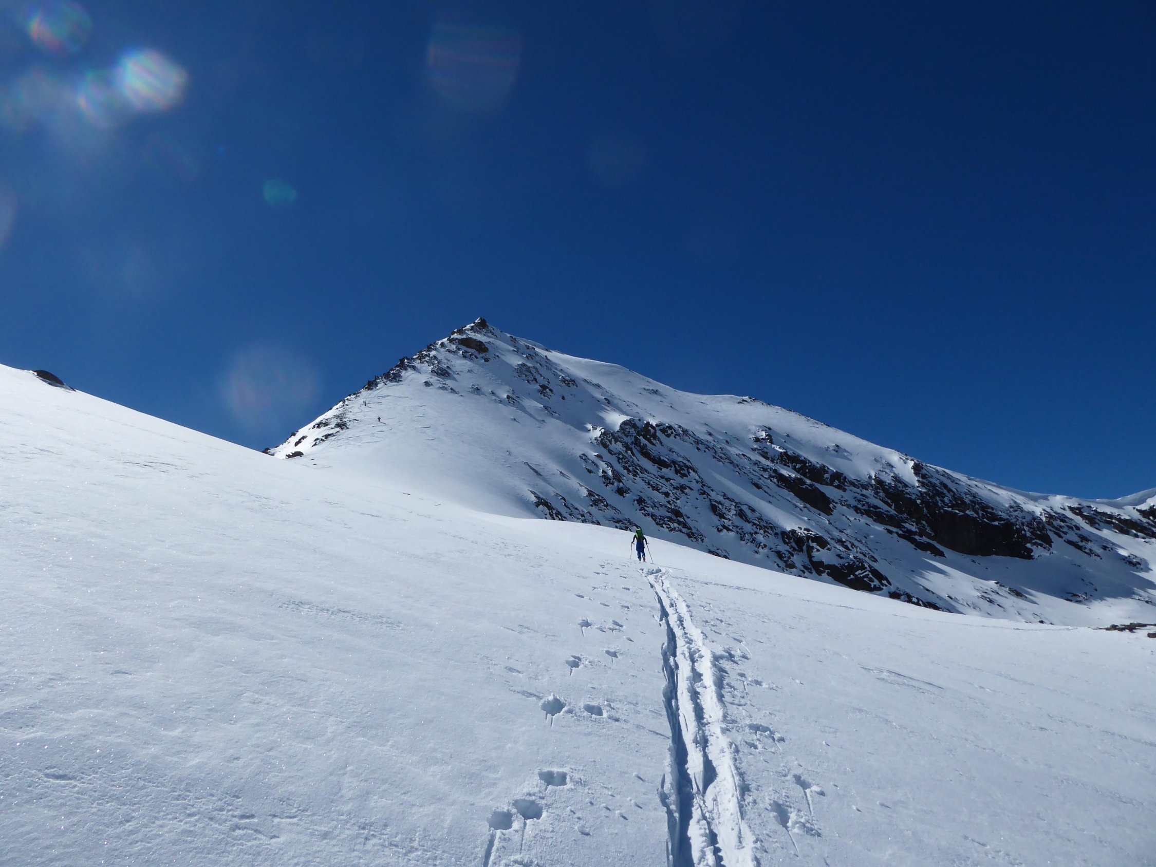 Skidepot am NO-Grat auf ca. 2970m, vorher Harscheisen, für Fussaufstieg Steigeisen nützlich. Am NW-Grat grössere Wechte.