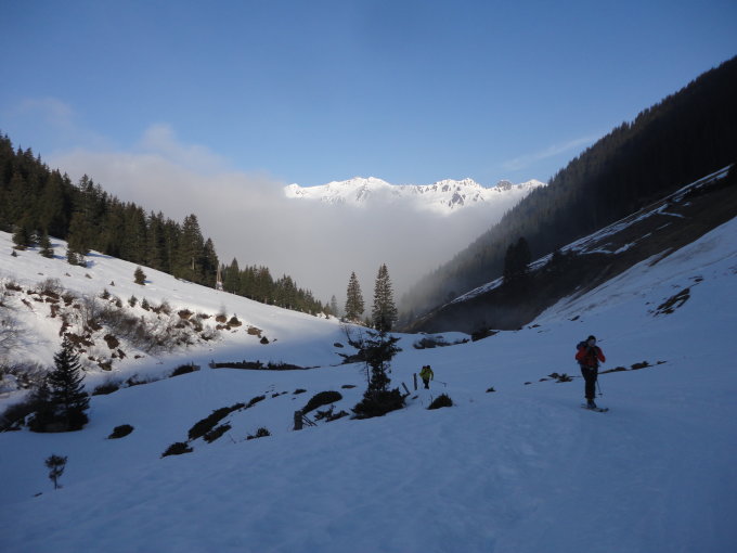 Start in Gargellen 8.25 Uhr, geschlossene Schneedecke ab Parkplatz. In Gargellen Nebel, auf 1600m dann toll sonnig, aber dann leider schnell ansteigender Nebel und weiterer Aufstieg in der "Suppe". Auf ca. 2200m wieder Sonne,tolle Stimmung, Abfahrt um 12.30 Uhr ins Wintertal, Zeitpunkt ok,eher zu früh als zu spät, oben Firn, im Nebel zeitweise Blindflug und Schnee etwas fester, aber gut zu fahren. Gargellen den ganzen Tag im Neblgrau. Hat sich allemal gelohnt!