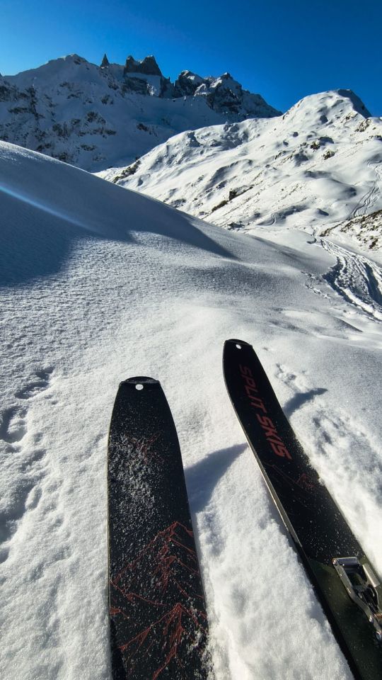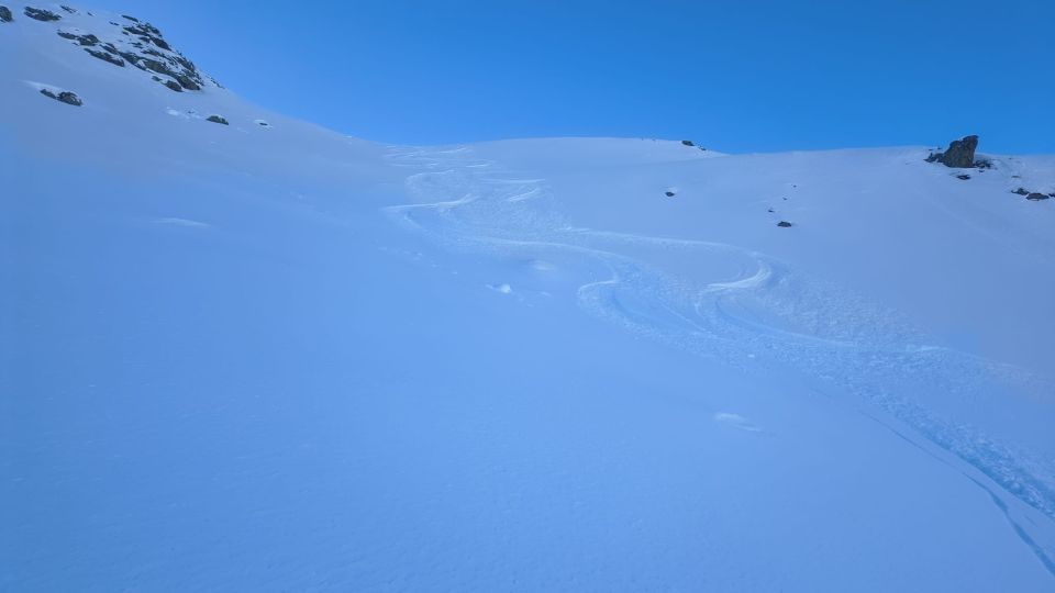 Kleine Erkundungstour vom Skigebiet aus. Schönes Wetter und pulvrige Schneeauflage - wie schön. Aber objektiv erlaubt die geringe Schneelage nur vorsichtiges Schwingen bei gedrosselter Geschwindigkeit, um das Schadenspotential beim unweigerlichen Auftreffen auf die nur gering eingeschneiten Steine zu reduzieren.