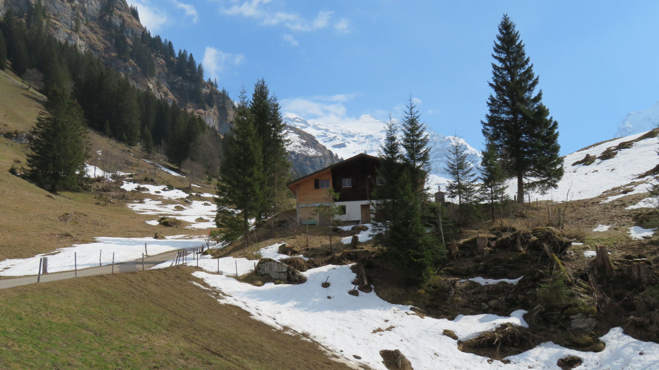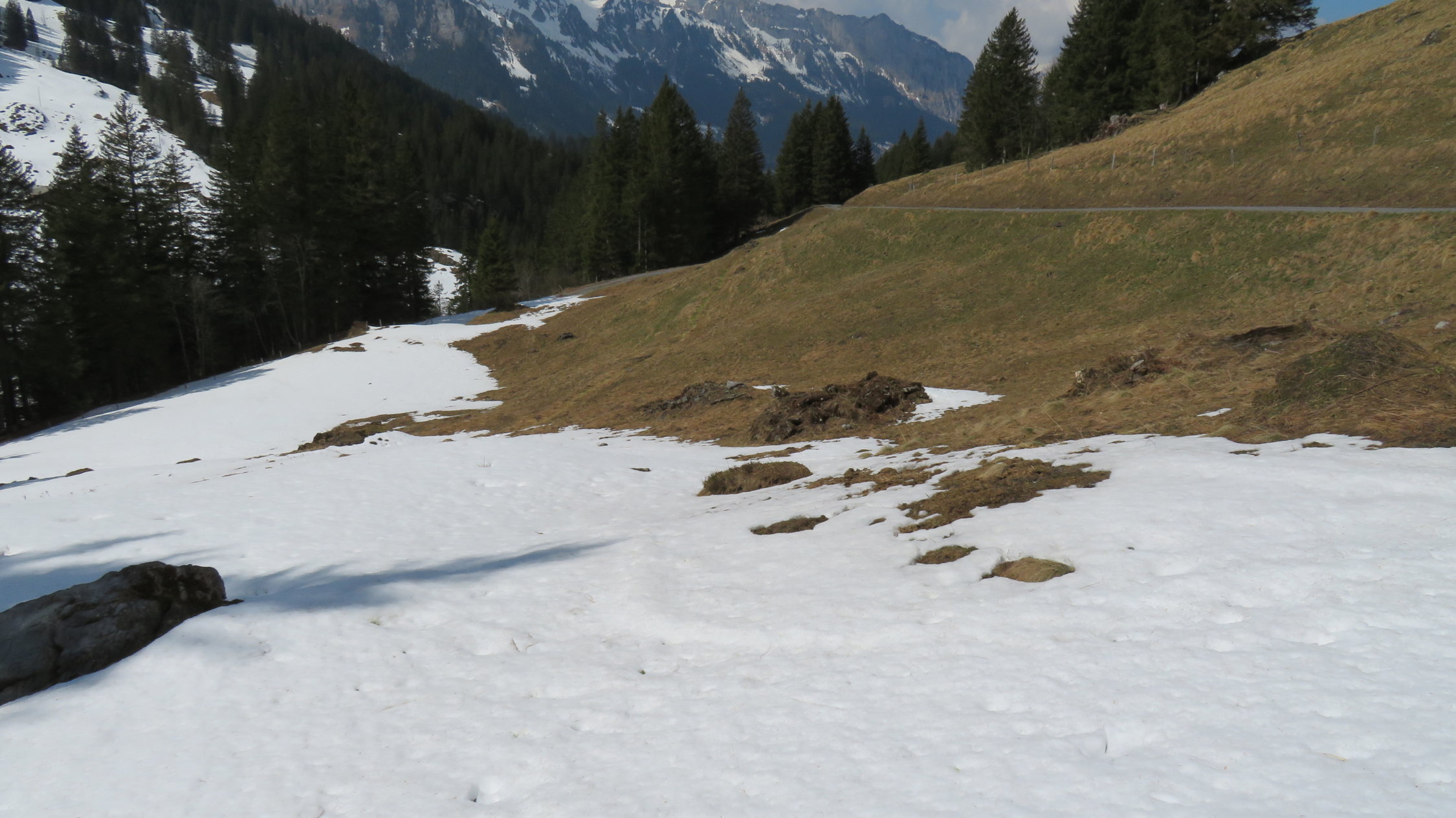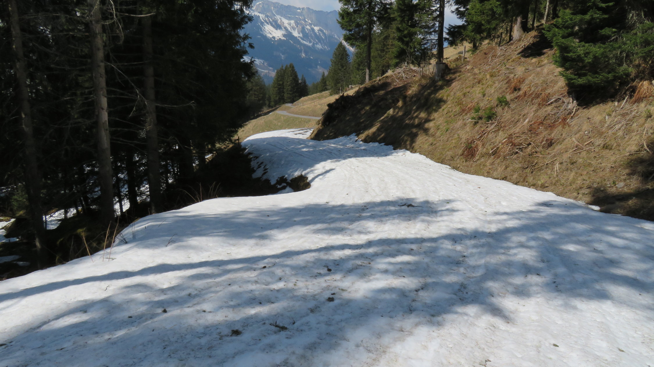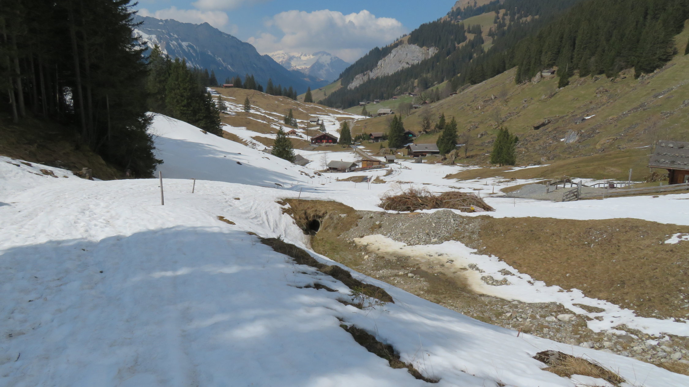 Ich habe die ersten 700m bis Steinenberg noch das Velo genommen geht aber zu Fuss auch da überall noch Schneereste auf der Strasse sind.