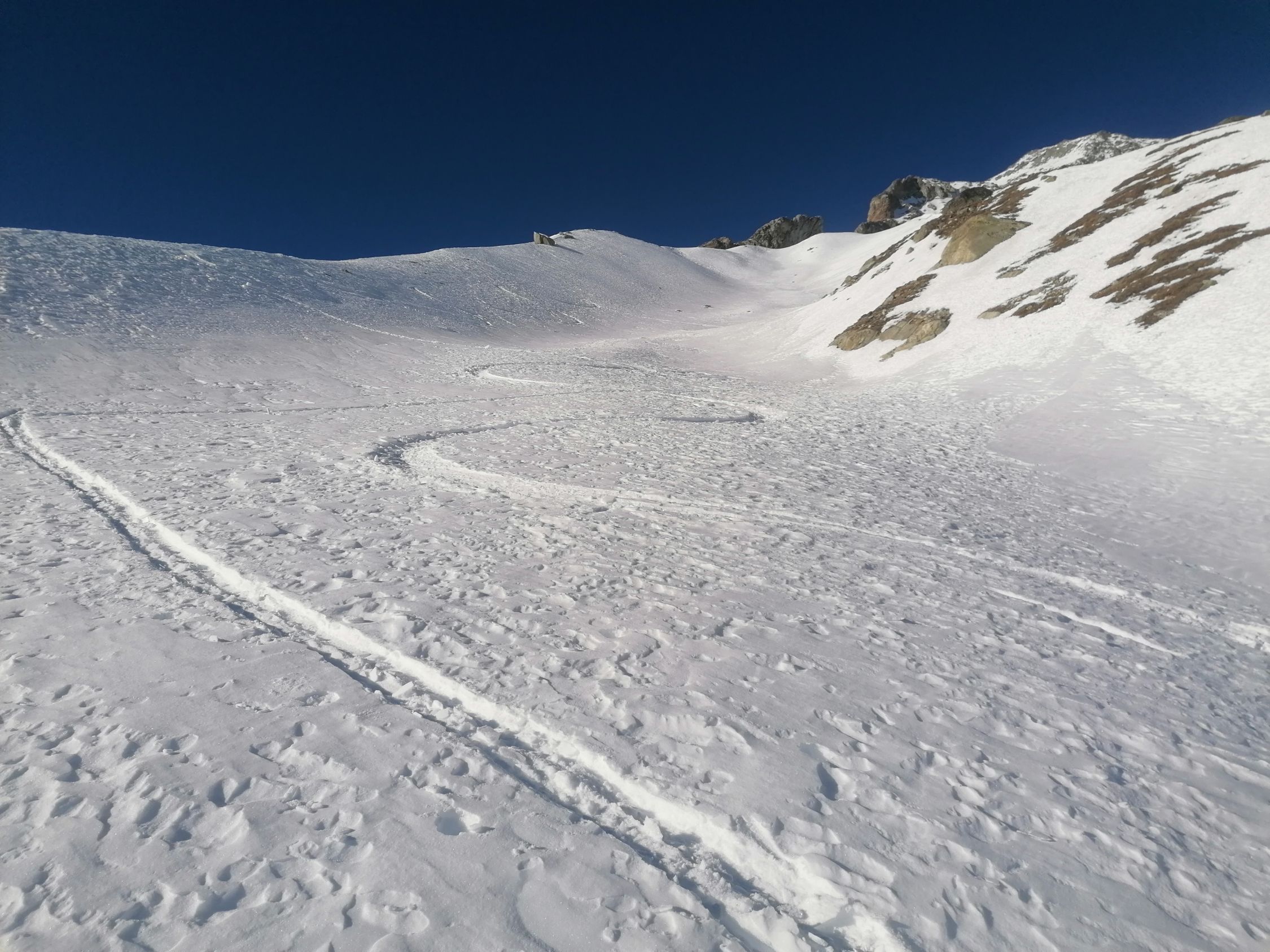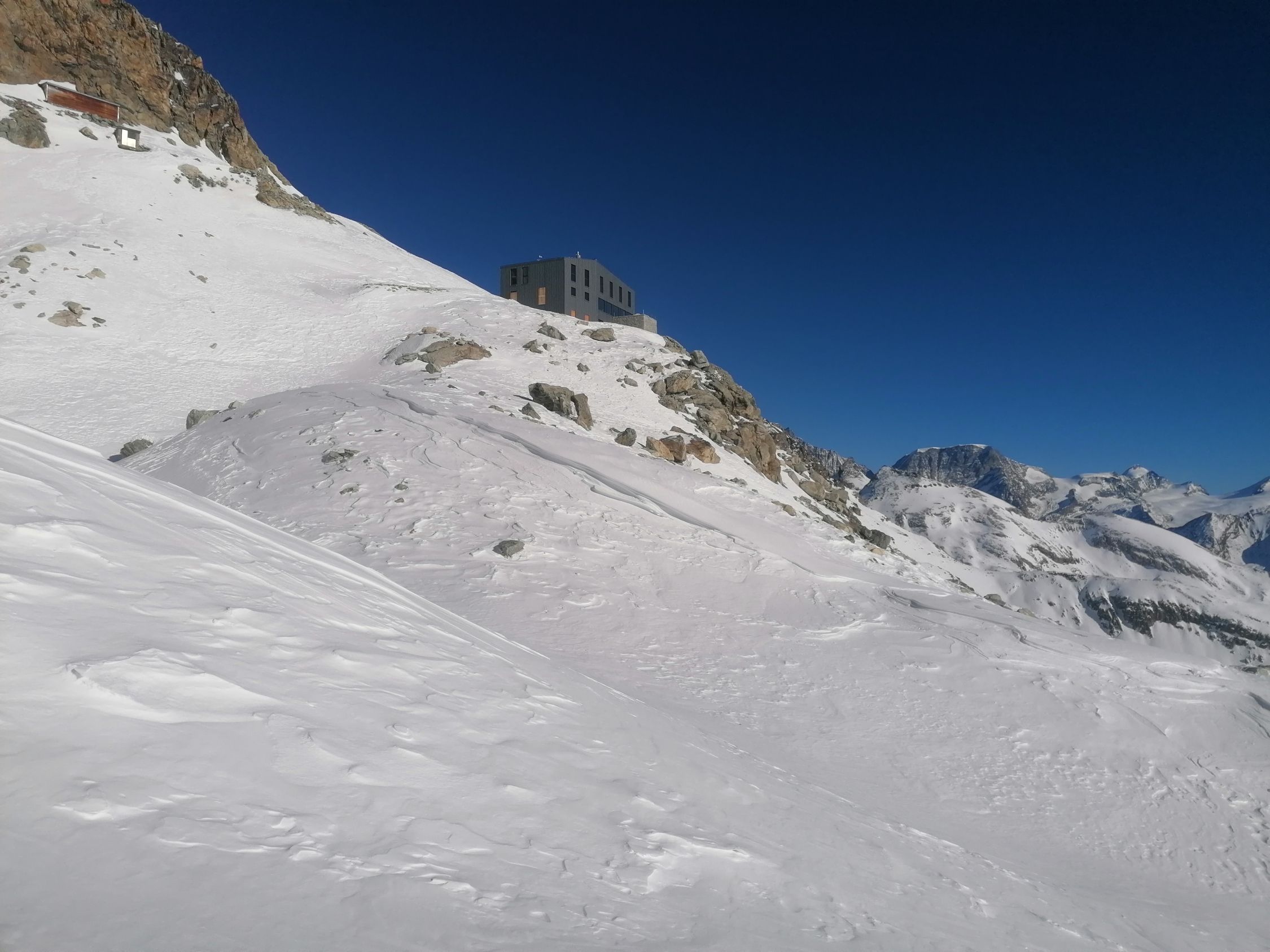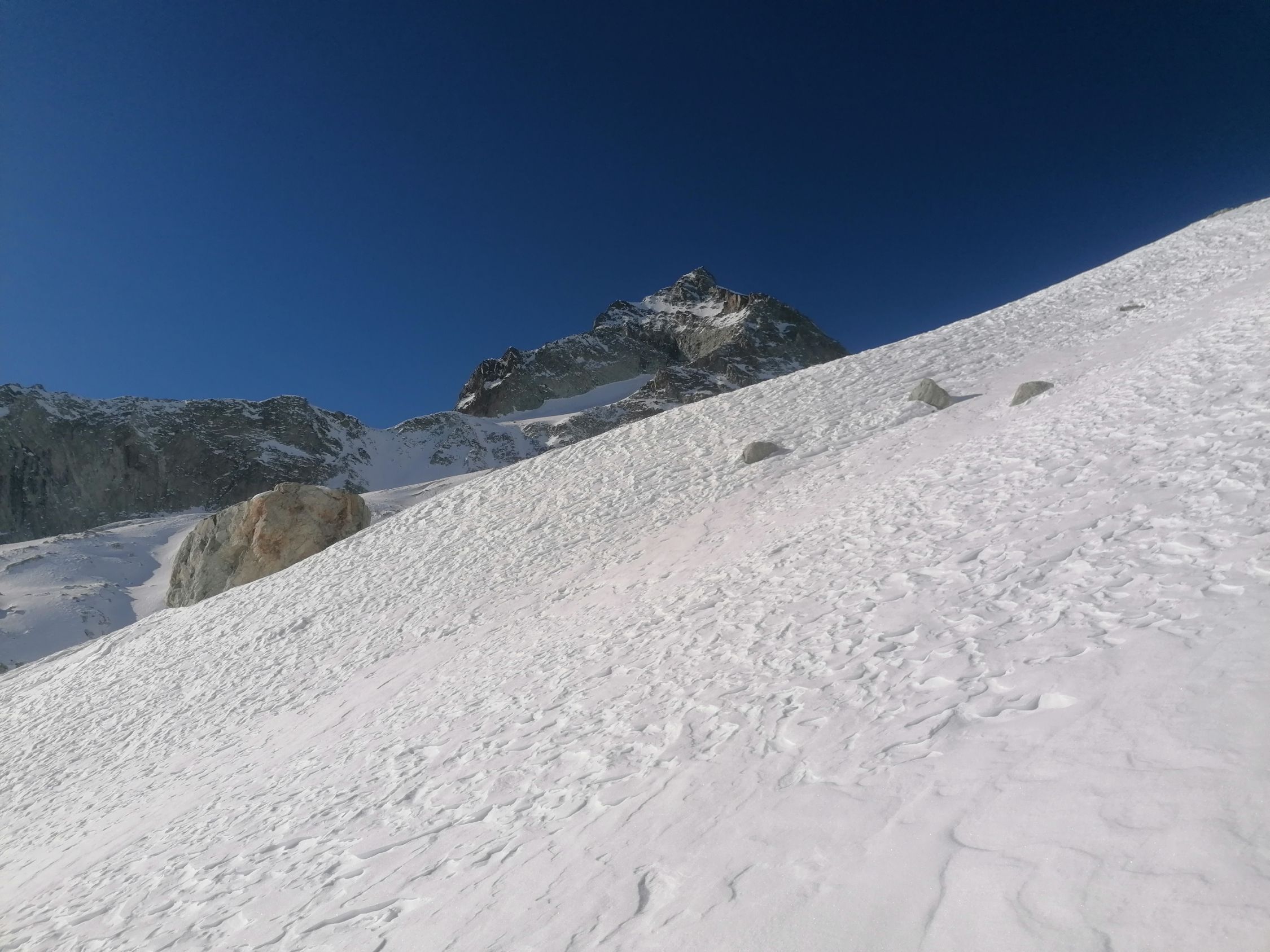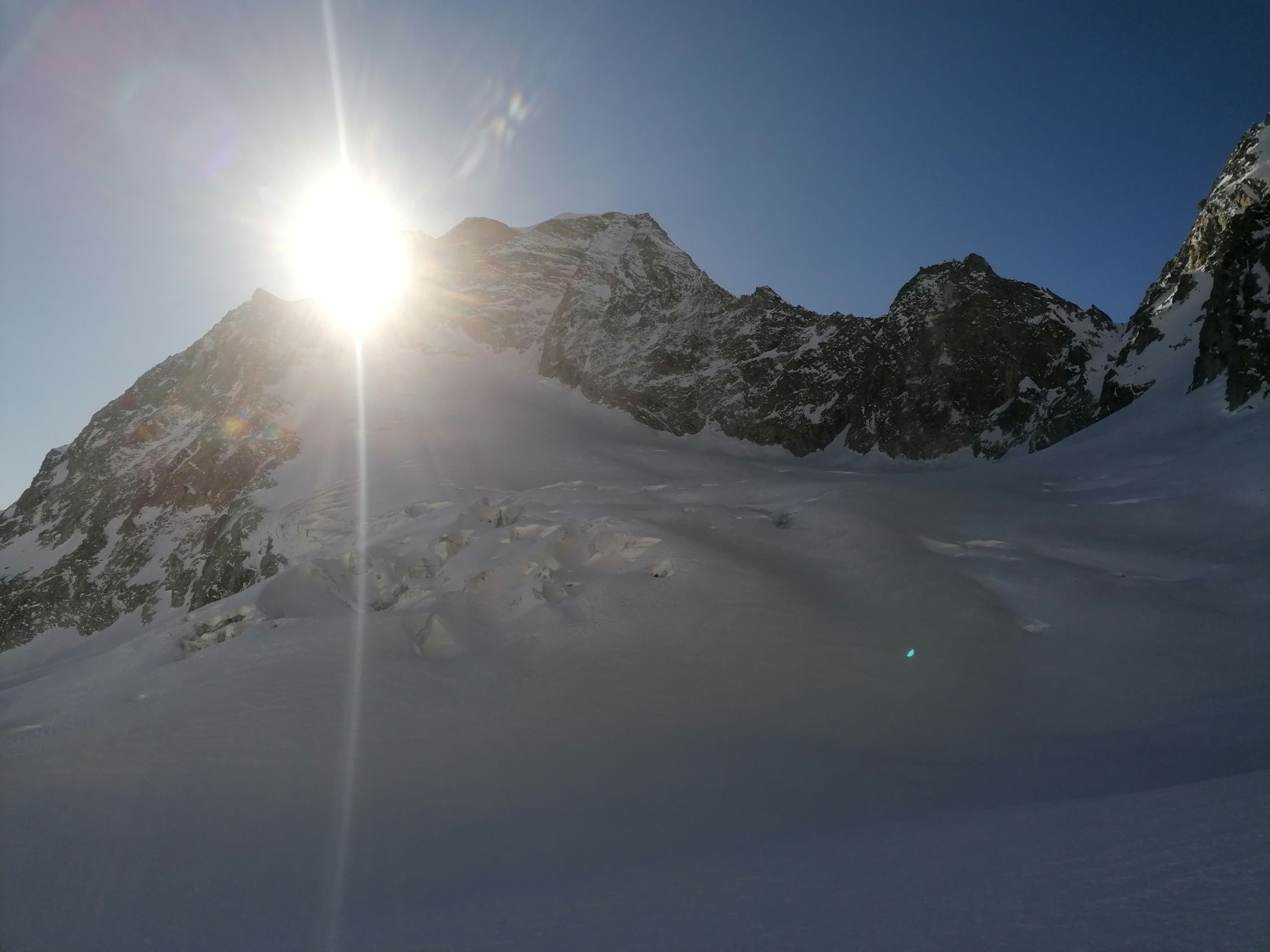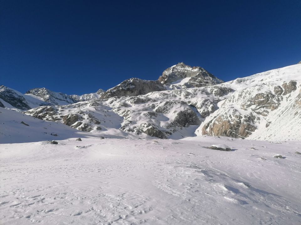 Ausgezeichnet. D.h. Diese Einstufung bezieht sich auf den Umkehrpunkt bis auf 3400m. Bis hierher tragender Firnschnee, und wunderbarer bis 30cm tiefer Pulverschnee.