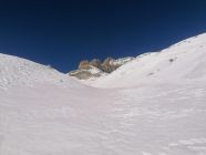 Anschliessend gedeckelter Schnee, der durch den Wind stark bearbeitet wurde. Wir erlebten 3 Wummgeräusche bereits bei einer Hangneigung von 25 Grad. Somit war klar, der Schlussanstieg war zu heikel.