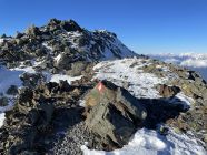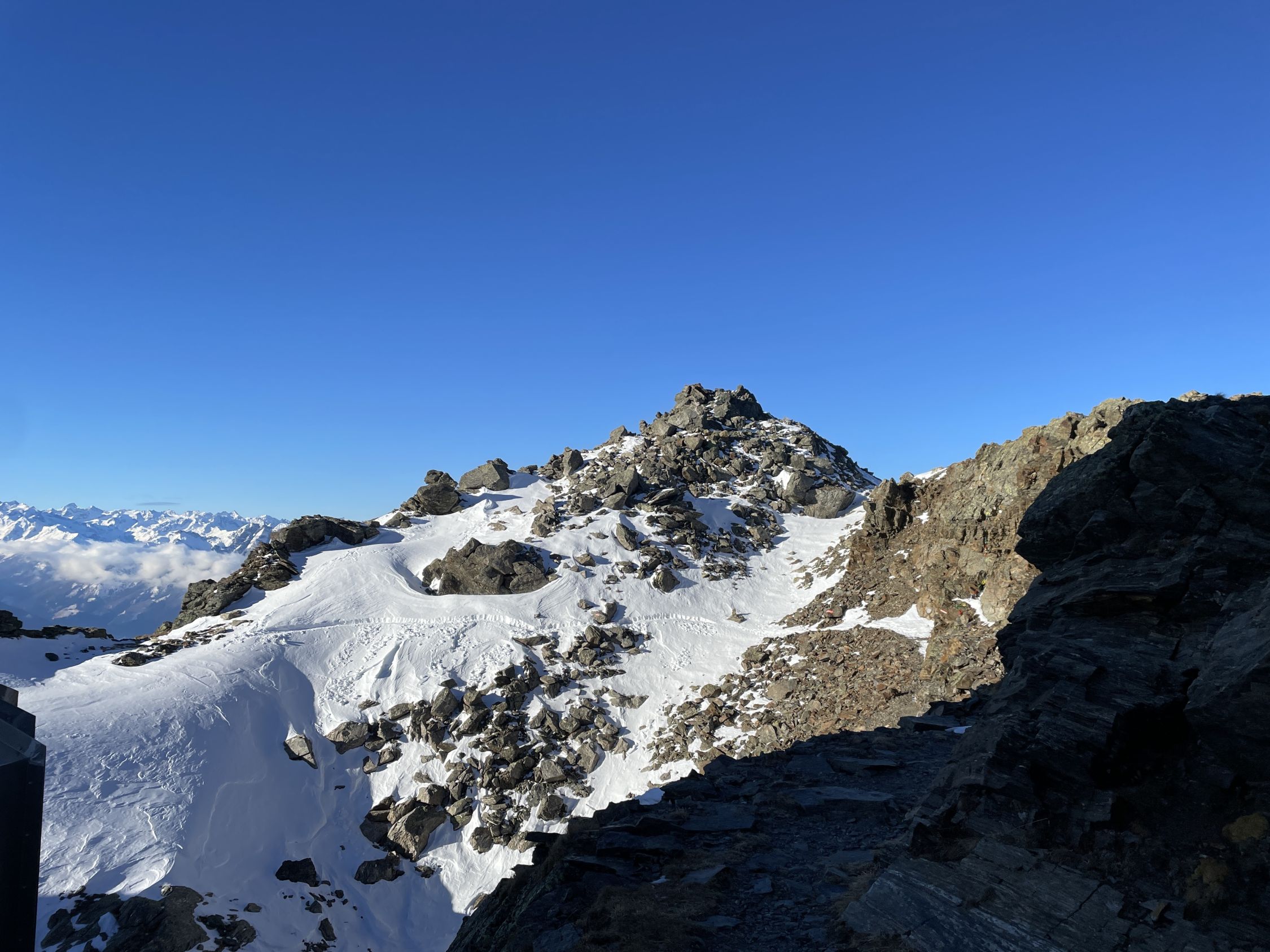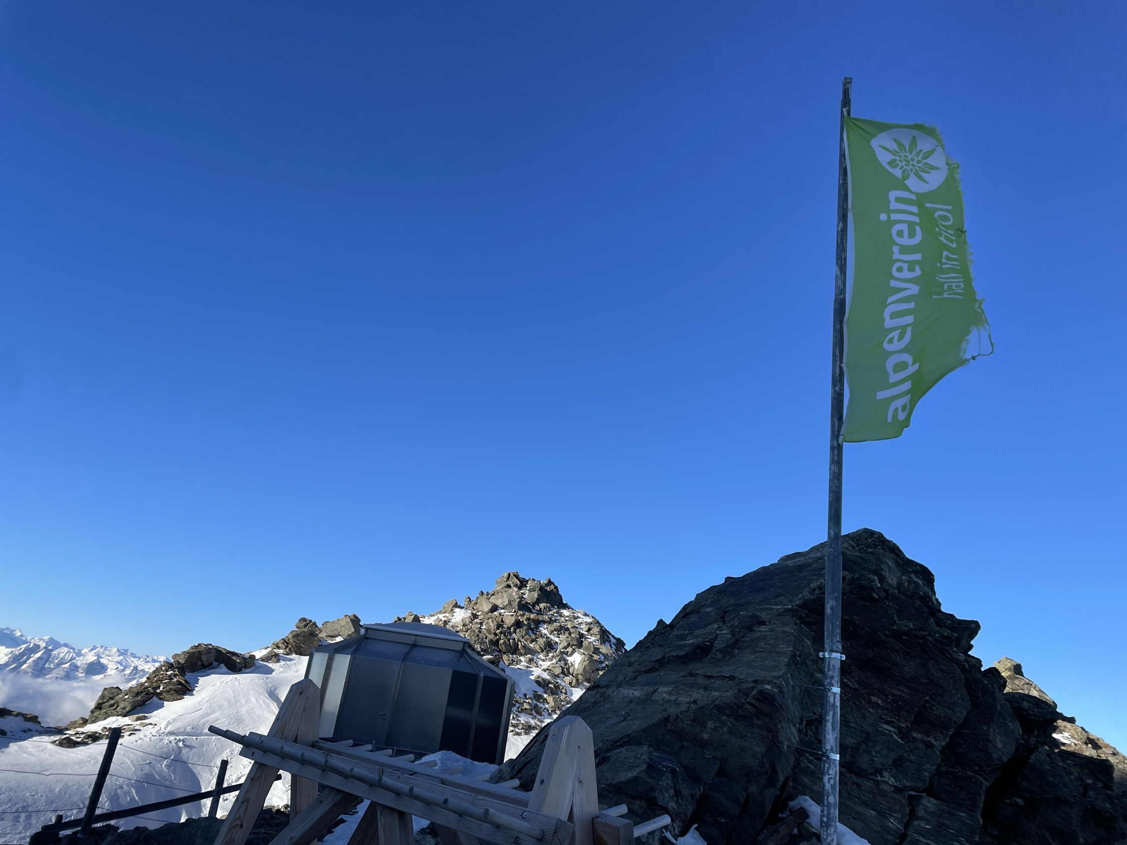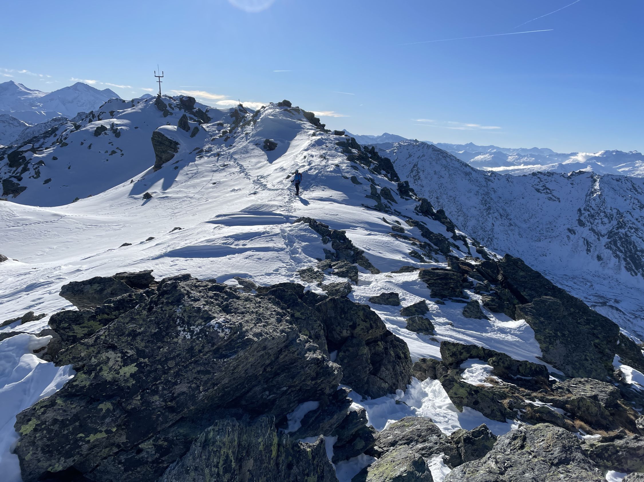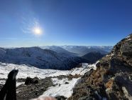 Wir begannen von der Glungezer Hütte um 10:10 Uhr bei -14°C zur Sonnenspitze auf- und wieder abzusteigen unter klarem Himmel. Anschließend probierten wir die Grat-Tour zur Gamslahnerspitze. Dort sahen wir gestern vom Glungezer aus alte Fußspuren. Am Vorabend erzählte uns der Hüttenwirt, dass vor einigen Tagen dorthin welche liefen und wieder zurück. Nach der letzten Antenne auf dem Glungezer liefen wir noch ca. 200 m dann entschied ich, umzudrehen trotz Steigeisen am Schuh. Mit meinem operierten Bein war mir das im Bruchharsch zu heikel.