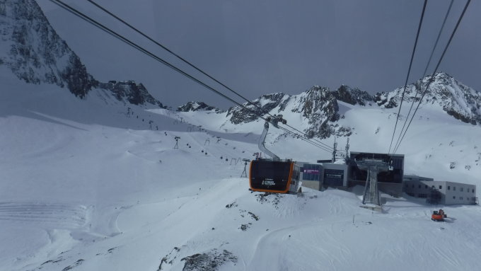 Betriebszeiten der 3S-Eisgrat-Gondelbahn: von 08:30 bis 16:30 Uhr. Die Tourengeher-Karte kostet € 20,00 und keinen Pfand (Stand 2017). Ein großes Kompliment dem betreffenden Personal der Stubaier Gletscherbahnen: Obwohl in den Winter-Prospekten darauf hingewiesen wird, daß Fußgänger nur mit Gondelbahnen befördert werden, sah man mich am 2er Sessellift zum Pfaffengrat mit Schneeschuhen nicht als Fußgänger an. Und ich genoß so die 125 Hm hinauf zum langen Abstieg. An der Mittelstation Fernau kam ich um 16:50 Uhr an. Obwohl die letzte Talfahrt der 3S-Eisgrat-Gondelbahn um 16:30 Uhr sein sollte, lud mich der Maschinist noch ein. So auch noch nach mir die 4 leicht beschwippsten Skifahrer von der Dresdner Hütte. Danke !