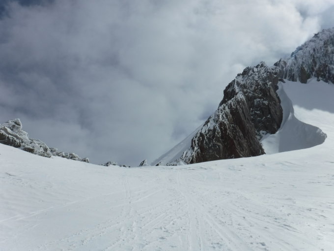 10 Skitourengänger am Depot angetroffen. Im Abstieg begegnete ich noch 14 weiteren. Über die Nordflanke stiegen 2 auf mit Skiern am Rucksack hoch. Ich hatte vor, zum Langen Pfaffennieder und über östlichen Fernauferner abzusteigen. Der Einstieg des alpinen Steigs ist jedoch aufgrund der Eisabschmelzung zur Hangelaktion am Seil mutiert, was ich wegen dem Gepäck mir allerdings nicht antun wollte, so daß ich zum Pfaffenjoch wieder aufstieg und über das Fernaujoch den Fernaugletscher von Nord nach Süd über die Skipisten abstieg. Danke den beiden Vorarlbergerinnen für’s Foto auf dem Zuckerhütl.