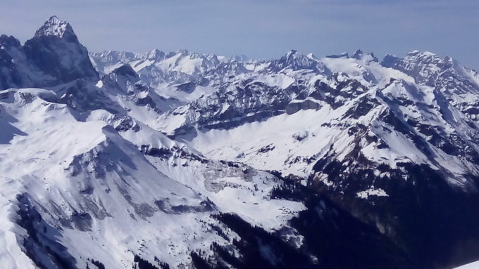 Abfahrt 12.00. Oben ruppig, Nordhänge Bruch. Da wo die Sonne ist findet man schöne Schwünge im Sulz. Nicht optimal, aber tolles Wetter, windstill.