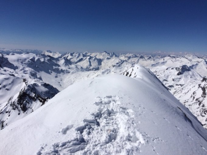 Morgens um 7 Uhr in Splügen gestartet. Hartgefrorener Schnee. Um 12 Uhr auf dem Gipfel des Piz Tambo. Schlussaufstieg auf den Gipfel Steigeisen und Pickel nötig. Abfahrt über Nordcouloir gut machbar, auch wenns gehörig in die Beine geht und viel Puste braucht.