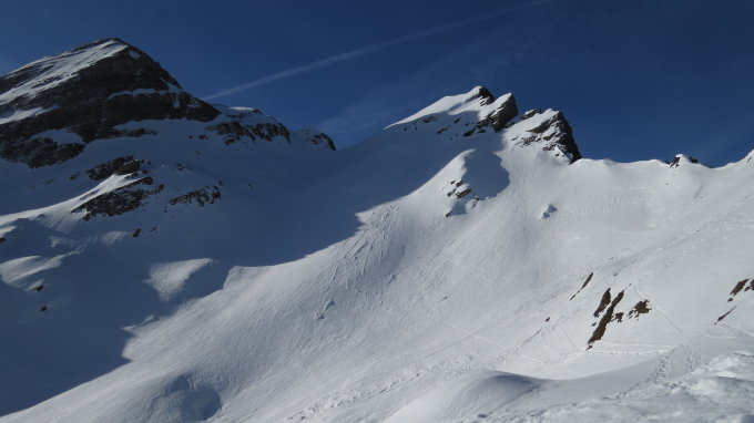 Abfahrt oben raus hart und ruppig, ein solide Technik wird im Steilhang benötigt, Sonnenhänge trotzdem nett gefirnt. Bereits oberhalb vom Obersäss war der Schnee sonnseitig tief und schwer zu fahren, in einigen schattigen Mulden wars kurz mal etwas besser.