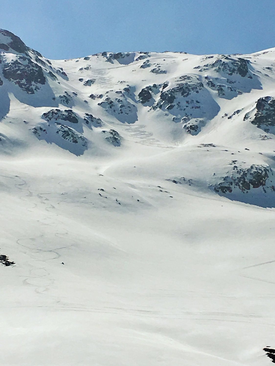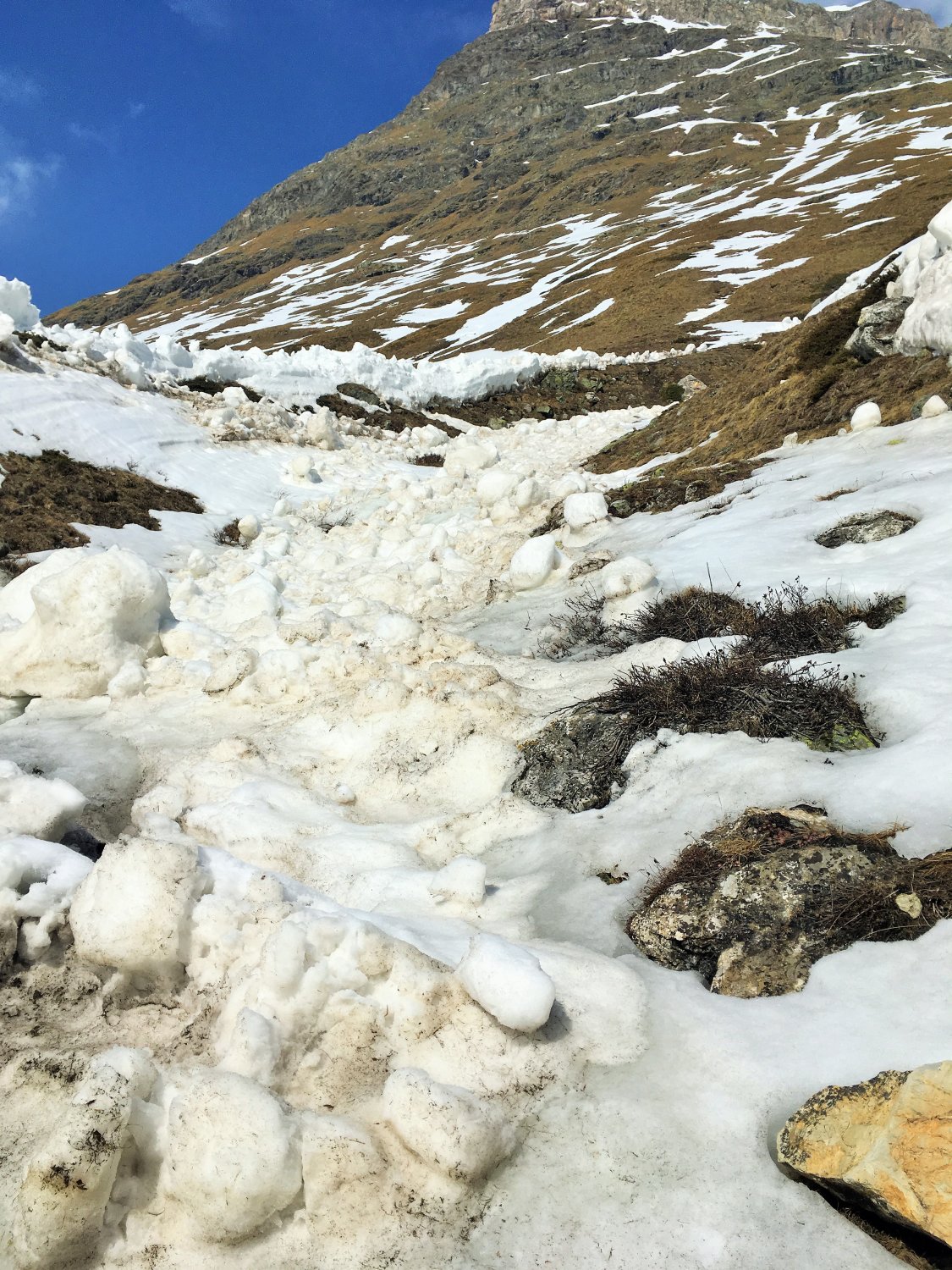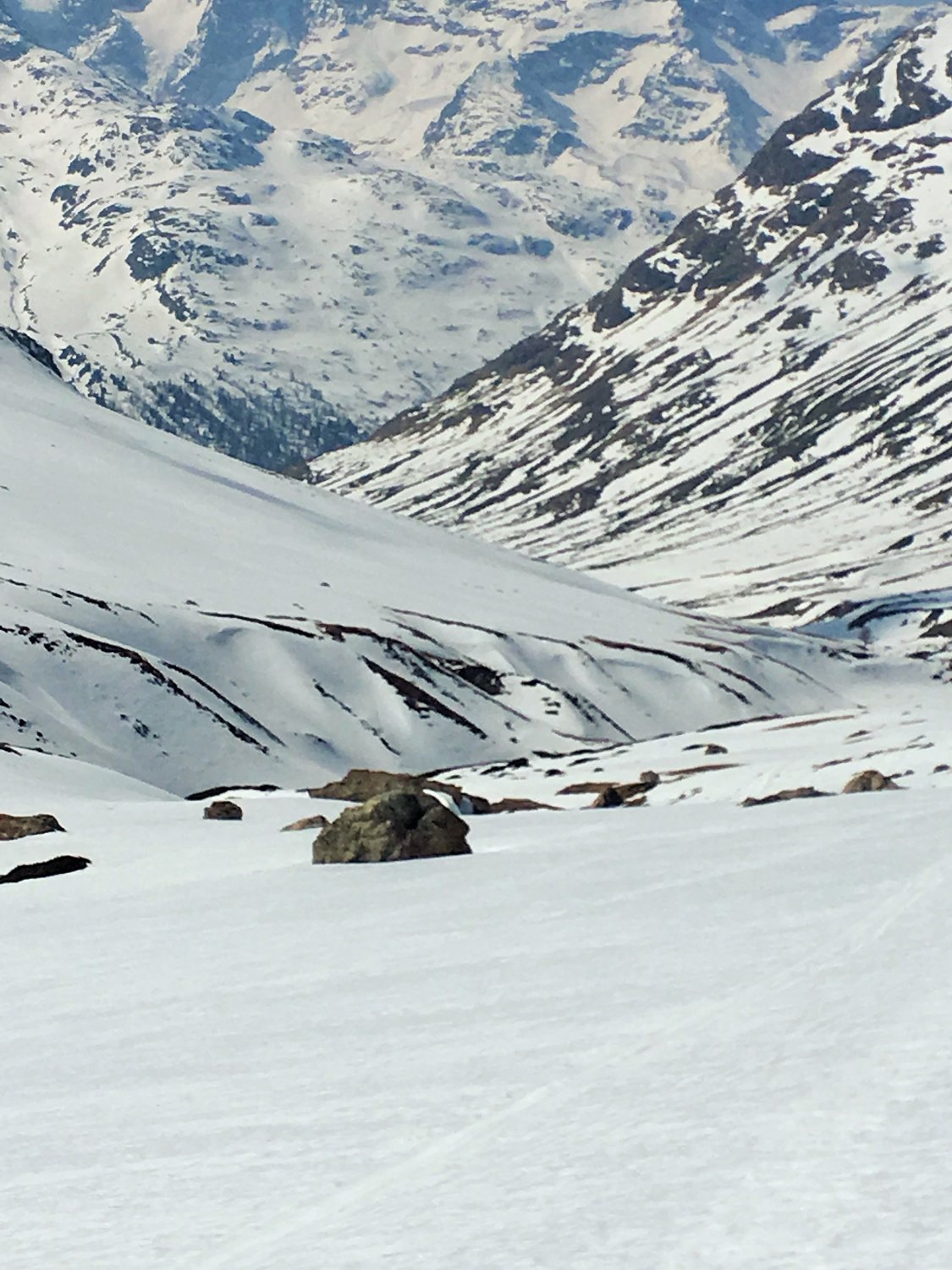 Perfekte Firnverhältnisse auf der ganzen Tour. Ich bin um 11 Uhr beim Skidepot abgefahren. Oberfläche perfekt weich auf der ganzen Abfahrt. Vor allem der obere Teil mit dem anfangs sanften Gelände und dann das schöne Südcouloir ein Genuss. Fast durchgehende Schneedecke im Val da Fain. Überrascht war ich von der gewaltigen Nassschneelawine mit Anrissstelle Val Tschüffer auf ca. 2400 m Höhe. Die Lawine muss in den letzten Tagen die Aufstiegsroute unterbrochen haben. Man muss die Skis tragen für Querung der Lawine, aber kein Problem.