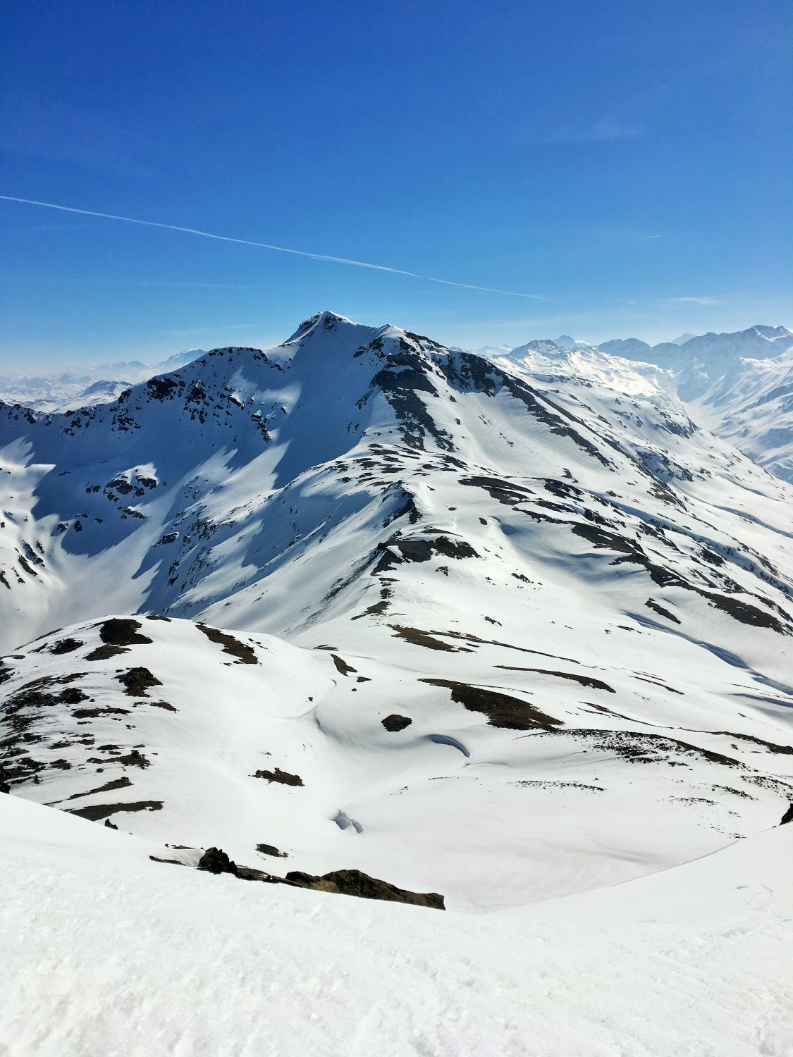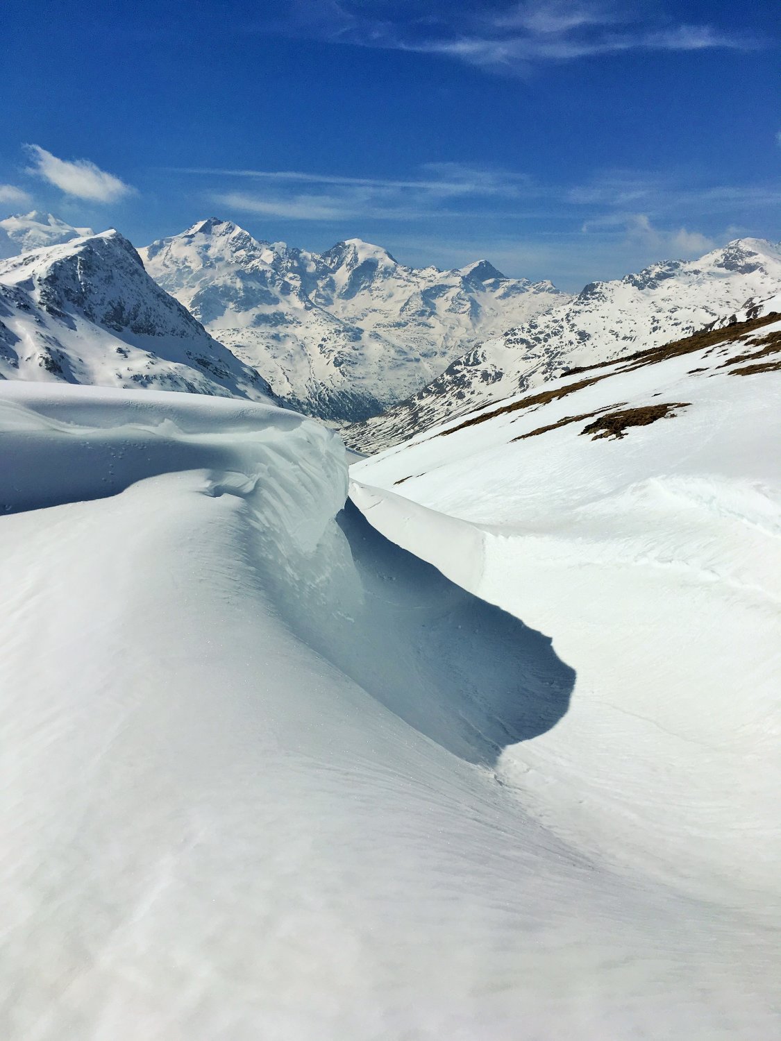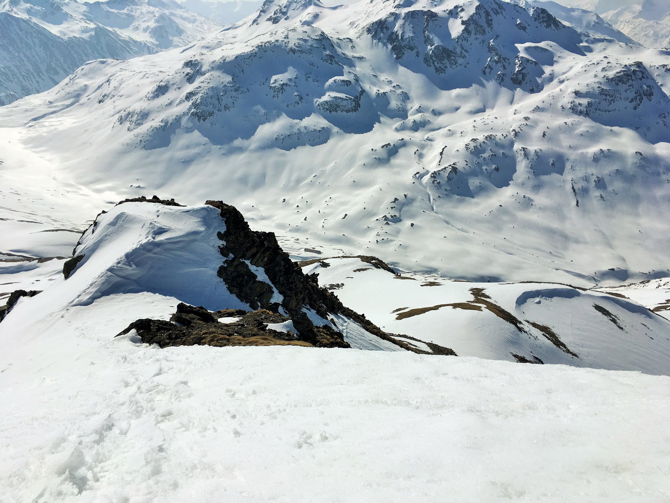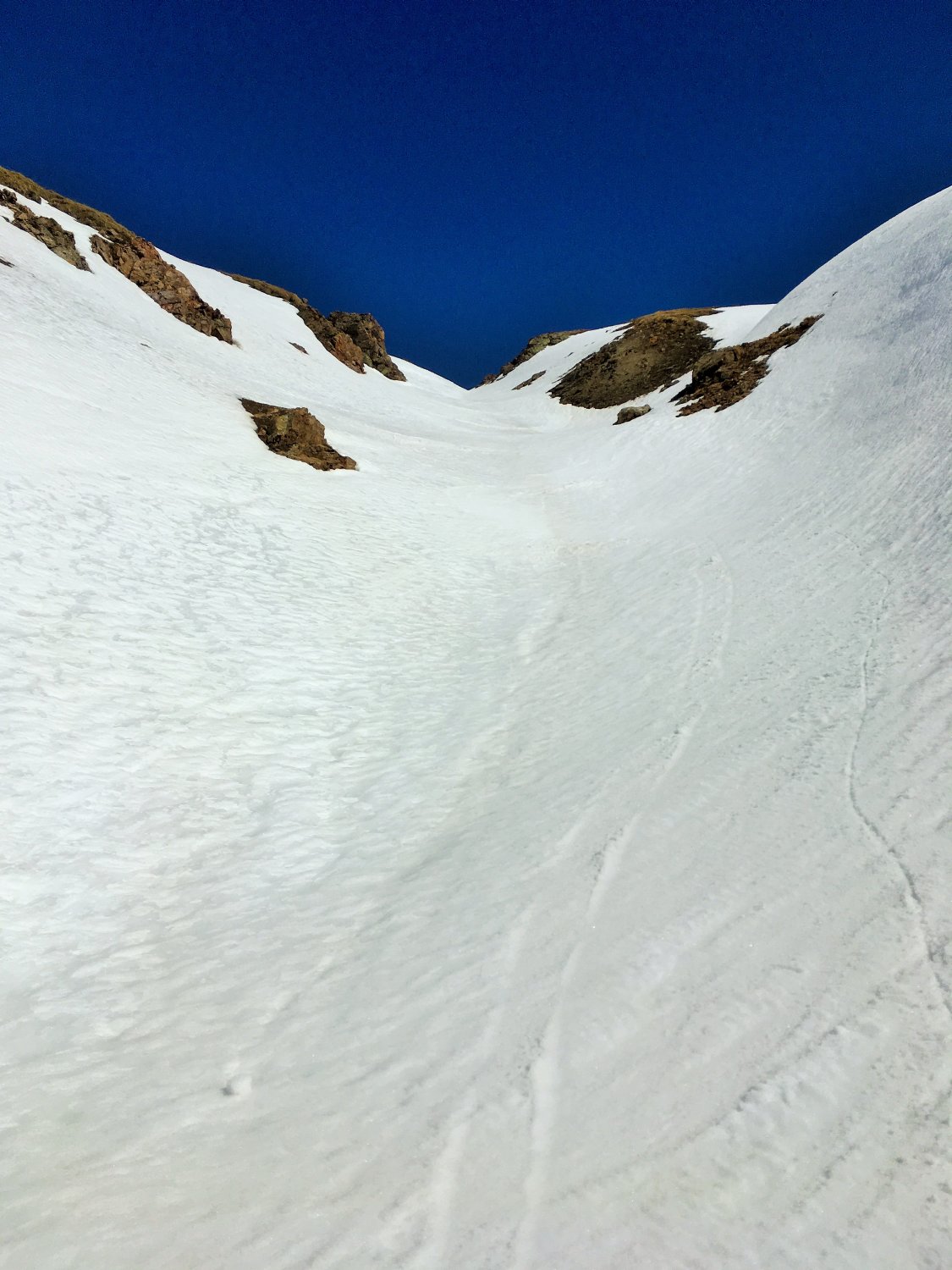 Perfekte Firnverhältnisse auf der ganzen Tour. Ich bin um 11 Uhr beim Skidepot abgefahren. Oberfläche perfekt weich auf der ganzen Abfahrt. Vor allem der obere Teil mit dem anfangs sanften Gelände und dann das schöne Südcouloir ein Genuss. Fast durchgehende Schneedecke im Val da Fain. Überrascht war ich von der gewaltigen Nassschneelawine mit Anrissstelle Val Tschüffer auf ca. 2400 m Höhe. Die Lawine muss in den letzten Tagen die Aufstiegsroute unterbrochen haben. Man muss die Skis tragen für Querung der Lawine, aber kein Problem.