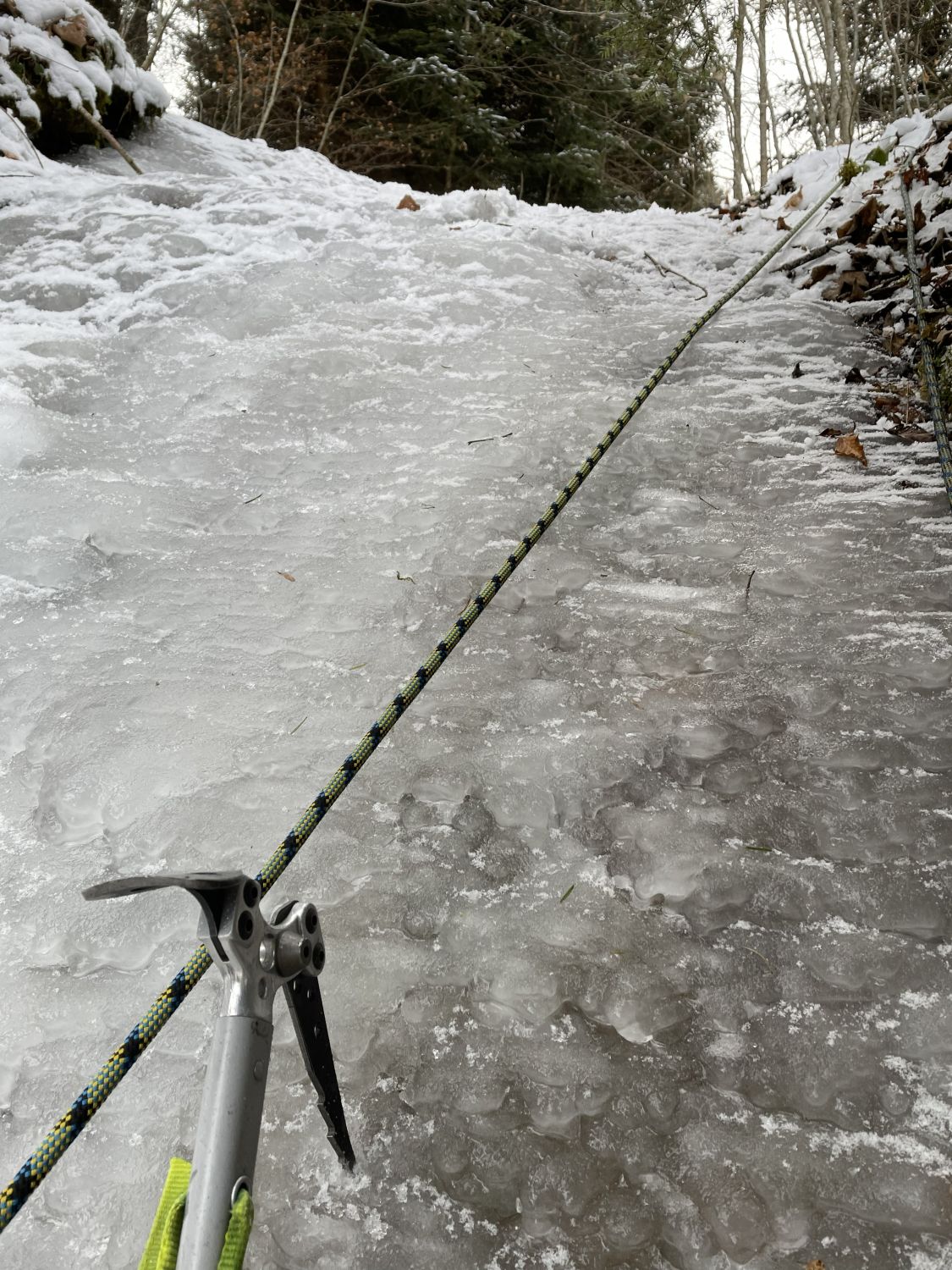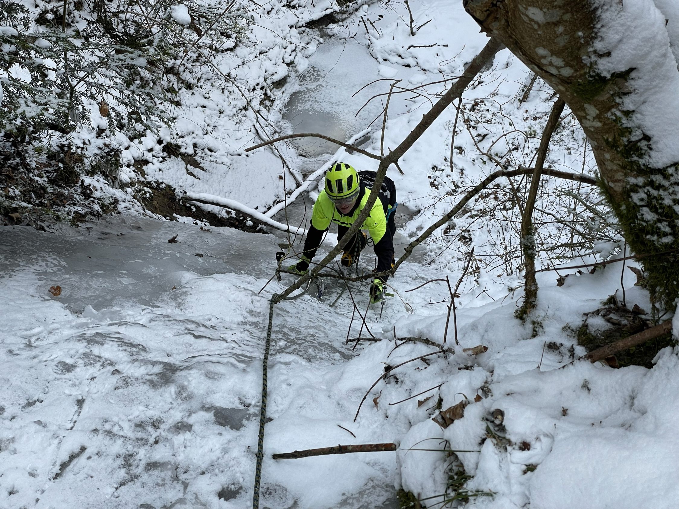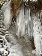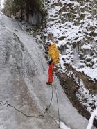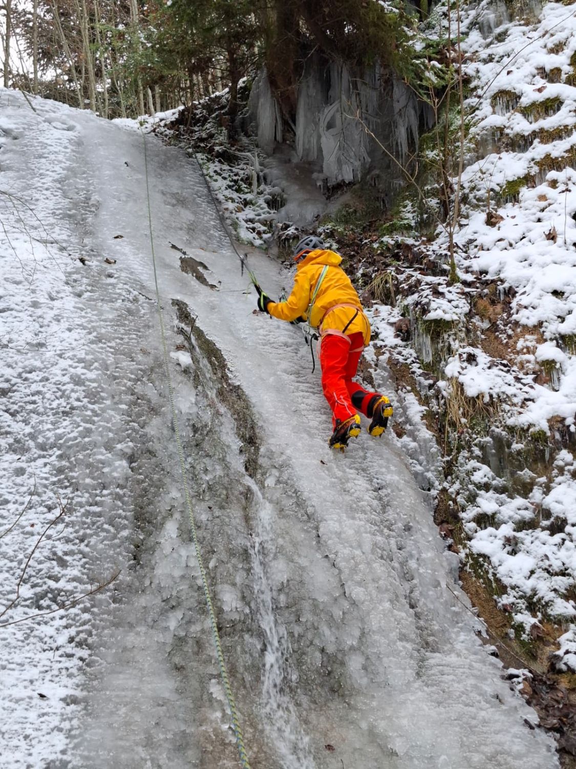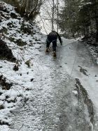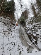 Leider hat nur der Hauptfall einigermassen Eis zum klettern. Jedoch auch dort in der Fallmitte ein Loch durch welches Wasser sprudelt. Heute noch knapp machbar.