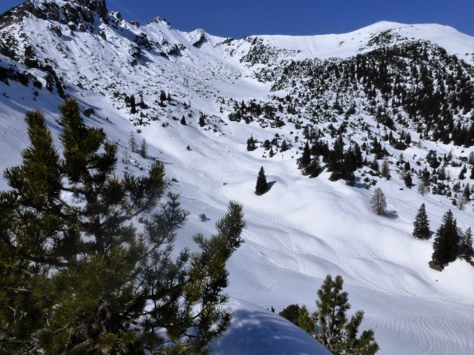 Wird sich bei den derzeitigen hohen Temperaturen rasch verschlechtern. Wohl nicht mehr lange möglich. Ob die vorhergesagte Wetterverschlechterung Mitte der Woche wirklich genügend Schnee zwischen 1.200 - 1.800 m bringt, bleibt abzuwarten. Ansonsten sieht es dann dort in ca. 1 Woche wohl so aus, dass die Ski komplett bis zum Sassförkele getragen werden müssen. Auch am Gipfelhang des Schönberg schauen schon einige, wenige Grasnarben, die ab sehr gut umfahren werden können, raus.
