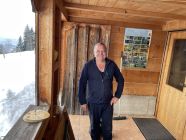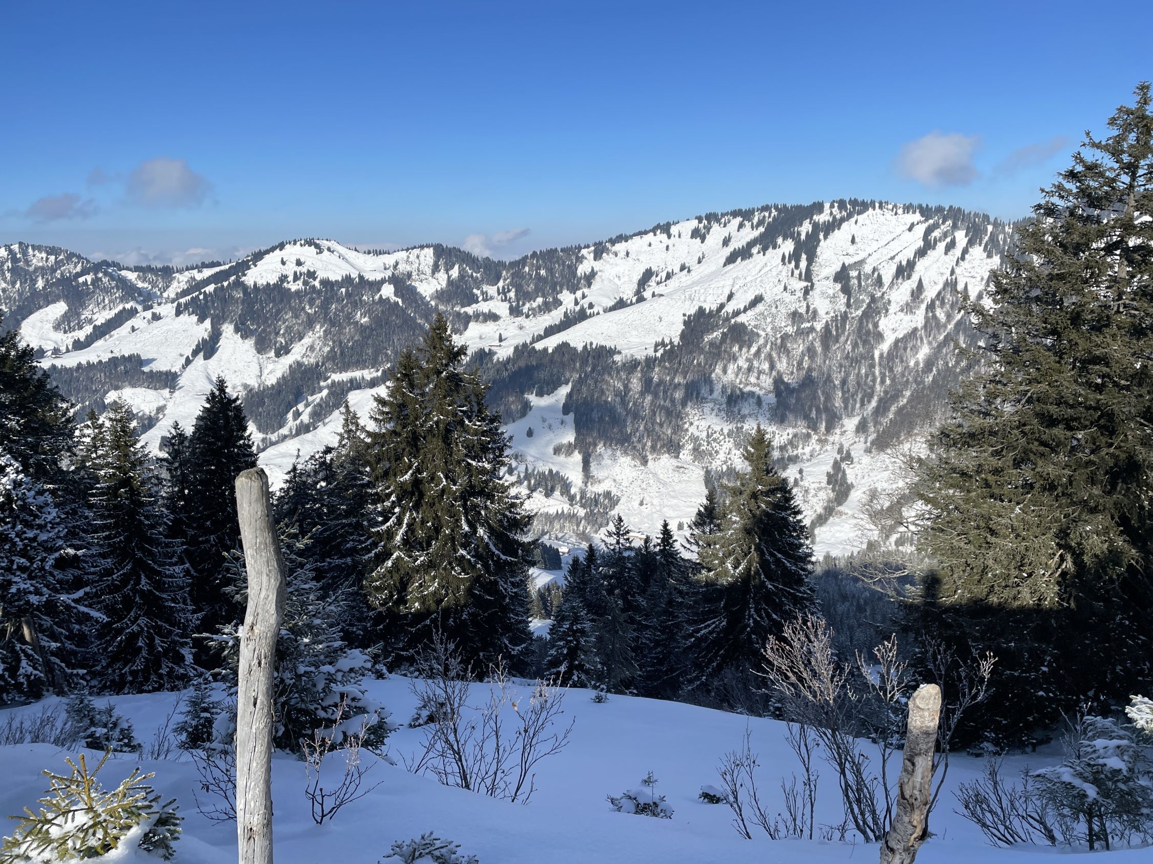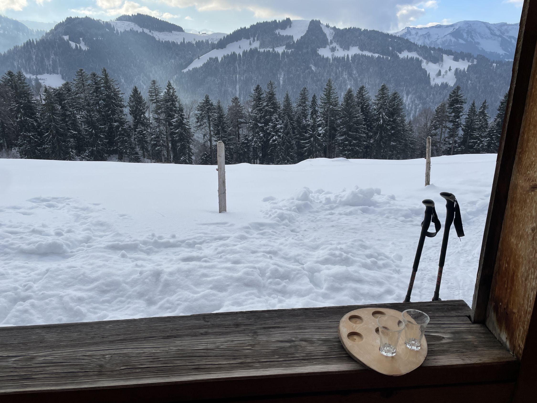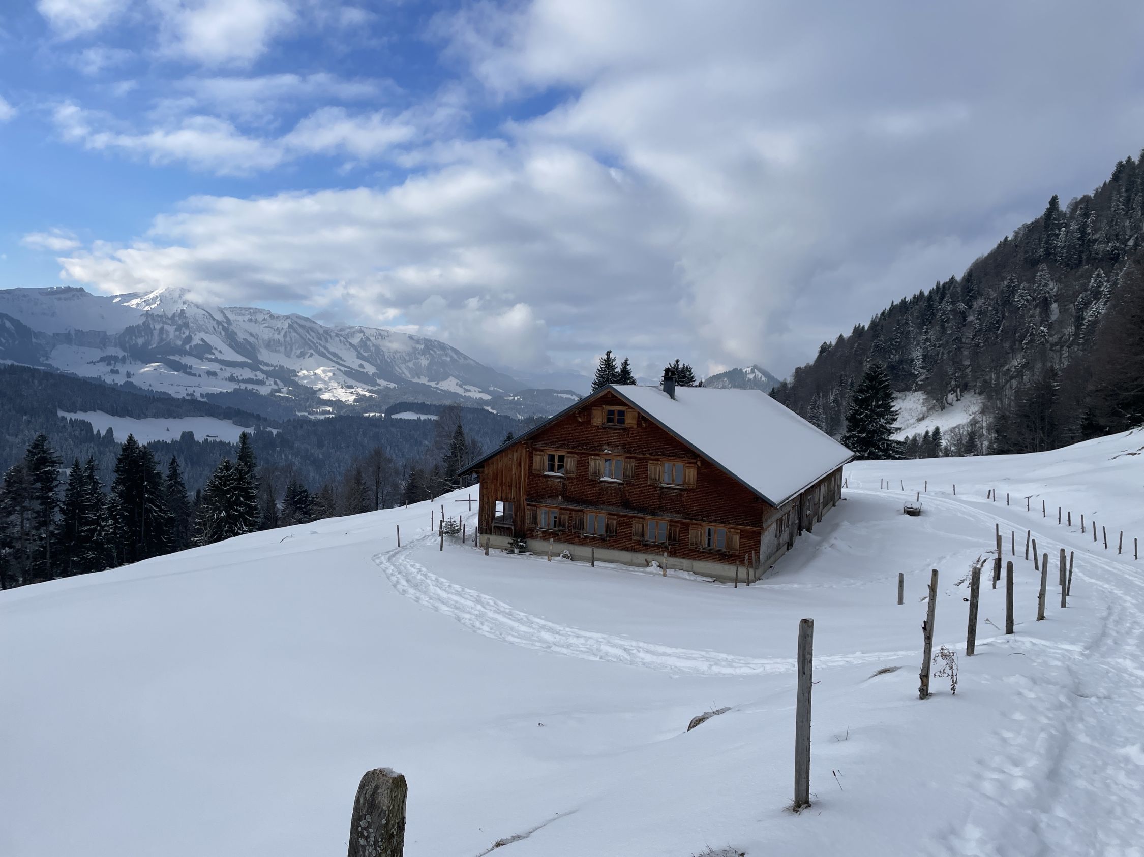 Ich habe niemanden auf der Tour angetroffen. Bis auf die Überraschung auf der Unteren Hobelalpe, als ich am Morgen dort aus dem Schornstein Rauch aufsteigen sah und vor der Veranda frische Fußspuren erblickte. Deren Pächter trat heraus und begrüßte mich. Als er mir ein Schnapserl anbot, konnte ich nicht Nein sagen. So kamen wir ins Gespräch. Er war seit 2 Wochen mit seiner Katze hier oben. Kämpft jedoch mit dem Problem eingefrorener Wasserquelle aufgrund des wenigen Schnees bei diesen Frosttemperaturen. Als ich ihm erzählte, dass ich irgendwie auf bayerischer Seite absteigen will, um eine Rundtour zu gestalten, erzählte er mir von der neuen Forststraße, die 2024 fertig gebaut wurde. Und von der neuen Samstenberg-Alpe. Das war interessant für mich. Ich schilderte ihm, dass ich wegen meinem OP-Bein nicht so steil absteigen kann. Da kam mir eine Lauferei über Forstwege recht. Nach dem zweiten Marille-Glas setzte ich gut gelaunt meine Tour fort. Danke an Wolfi aus Lustenau, der hier seit 15 Jahren die Gegend kennen gelernt hat !