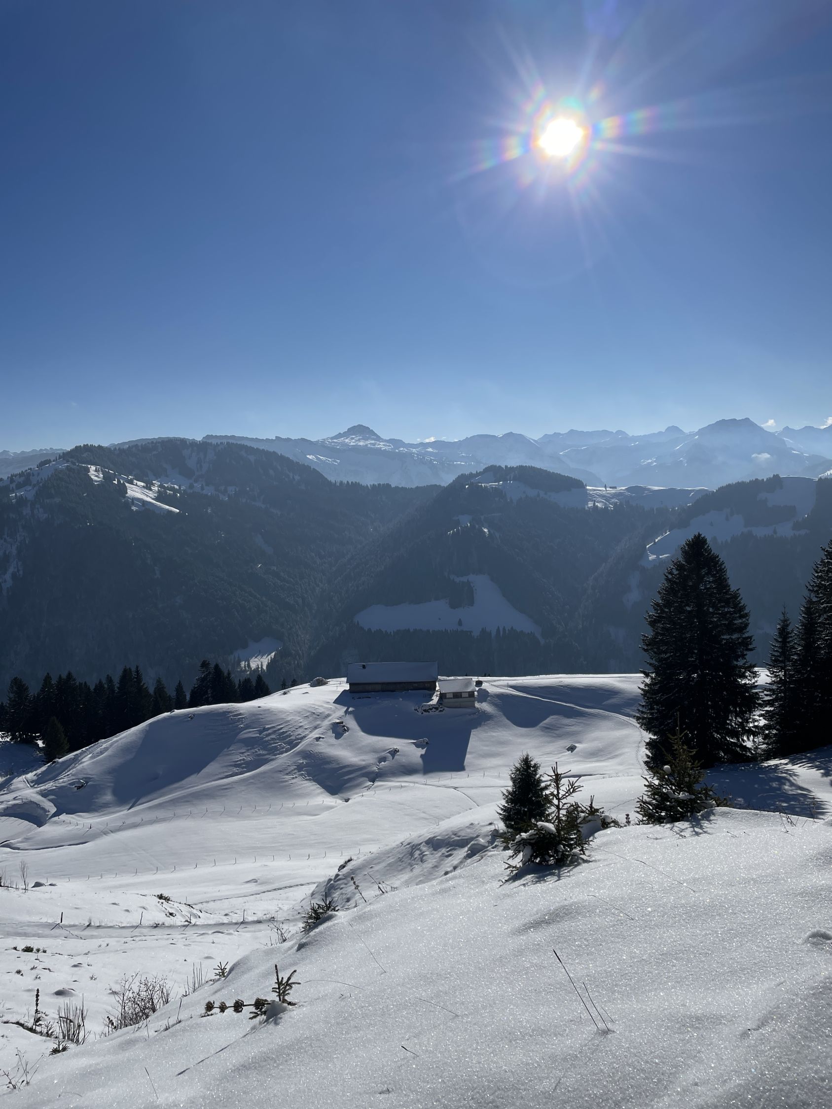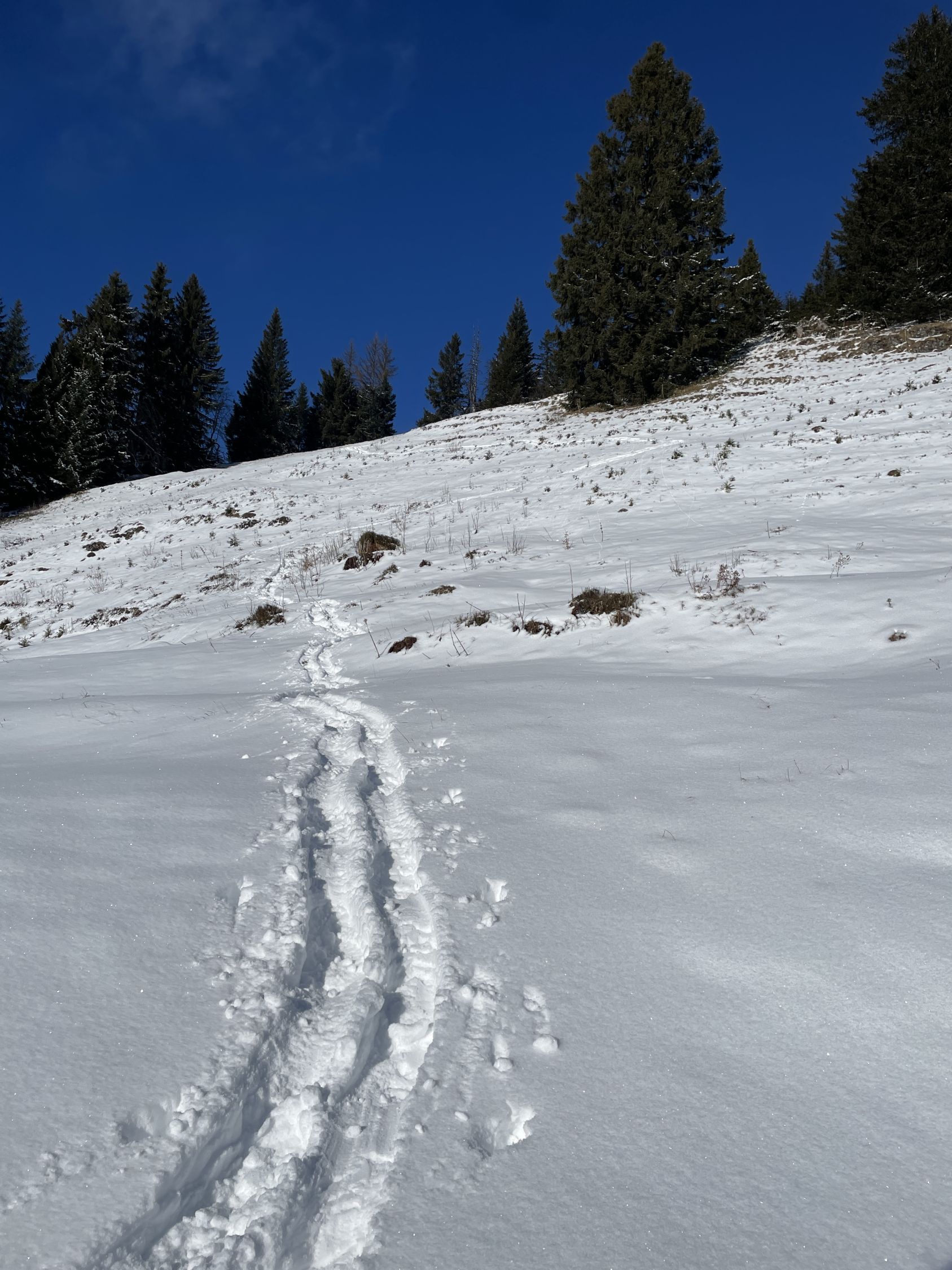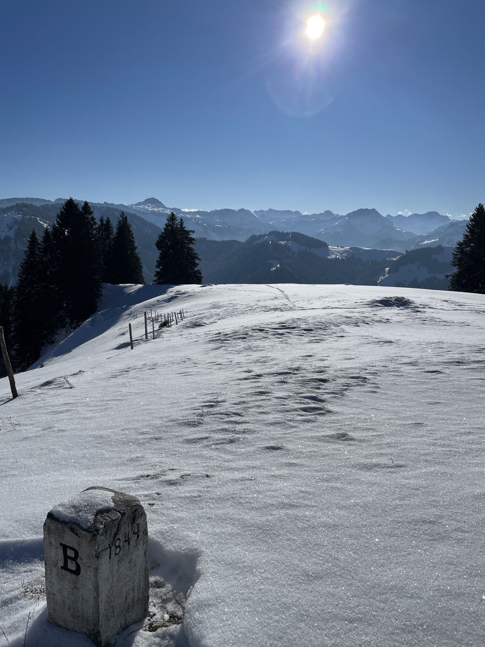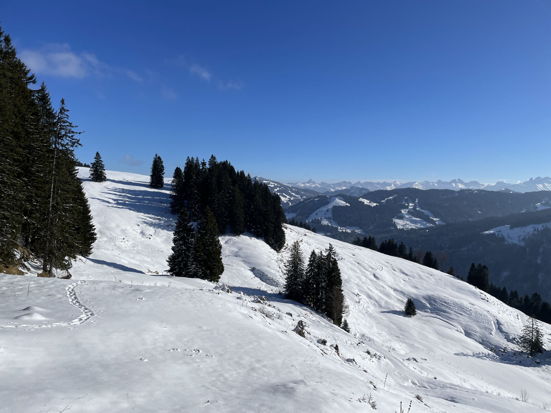Ich habe niemanden auf der Tour angetroffen. Bis auf die Überraschung auf der Unteren Hobelalpe, als ich am Morgen dort aus dem Schornstein Rauch aufsteigen sah und vor der Veranda frische Fußspuren erblickte. Deren Pächter trat heraus und begrüßte mich. Als er mir ein Schnapserl anbot, konnte ich nicht Nein sagen. So kamen wir ins Gespräch. Er war seit 2 Wochen mit seiner Katze hier oben. Kämpft jedoch mit dem Problem eingefrorener Wasserquelle aufgrund des wenigen Schnees bei diesen Frosttemperaturen. Als ich ihm erzählte, dass ich irgendwie auf bayerischer Seite absteigen will, um eine Rundtour zu gestalten, erzählte er mir von der neuen Forststraße, die 2024 fertig gebaut wurde. Und von der neuen Samstenberg-Alpe. Das war interessant für mich. Ich schilderte ihm, dass ich wegen meinem OP-Bein nicht so steil absteigen kann. Da kam mir eine Lauferei über Forstwege recht. Nach dem zweiten Marille-Glas setzte ich gut gelaunt meine Tour fort. Danke an Wolfi aus Lustenau, der hier seit 15 Jahren die Gegend kennen gelernt hat !