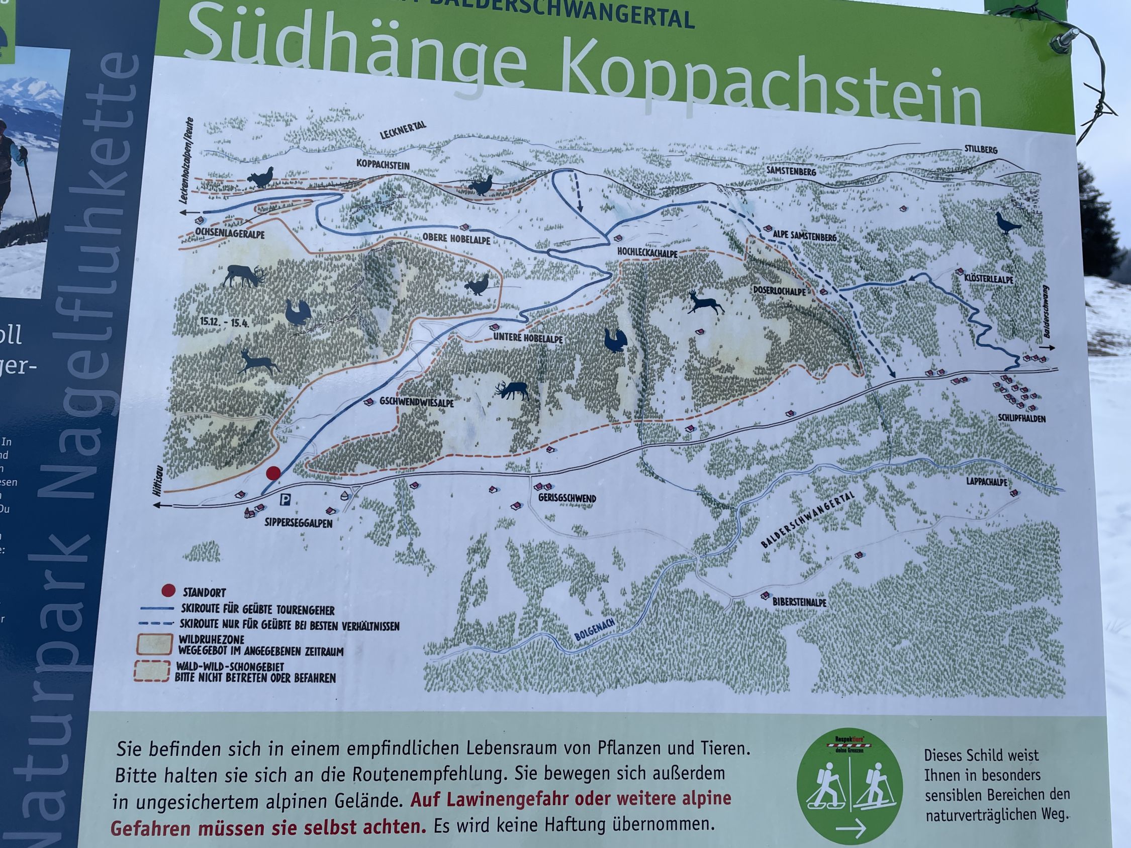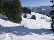 Ich erkannte 5 Skiauf- und abfahrtspuren über die Aufstiegsroute. Außerdem sah ich eine SS-Spur, welcher ich mehr, oder weniger hinauf zur Hochleckachalpe folgte. Die Spur bog jedoch rechts ab zum neuen Wegweiser an neuer Forststraße zur Samstenbergalpe auf bayerischer Seite. Auf der Mark und nördlich vom Grenzstein Nr. 207 traf ich im Abstieg wieder auf diese in Aufstieg gezeichnete Spur, der ich hinab folgte, jedoch mit Abstecher zur neuen Samstenbergalpe. Auf dem neuen Forstweg war unterhalb vom neuen Wegweiser zur Hochleckachalpe niemand unterwegs gewesen. Erst vor dem Abzweig zur Klösteralpe traf ich auf eine frische Scooterspur.