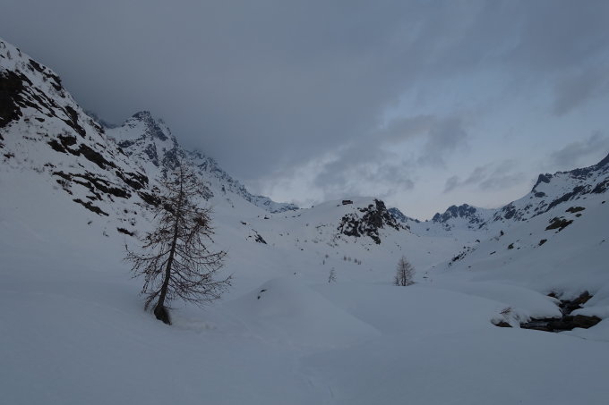 Die Waldstrasse zum Parkplatz bei Brücke Pkt.1365 vor Piumogna ist schnee/eisfrei. Anschliessend Ski tragen auf aperem Waldweg bis auf 1600m. Von da geschlossene Schneedecke. Es hat noch viel Schnee. Man kann auch auf der Piumogna Ebene mit Felle bis Prati Gera aufsteigen, danach kürzer Skis tragen. In der Ebene hat es genügend Schnee.