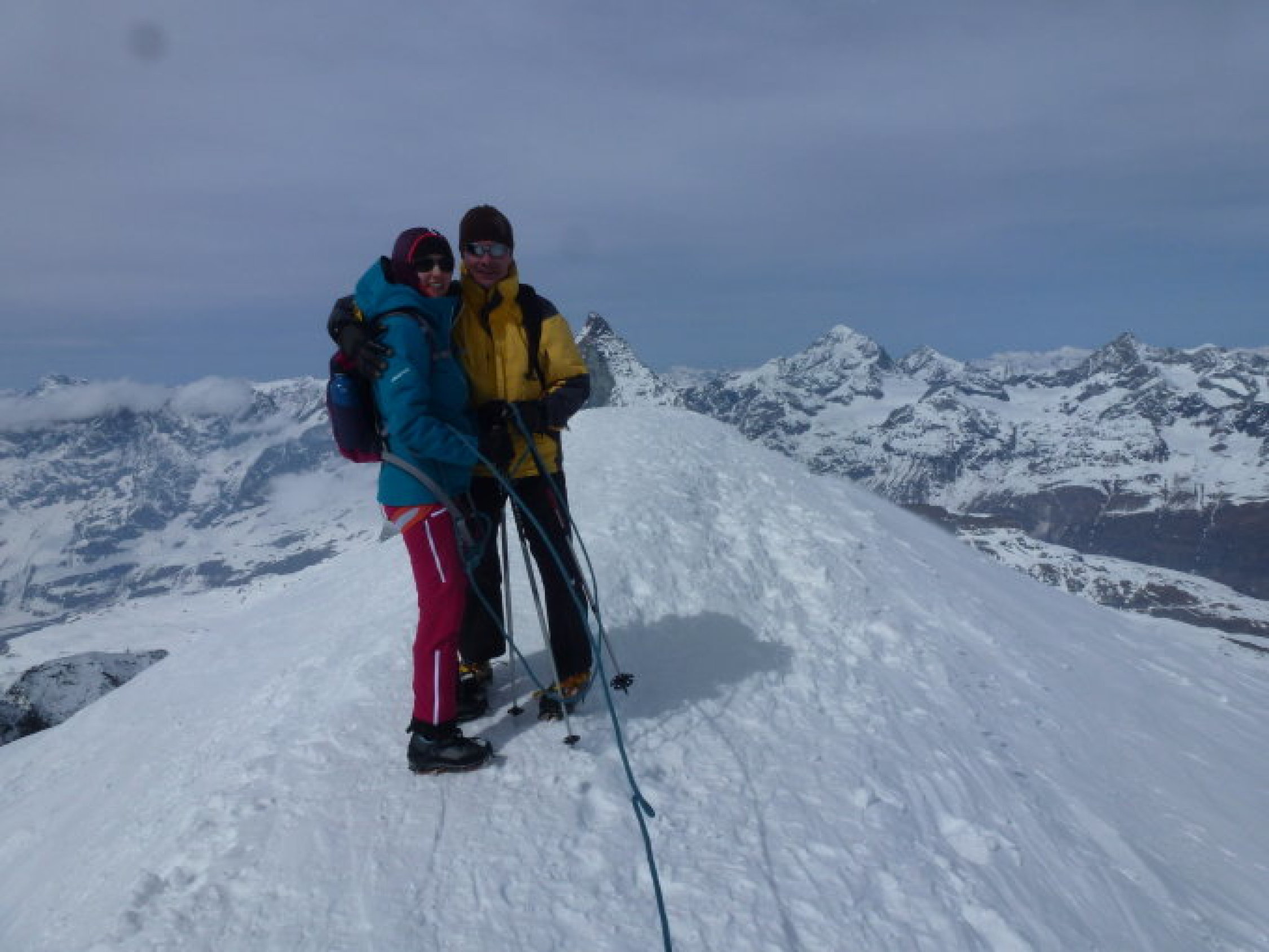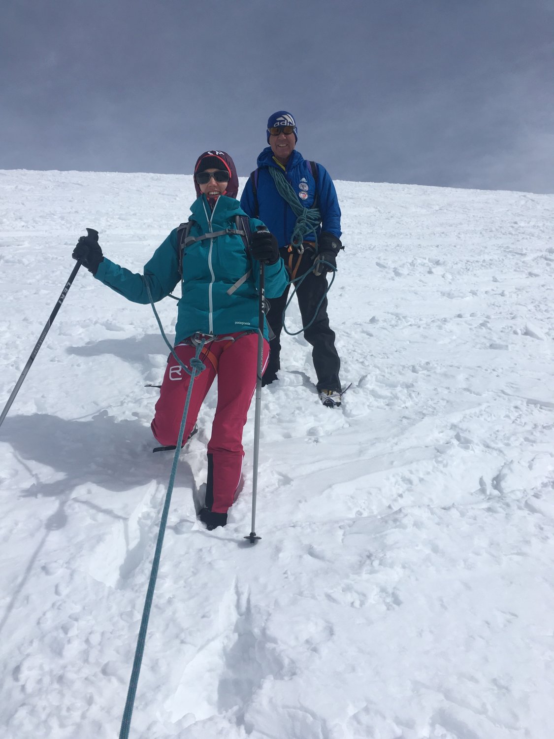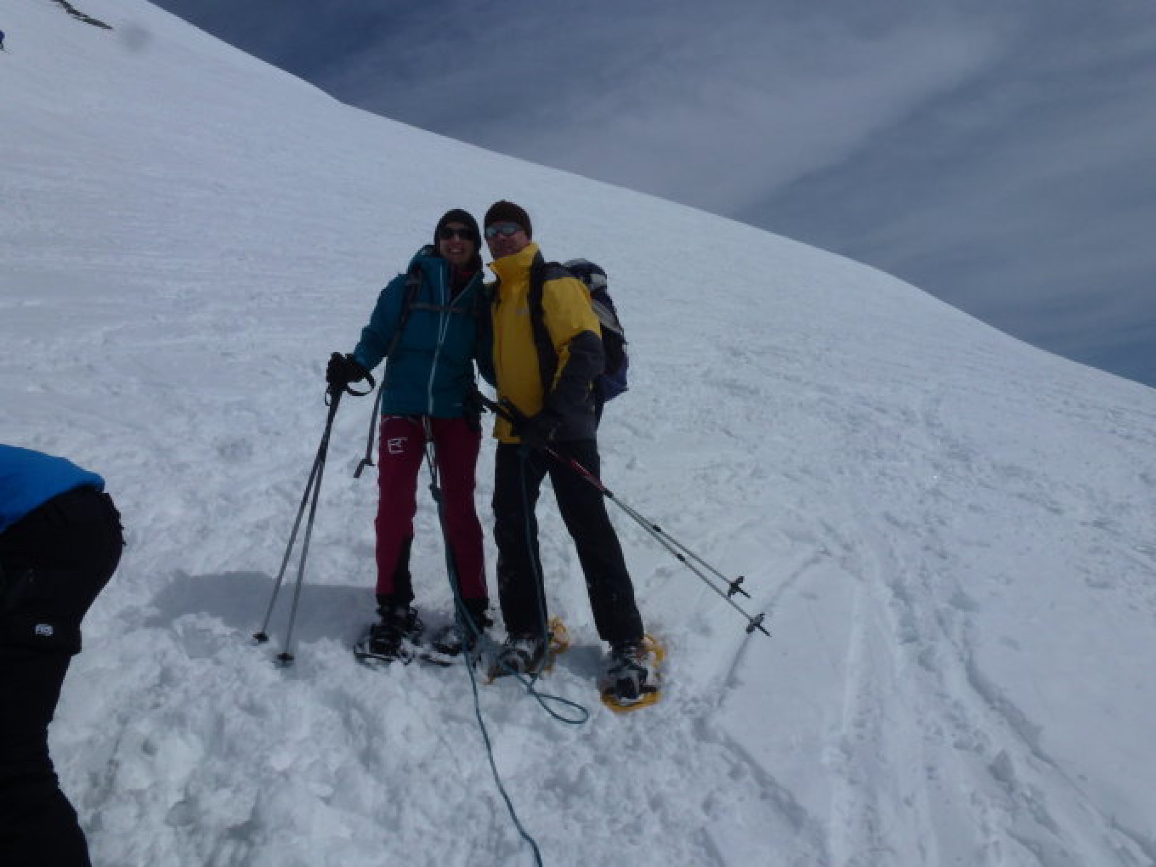 Mit den Schneeschuhen bis zum Bergschrund. Dann mit den Steigeisen zum Gipfel. Die Spur von den Skitourengehern hat gut getragen. Im oberen Teil zum Teil Blankeis unter dem Neuschnee.