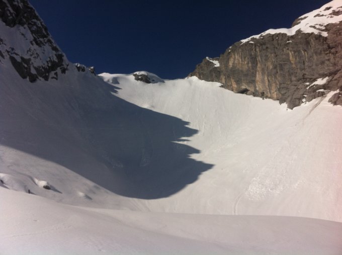 Ab 1500m Top-Frühlingsverhältnisse. Unten kein Schnee mehr, also laufen oder mit dem Auto ein Stück hoch fahren (Fahrticket kaufen am Automat). Die oberen Osthänge auf der Spillgerten haben zuerst Sonne, Abfahrt frühestens 10h, vorher ist es noch zu hart. Abfahrt vom Rothorn ca.11.30h ideal.