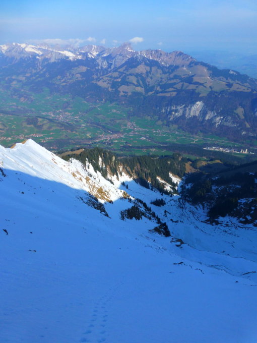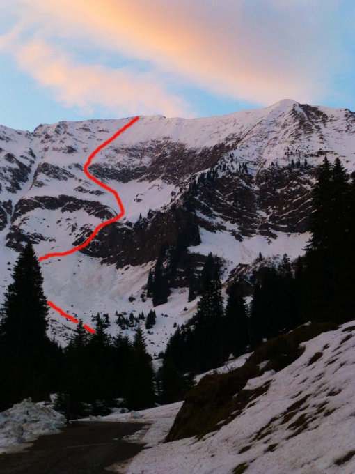 Bei leichtem Föhn mild und zunehmend bewölkt. Schnee ab 1440m (obere Strasse), unterhalb Geeri faul, im Geeri angefroren und Sulz, in der N-Flanke im Aufstieg Trittschnee, bei der Abfahrt harte Streifen ohne Grip neben griffigen mit z.T. angefrorenem Sulz. Ich bin wegen zuoberst schlechtem Grip und Nebel vom N-Gipfel 15Hm zu Fuss abgestiegen und 35Hm mit dem Eisgerät abgerutscht, ab 2350m dann abgefahren, kaum Steinkontakte. In der Mulde und im oberen Geeri mehrere ältere, z.T. grosse Lawinenkegel.