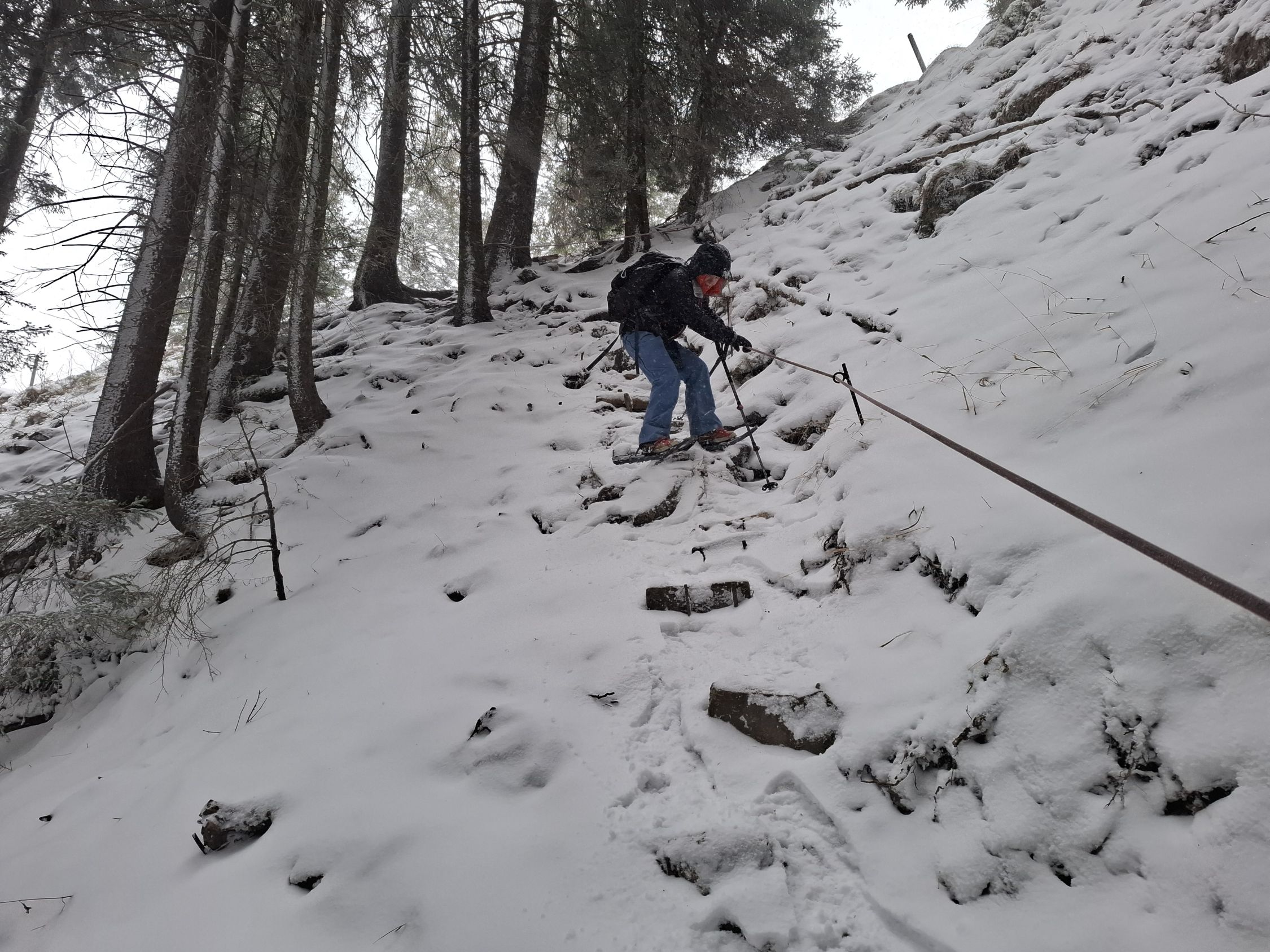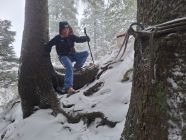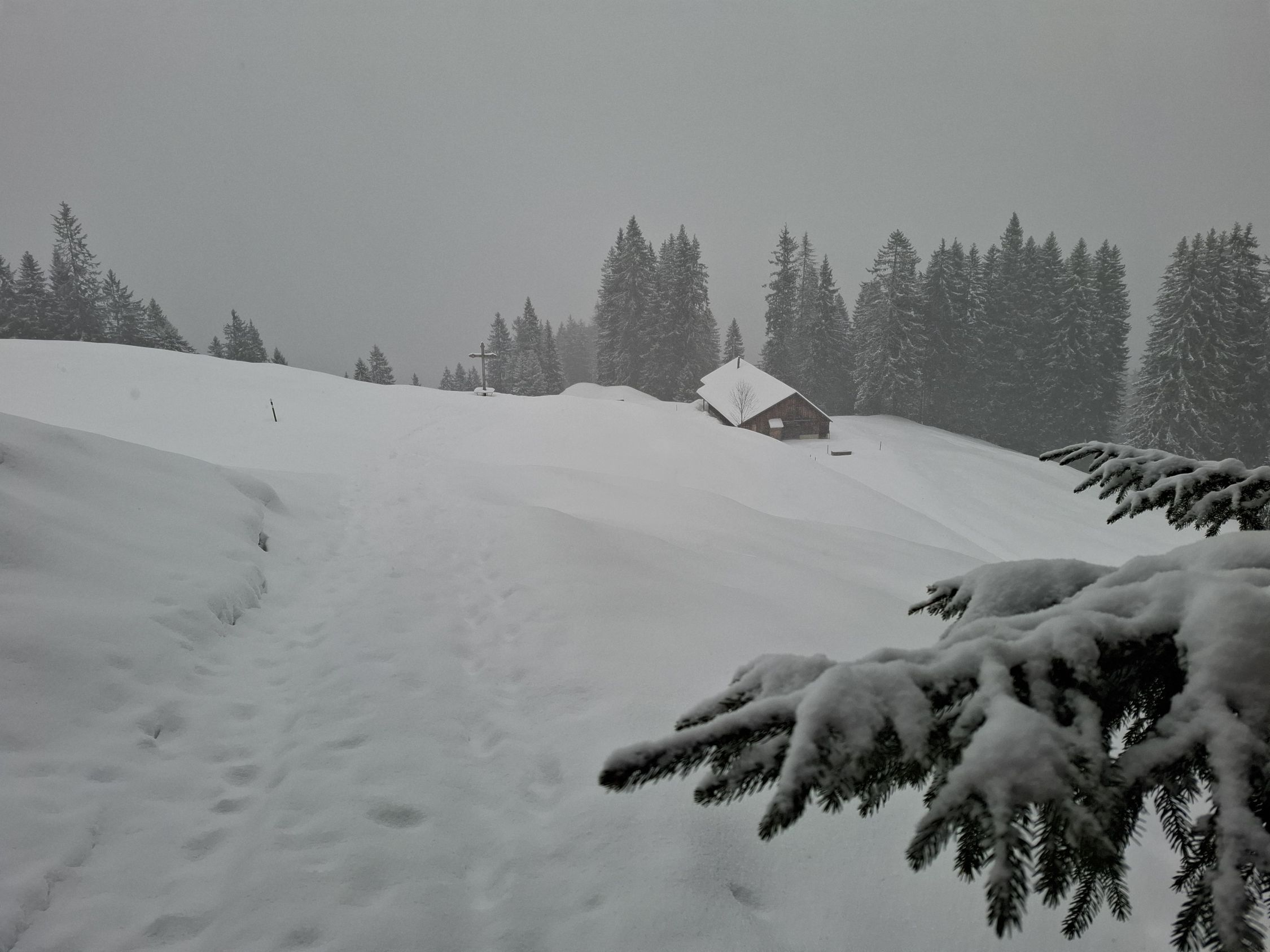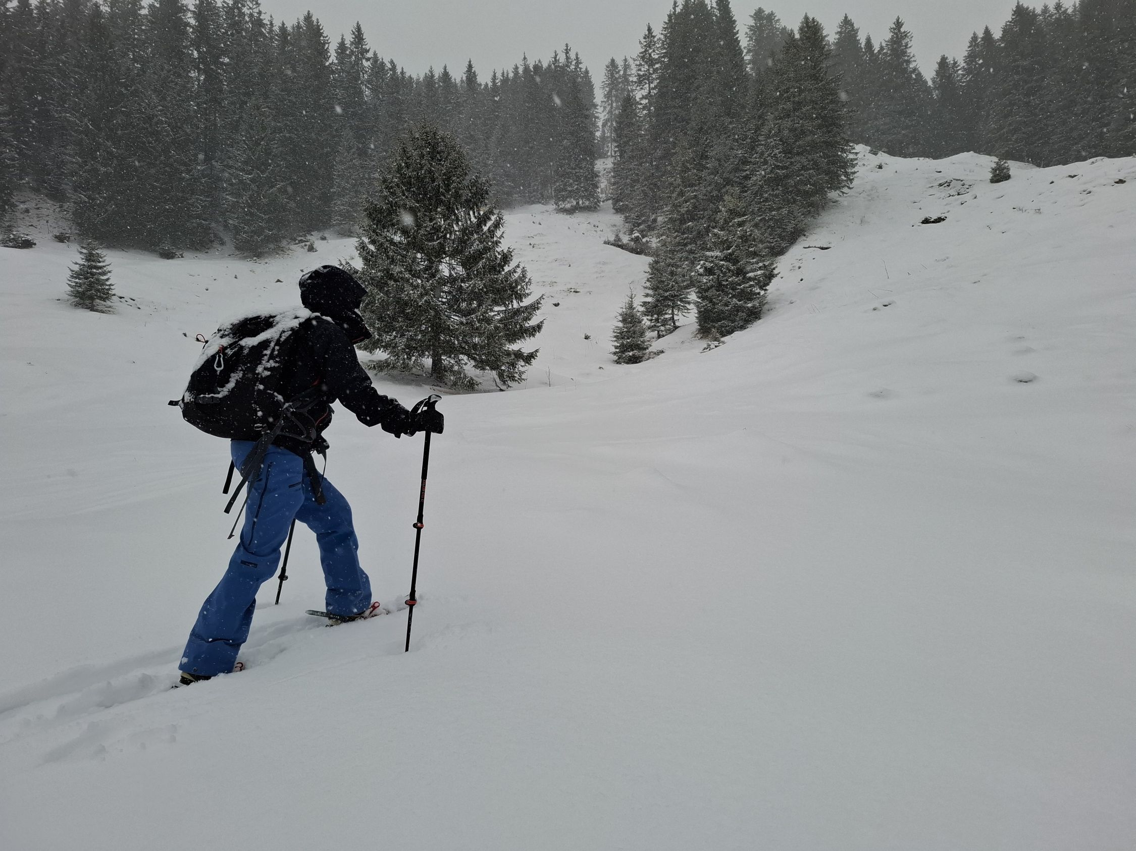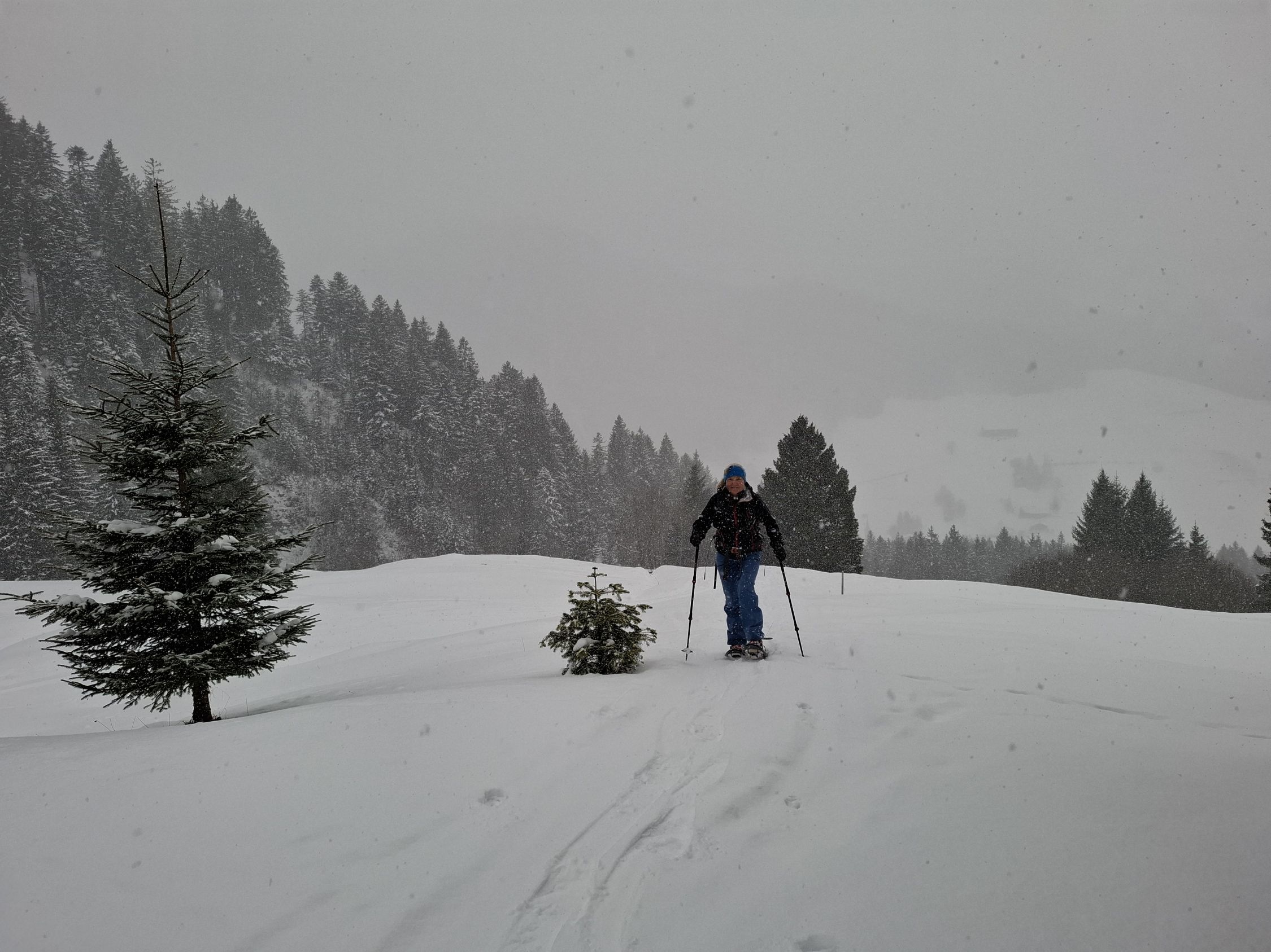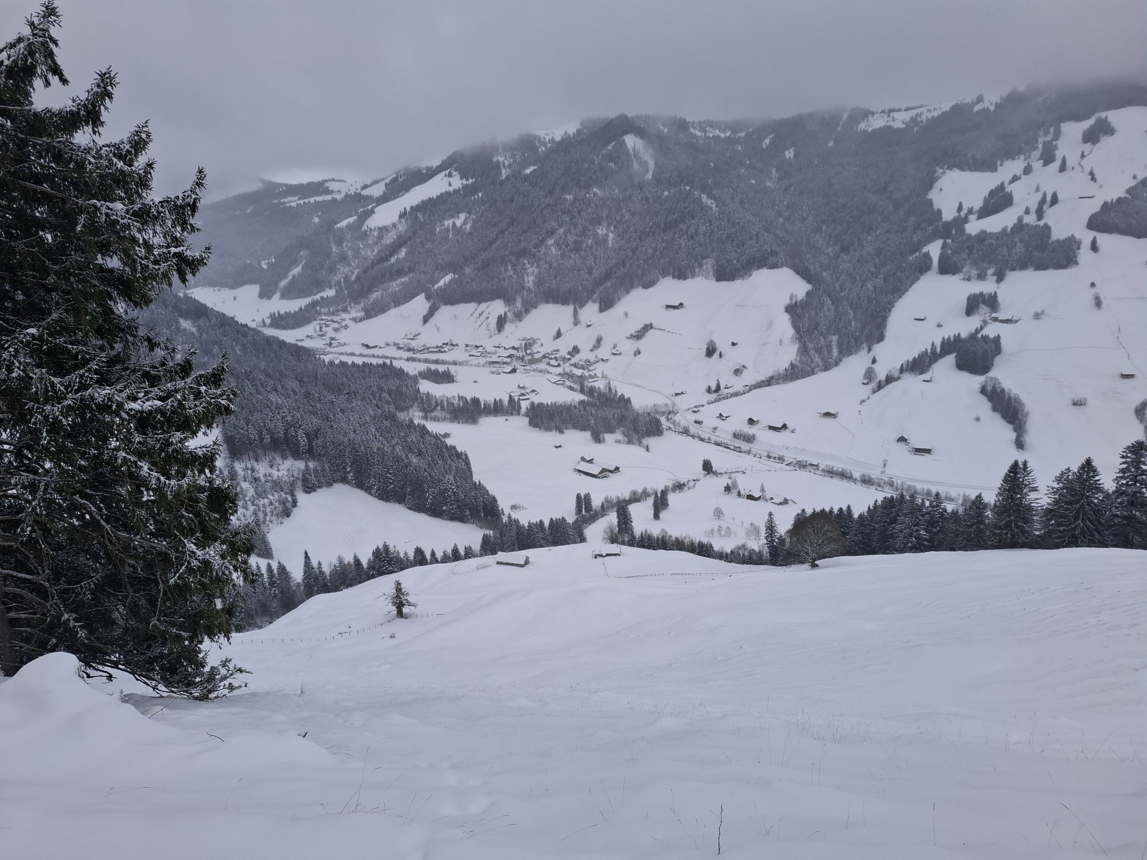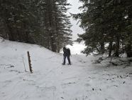 wie zu erwarten, herrschte leichter Schneefall. Unten deckte der Schnee gerade mal so den Boden. Auf den Weiden vom Unteren Buzli waren ca. 10 cm Neuschnee auf einer Unterlage. In der Waldschneise nach dem Buzitobel war wieder weniger Schnee (für Schneeschuhe gut, für Ski eher zu wenig). In den steilen Hängen der Gämsch waren nur Schneeverwehungen an dem Strässchen, ansonsten war in den Hänge wenig Schnee.