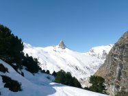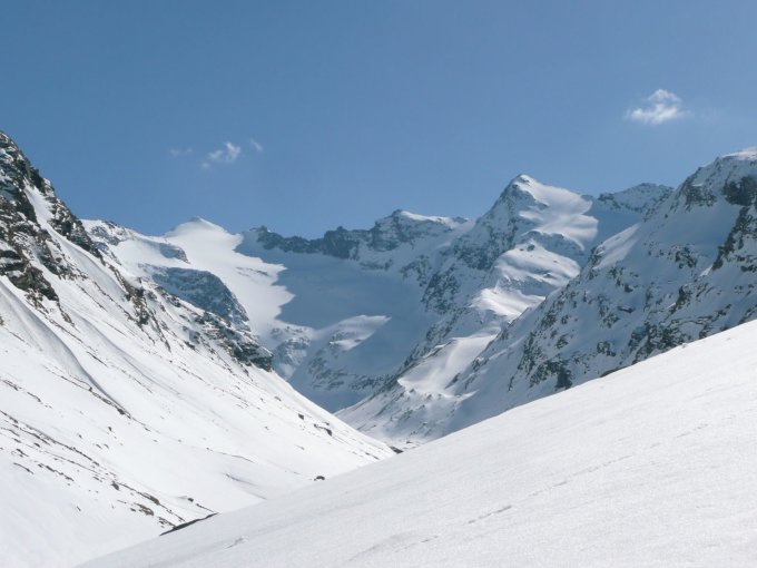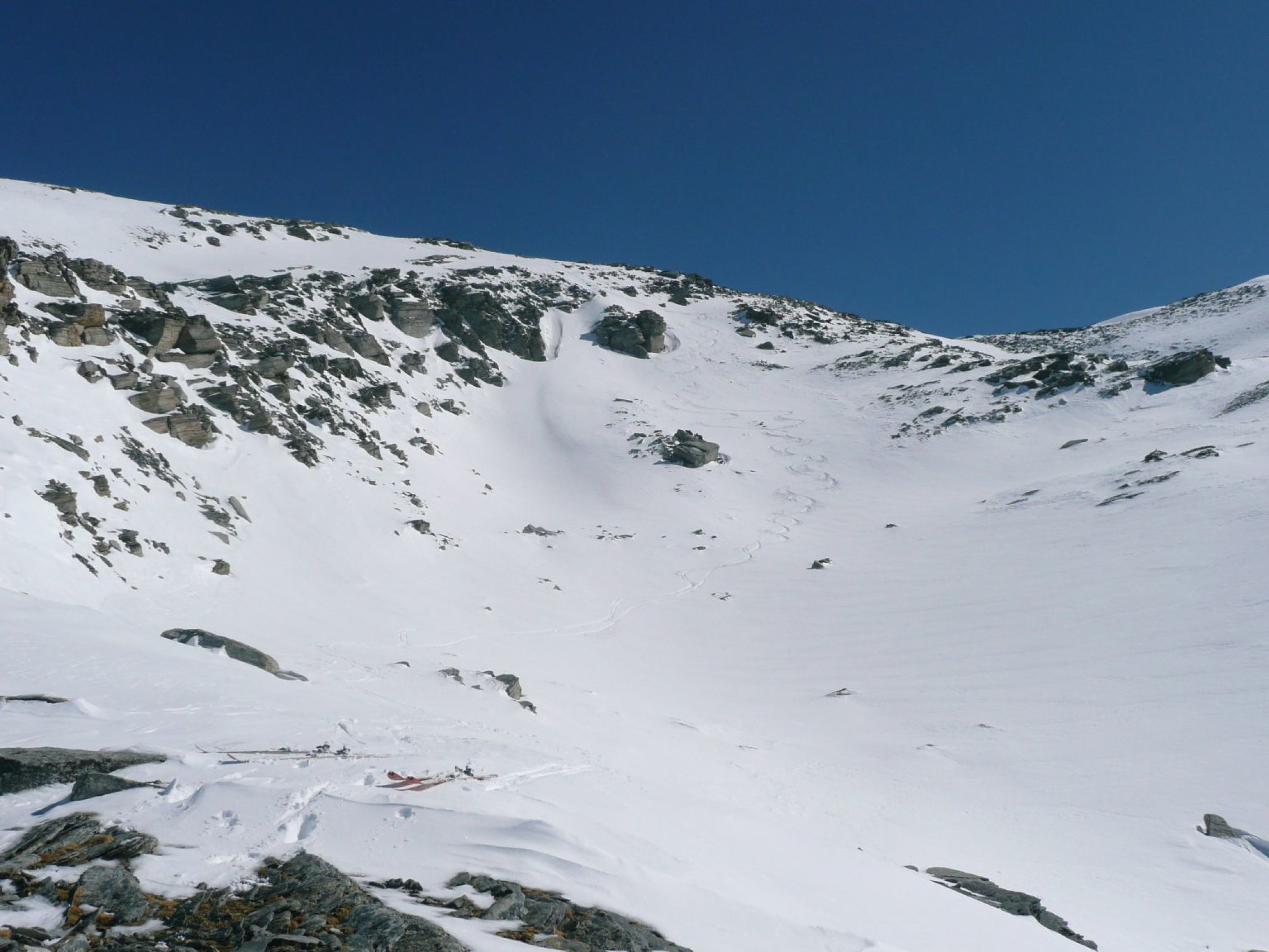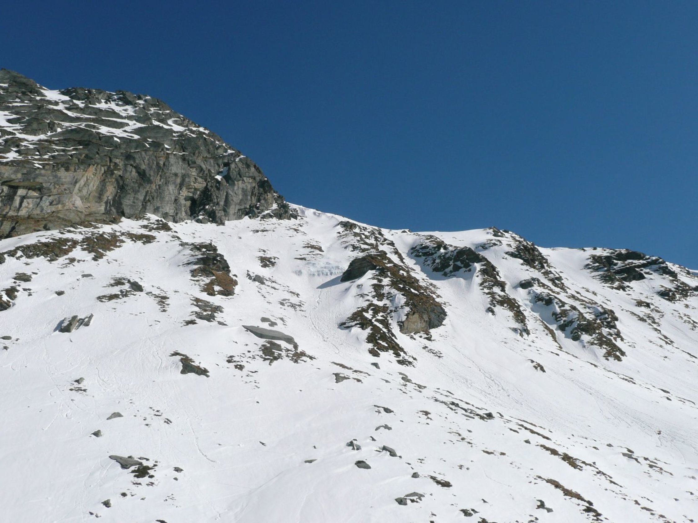 Für die Abfahrt haben wir uns vom Gipfel nach W orientiert, sind dann aber etwas zu früh abgefahren und mussten uns - auch wegen der nicht so hohen Schneelage - ein bisschen heruntermogeln. Besser gewesen wäre, bis nahezu zu Pkt. 3023 zu queren und dann einen schöneren Hang runter bis unter Pkt. 2768 und in der Verlängerung weiter bevor dann unter Pkt. 2610 nach links abgebogen wird.