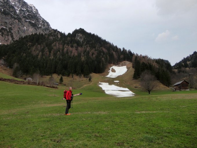 Aufstieg in´s Zalimtal auf Pistenresten noch ganz gut machbar; anfänglich 2 x 5 Minuten tragen, dann (noch) durchgehend Schnee. Weiter oben gute Schneelage, Fußaufstieg zum Gipfel in Trittschnee.