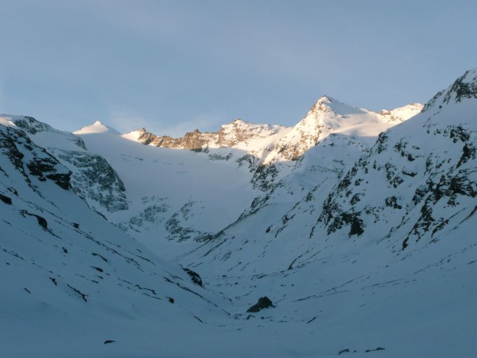 Gegen 7:30 von der Läntahütte weg. Nach einer guten Stunde im unteren Gletscherbecken. Aufstieg durch einen steilen, dann schmalen Zugang auf den rechten Gletscherbereich, kurz mit Ski am Rucksack. Dann im windgepressten, pulvrigen Schnee mit Ski bis zum Gipfel (ca. 11:00). Immernoch Kaiserwetter mit einer Traum-Fernsicht! Abfahrt gegen 12:30 zur Zapporthütte. Gipfelhang Pulver, dann im großen Osthang unter den Felsen mit Deckel bzw. noch nicht aufgefirnt. Darum ganz nach N gequert und in zunehmend aufgefirnten Hängen bis in den Talgrund (ein Traum!). Weiterer Weg zur Hütte dann schon sehr weich.
