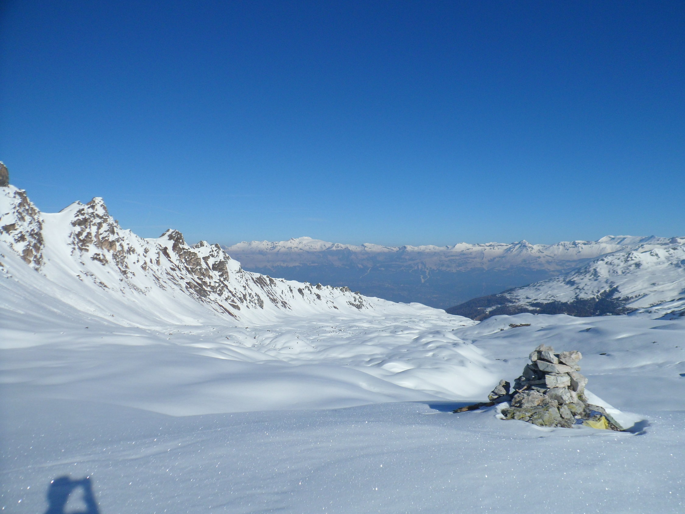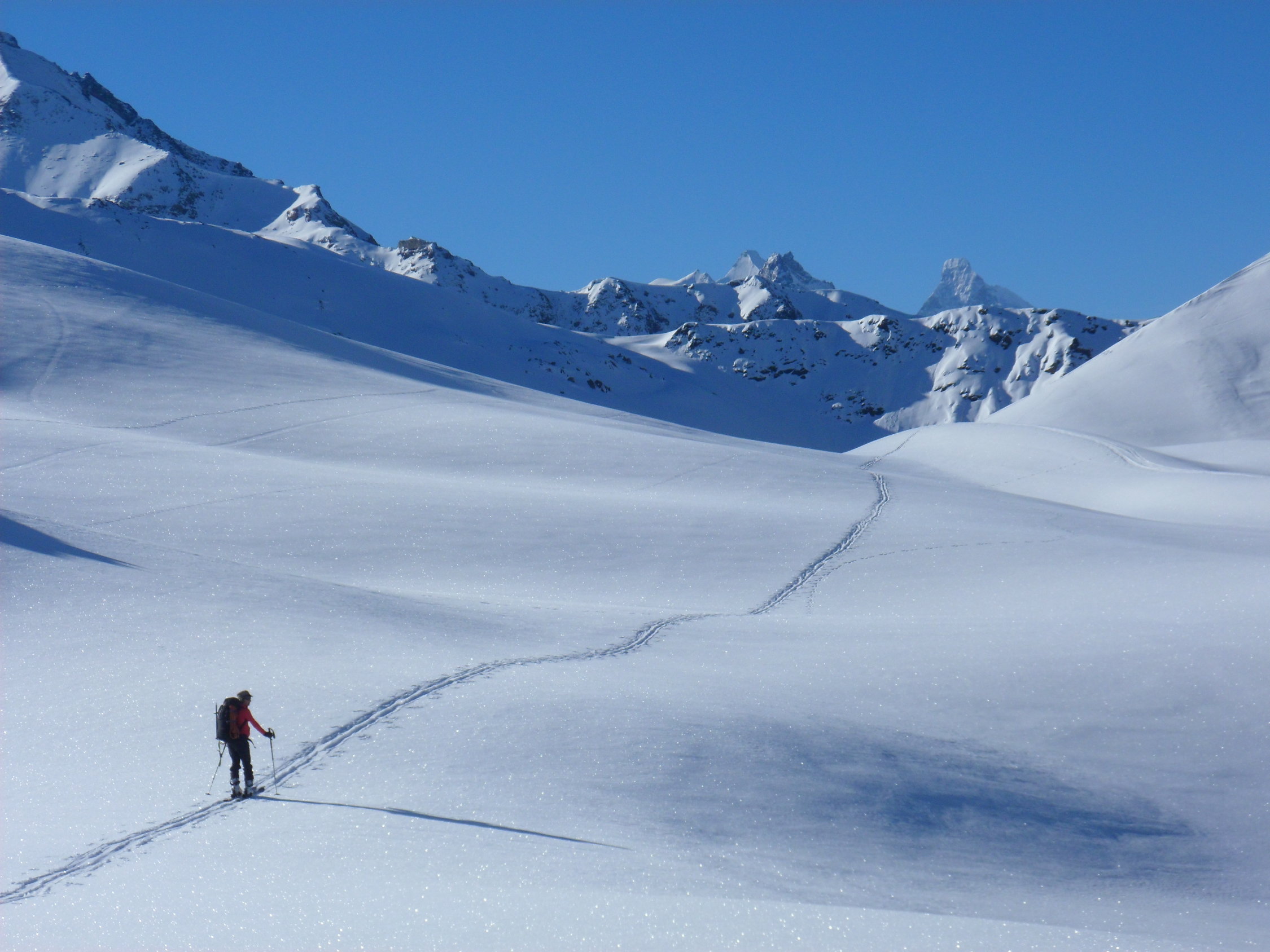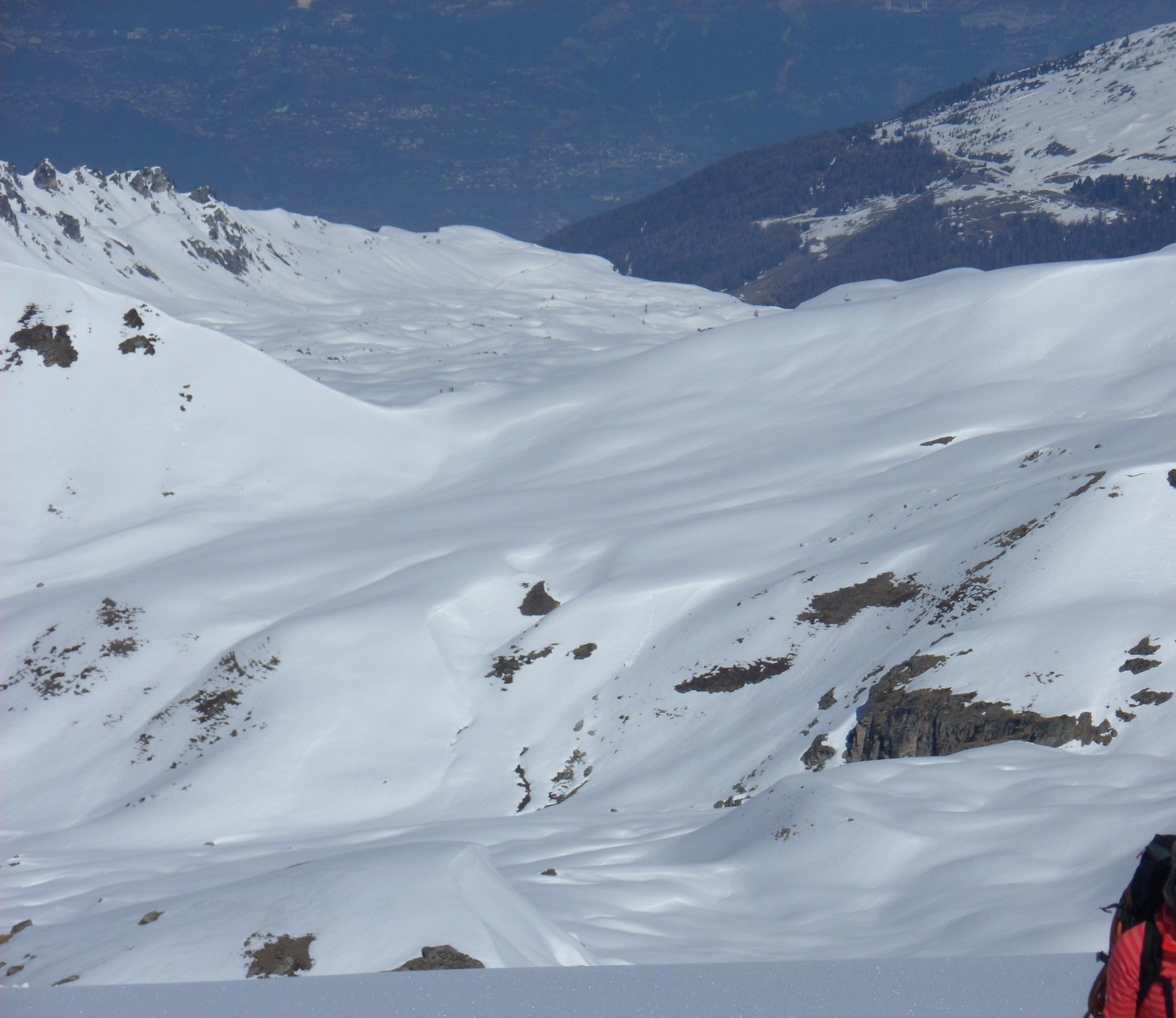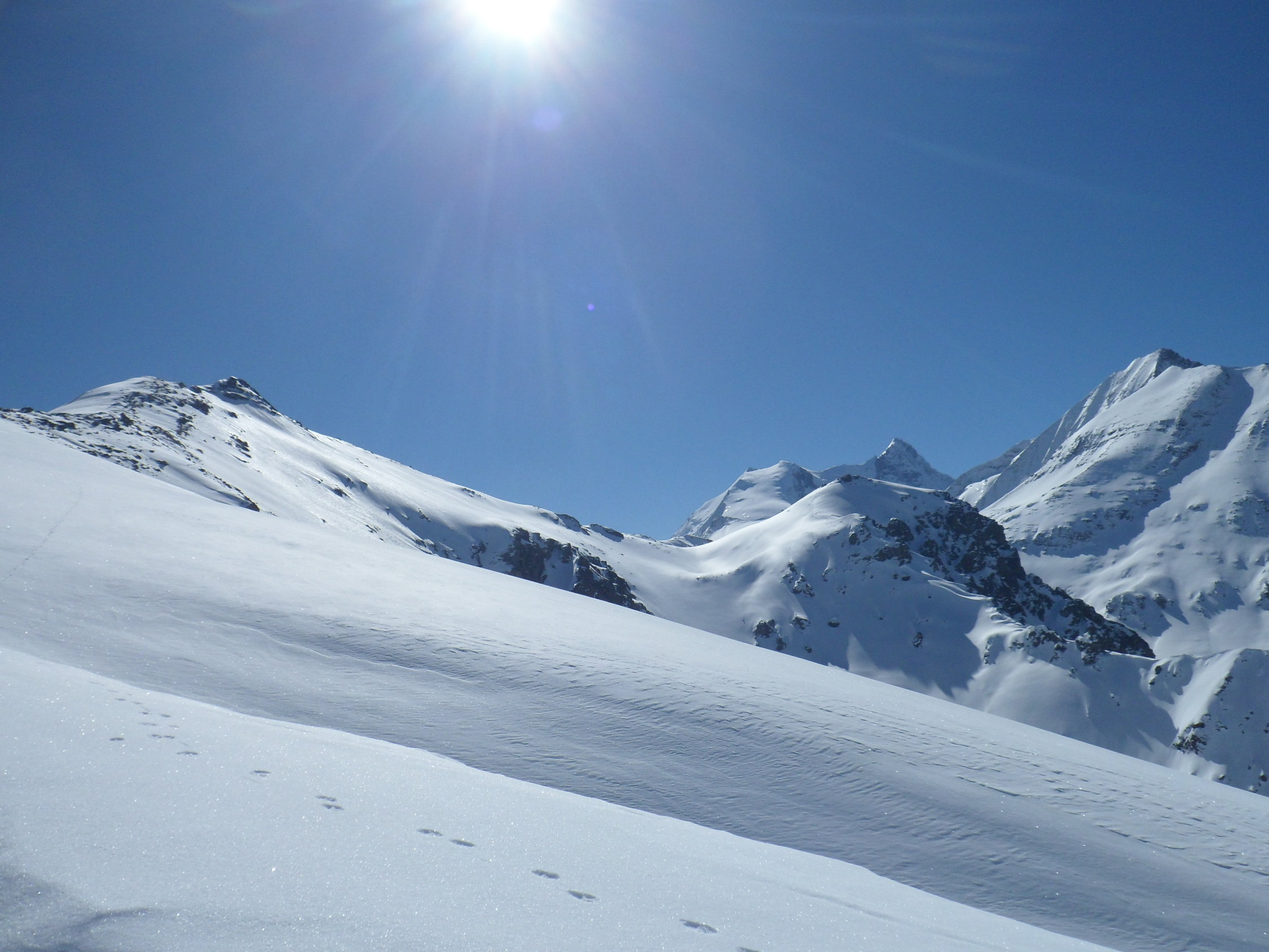 Hotel Weisshorn - L'omen roso - Turtmann-Hütte Vom Hotel Weisshorn zur Bella Vouarda - über Punkt 2609 und Punkt 3031 zum Col de l'Omen Roso. Abstecher auf den Gipfel. Abfahrt in der Fallinie zum Stausee. Die beste Linie ist nicht ganz einfach zu finden. Im oberen Teil des finalen Steilhangs unterhalb Friliwäng muss mann etwas rechts halten und dann wieder nach links.