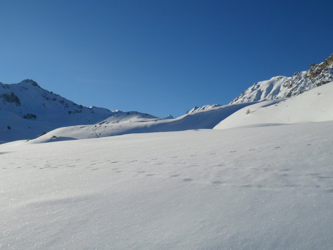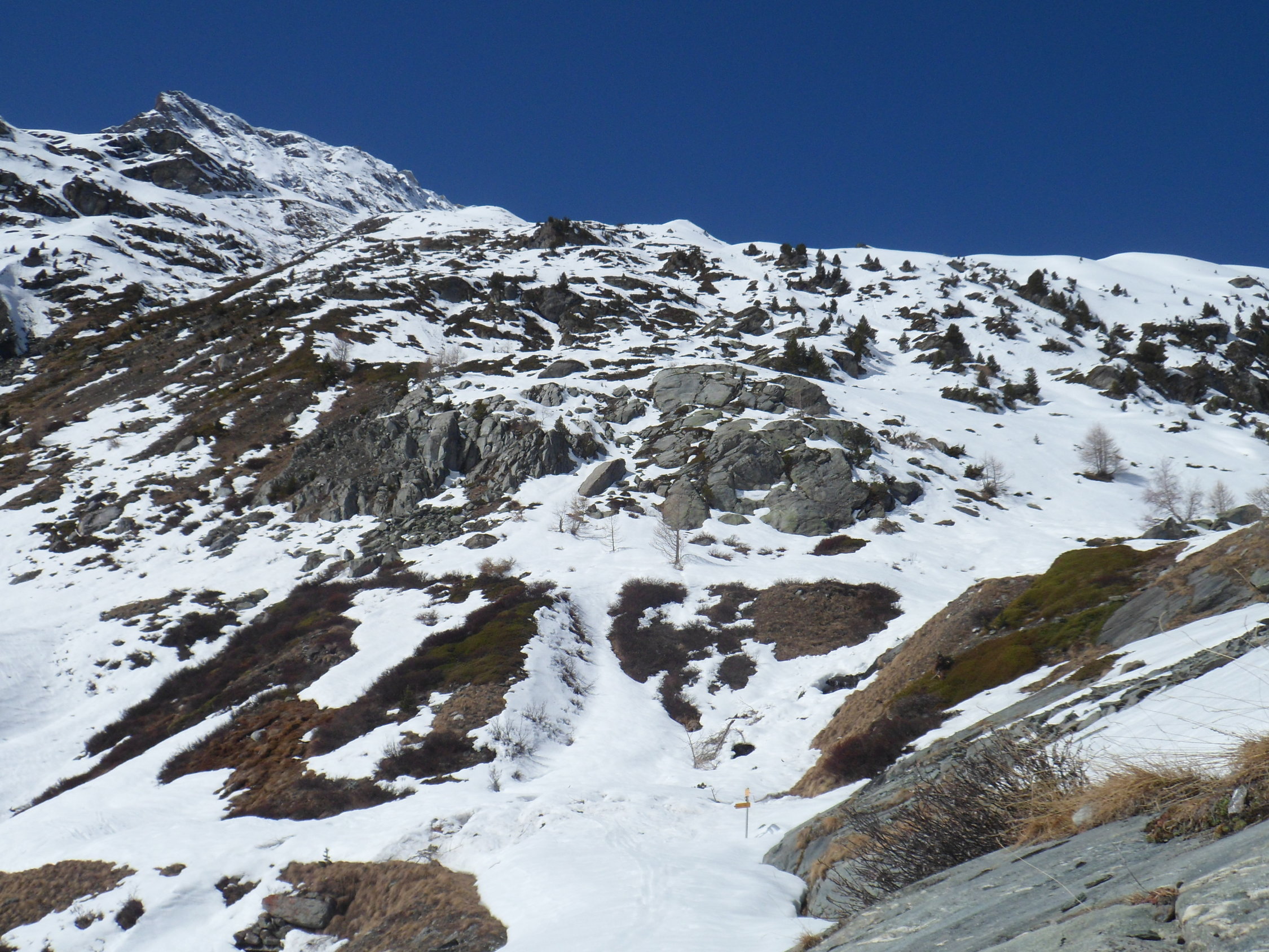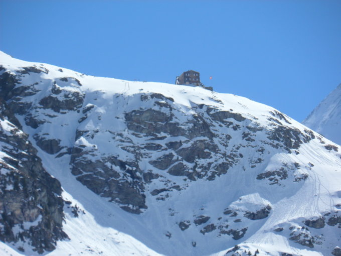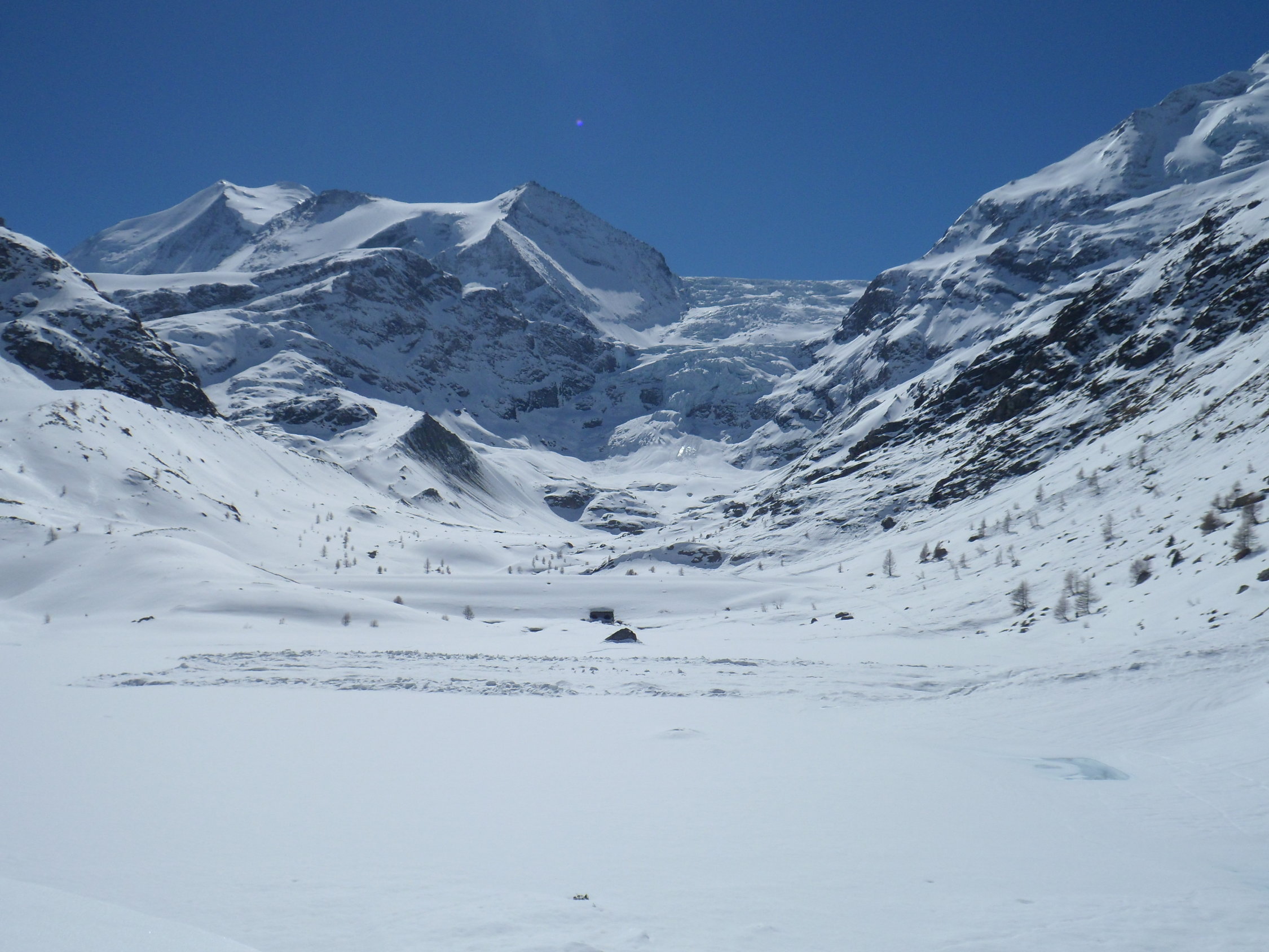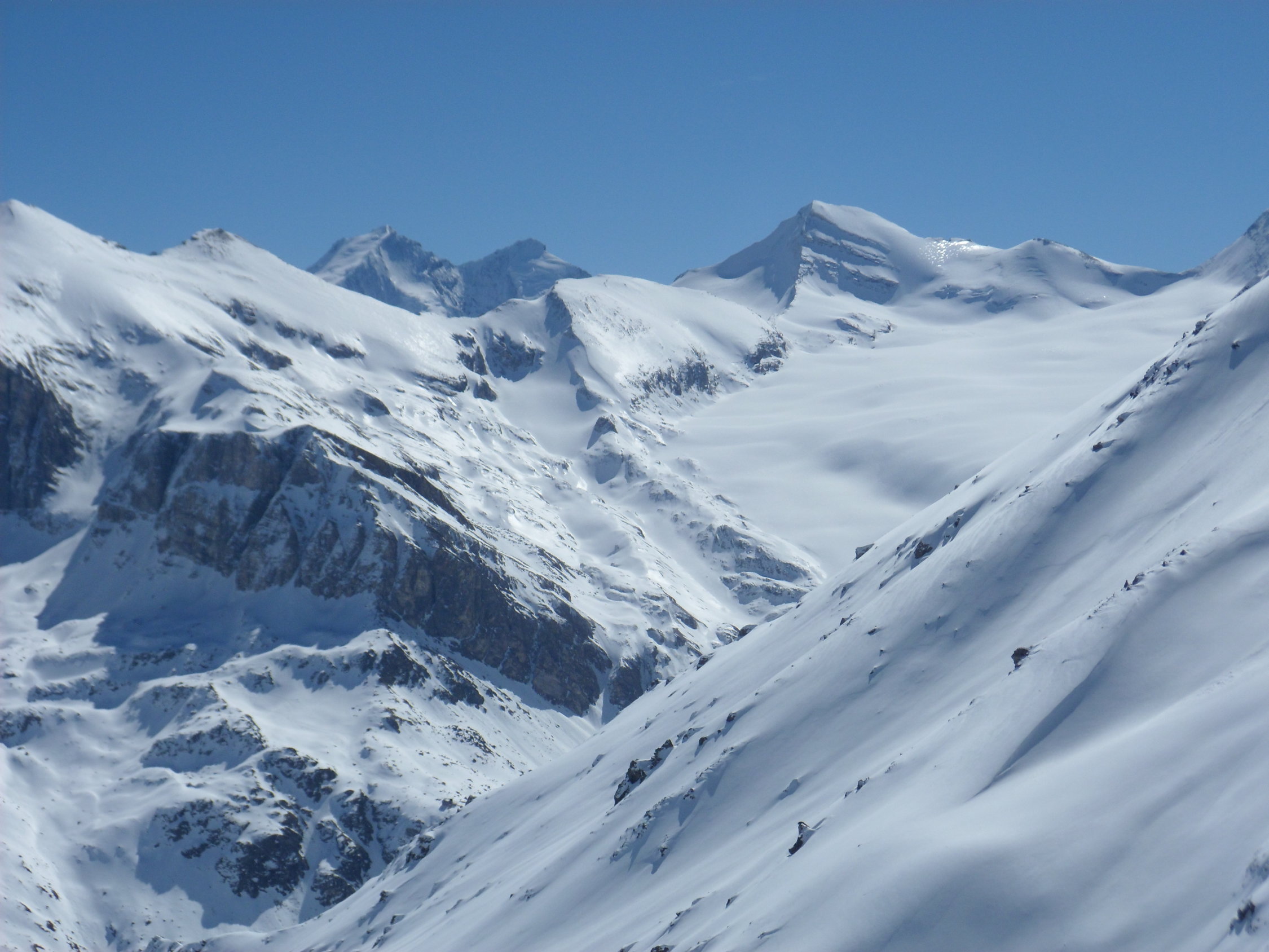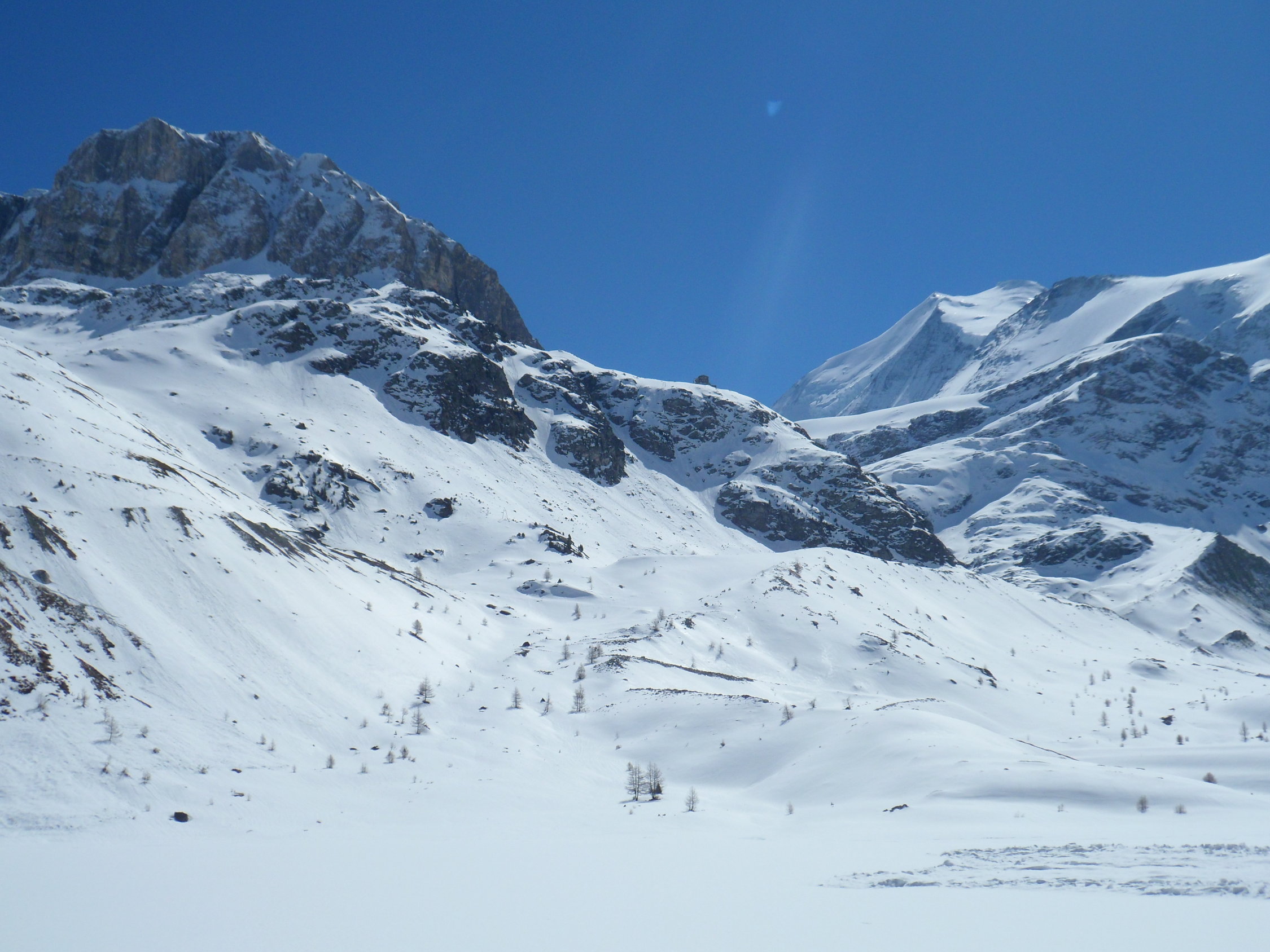 Hotel Weisshorn - L'omen roso - Turtmann-Hütte Vom Hotel Weisshorn zur Bella Vouarda - über Punkt 2609 und Punkt 3031 zum Col de l'Omen Roso. Abstecher auf den Gipfel. Abfahrt in der Fallinie zum Stausee. Die beste Linie ist nicht ganz einfach zu finden. Im oberen Teil des finalen Steilhangs unterhalb Friliwäng muss mann etwas rechts halten und dann wieder nach links.