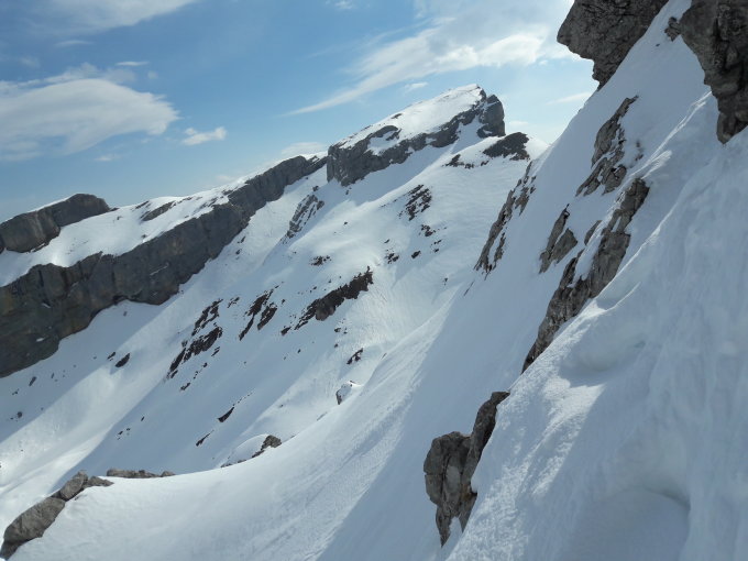 Wir deponierten die Ski vor der harten Steilhangtraverse zum Chaisertour und querten diesen mit Steigeisen. Ein Ausrutscher und weggleiten mit den Ski im harten Hang Richtung abschüssiger Felsen galt es zu vermeiden.
