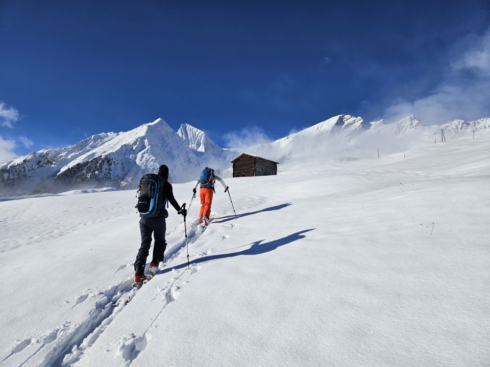 Wir fanden relativ gute Verhältnisse vor, weil es in der Nacht zuvor 20 bis 30 cm geschneit hat auf apere Wiesen. Ab 1900 m liegt der Neuschnee auf Altschnee auf. Nur der Gipfelhang trübte die Abfahrtsfreuden etwas ein, weil hier die Büschel rausschauen. Da gibt es etwas Steinkontakt. Insgesamt ist das zu wenig Schnee, aber um vieles besser als erwartet.