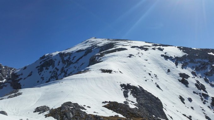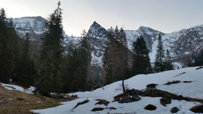Mit dem Mountainbike bis zur Mittereisalm, Ab der Mittereisalm (1300) kann man mit Ski gehen. Aufstieg entlang des Sommerwegs zur Mooswand. Bis zur Mooswand keine tragende Schneedecke um ca. 8 Uhr. Ab der Mooswand dann pickelhart gefroren. Mit Harscheisen aber gut zu gehen. Die Steilflanke hinauf zum Karlkopf ist bereits Aper. Deshalb ca. 200 hm Ski tragen. Kurz vorm Karlkopf Gipfel dann durchgehende Schneedecke bis zum Gipfel.