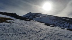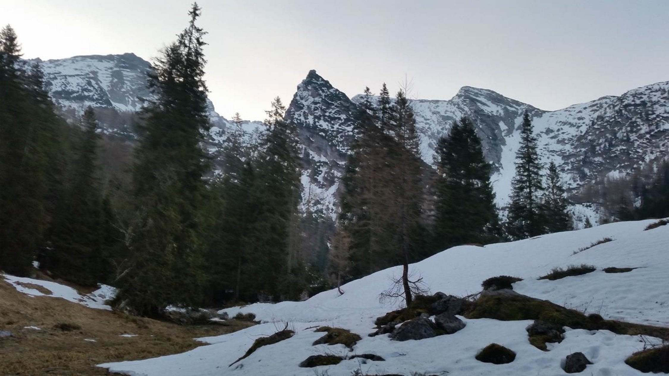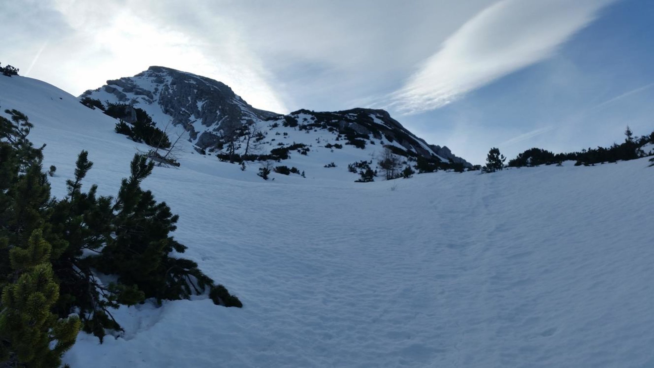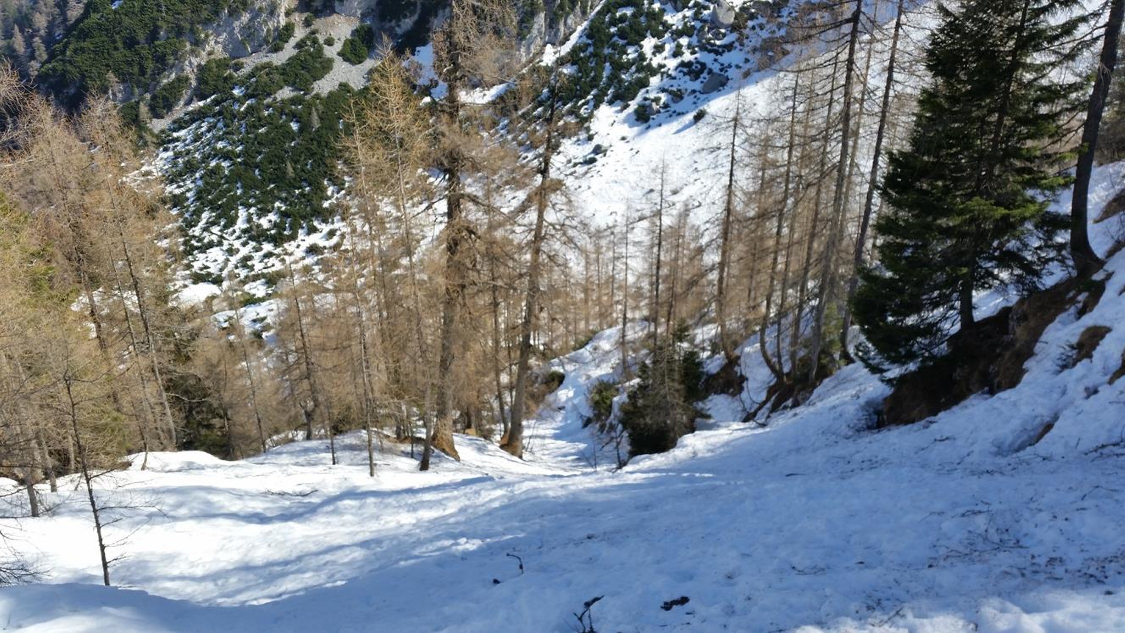Abfahrt: Gipfelflanke um 11 Uhr noch pickelhart. Auch der Kamm unterhalb vom Karlkopf noch pickelhart. Leider die Steilrinne im Wald bei der Mooswand nicht tragend und sehr schwer zu fahren (Bruchharsch, Sulz, Lawinenknollen). Bis zur Mittereisalm dann wechselnd Bruchharsch und Sulz. Ab der Mittereisalm dann entspannt mit dem Radl ausrollend bis zum Hintersee.