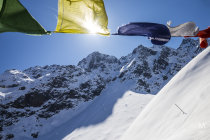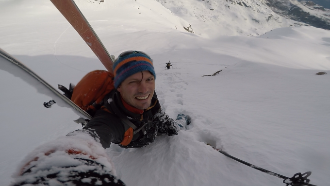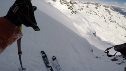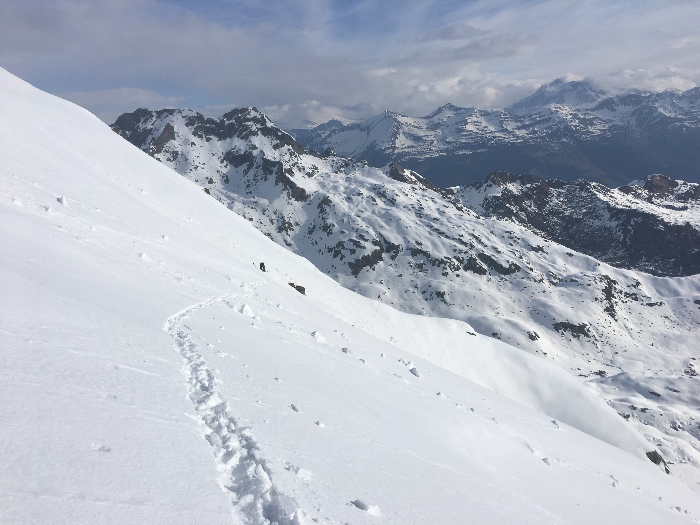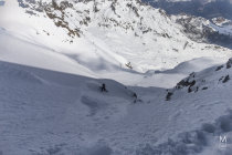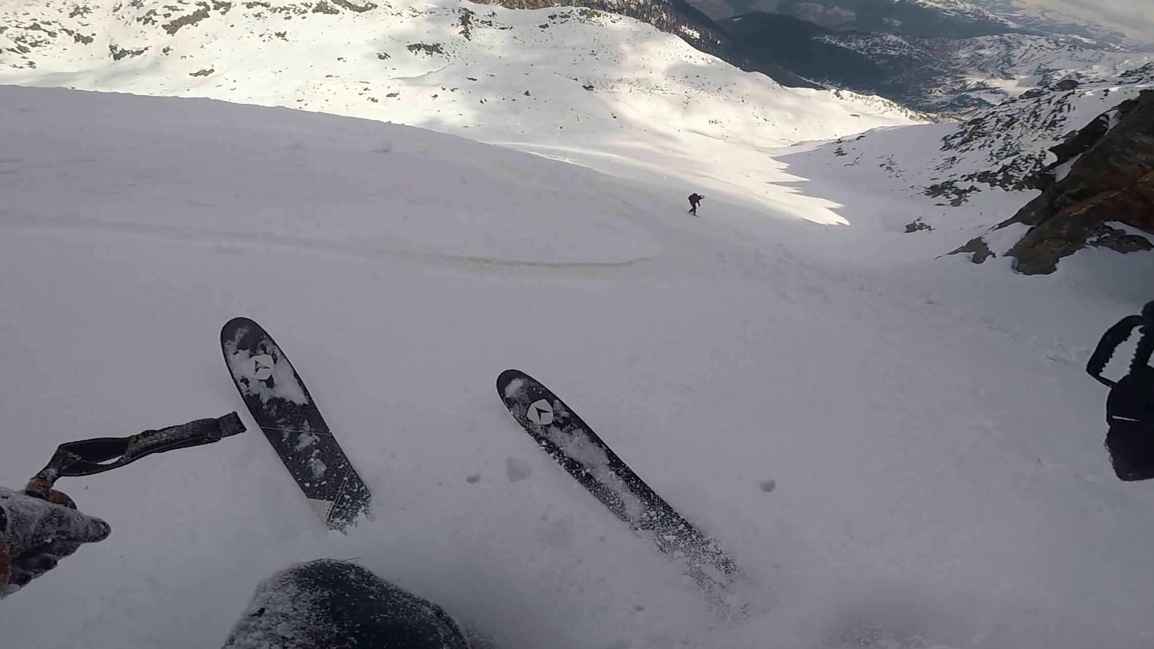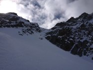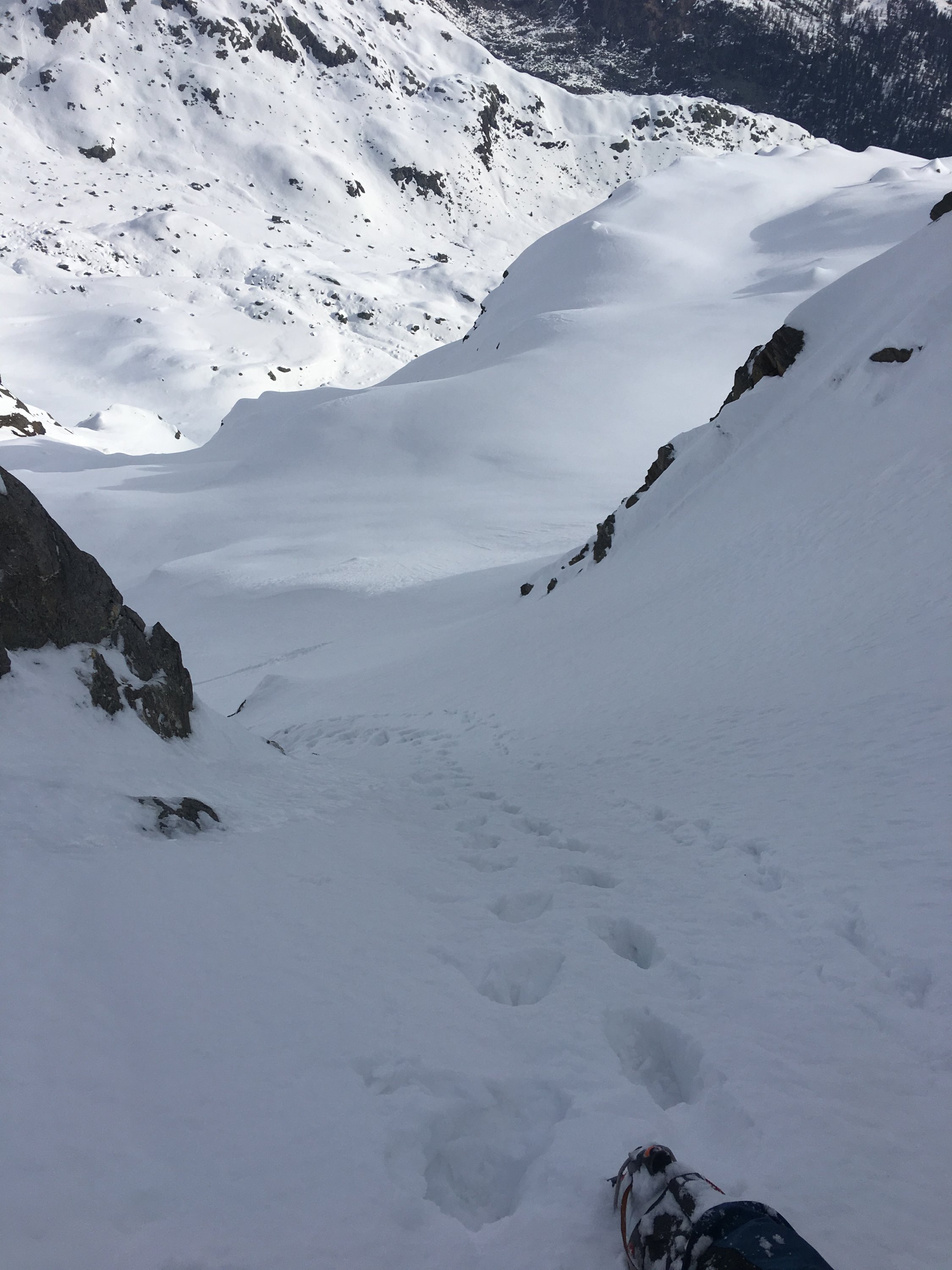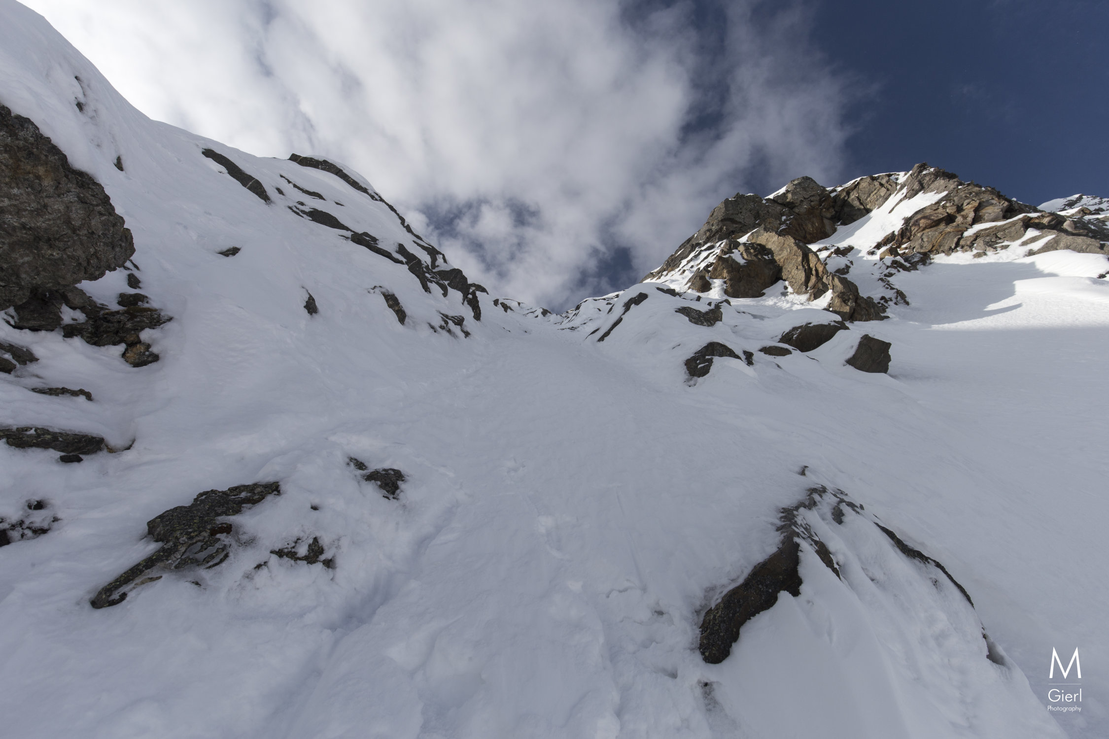 Start an Hütte um 07:00 Uhr. Nach sternenklarer Nacht gutgriffiger gefrorener Firn teils von Lawinenkegeln durchsetzt. Harscheisen angenehm aber nicht zwingend. 1 Coulouir mit gutem Trittschnee, Steigeisen sinnvoll. In der Querung anschließend am Morgen problemlose Spuranlage, bei der Abfahrt haben wir hier ein kleines Schneebrett ausgelöst. 2 Couloir vor allem