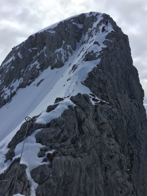 Am Grat liegt guter Trittschnee und das Stahlseil ist zu 90% frei. Die Kette oben ist nicht mehr vereist. Steigeisen und Pickel für den sicheren Halt. Danach problemlos zum Gipfel.