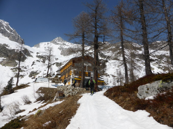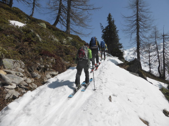 Hüttenzustieg: der viele Schnee zu Beginn in All'Acqua täuscht, bald ist Skitragen angesagt bzw. besser gleich am Anfang Skis aufbinden und bis kurz vor der Hütte den Sommerweg benutzen. Die letzten ca.20 Min. dann auf Skis. Dito natürlich für den Abstieg/Abfahrt.