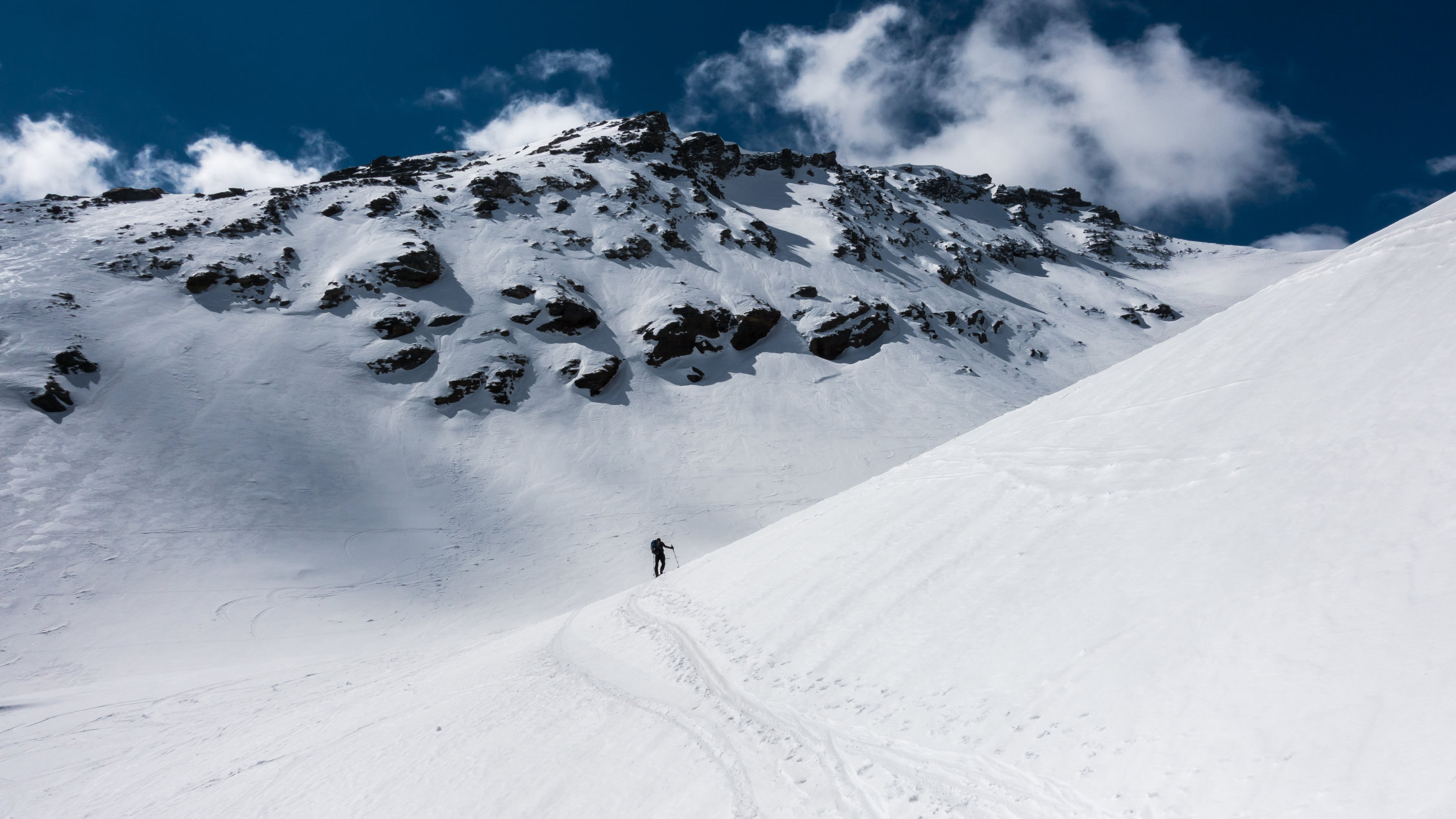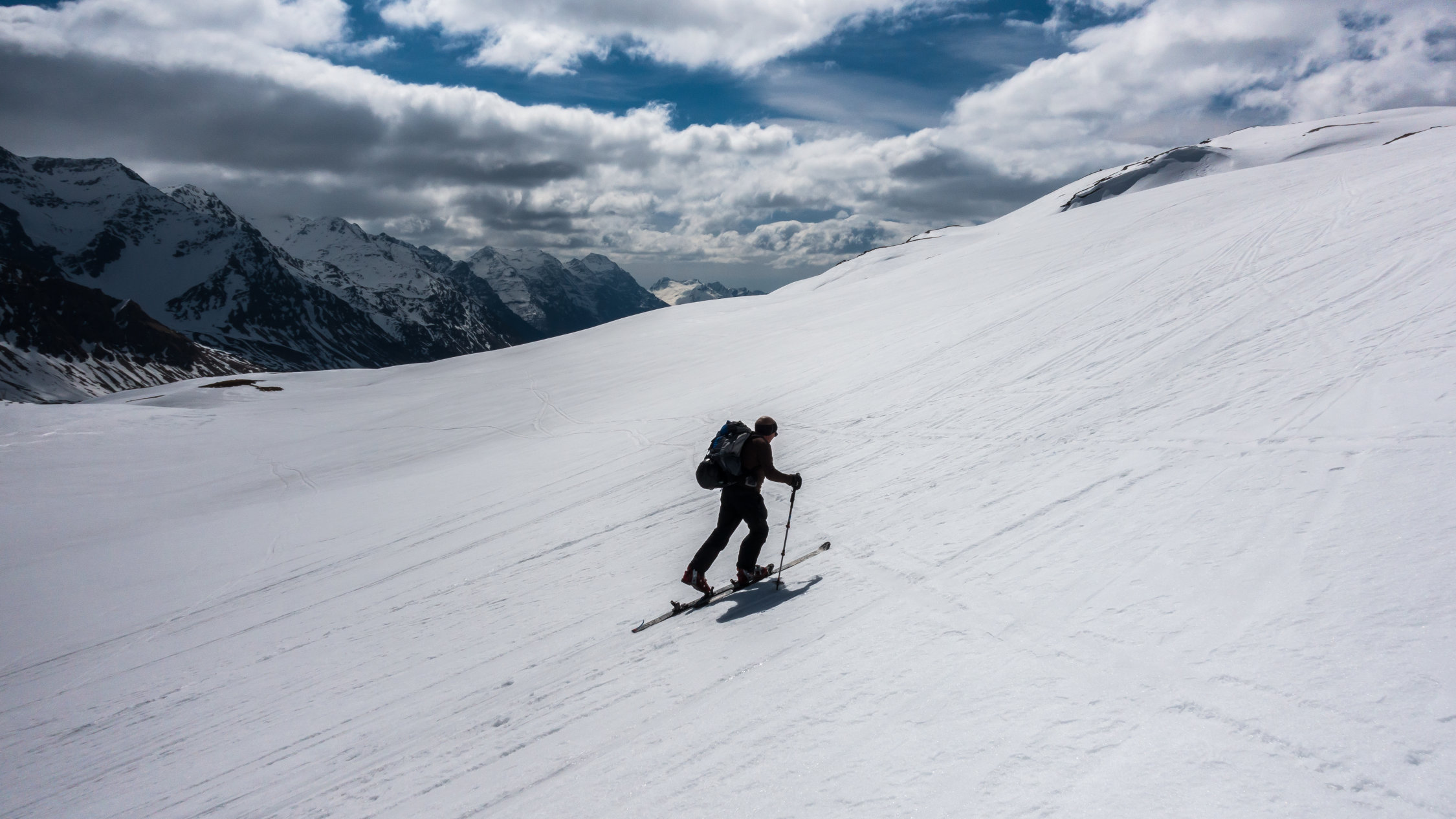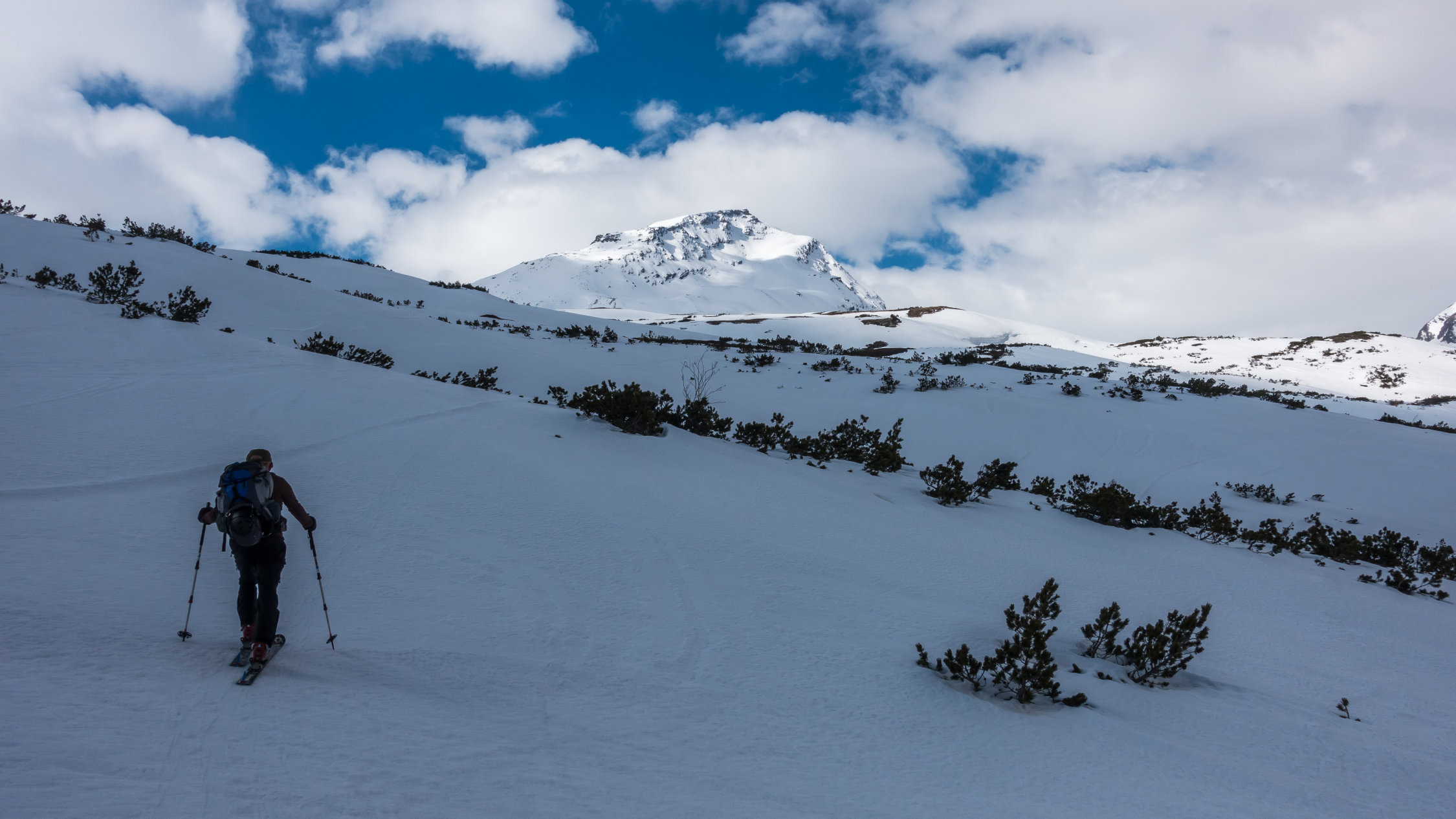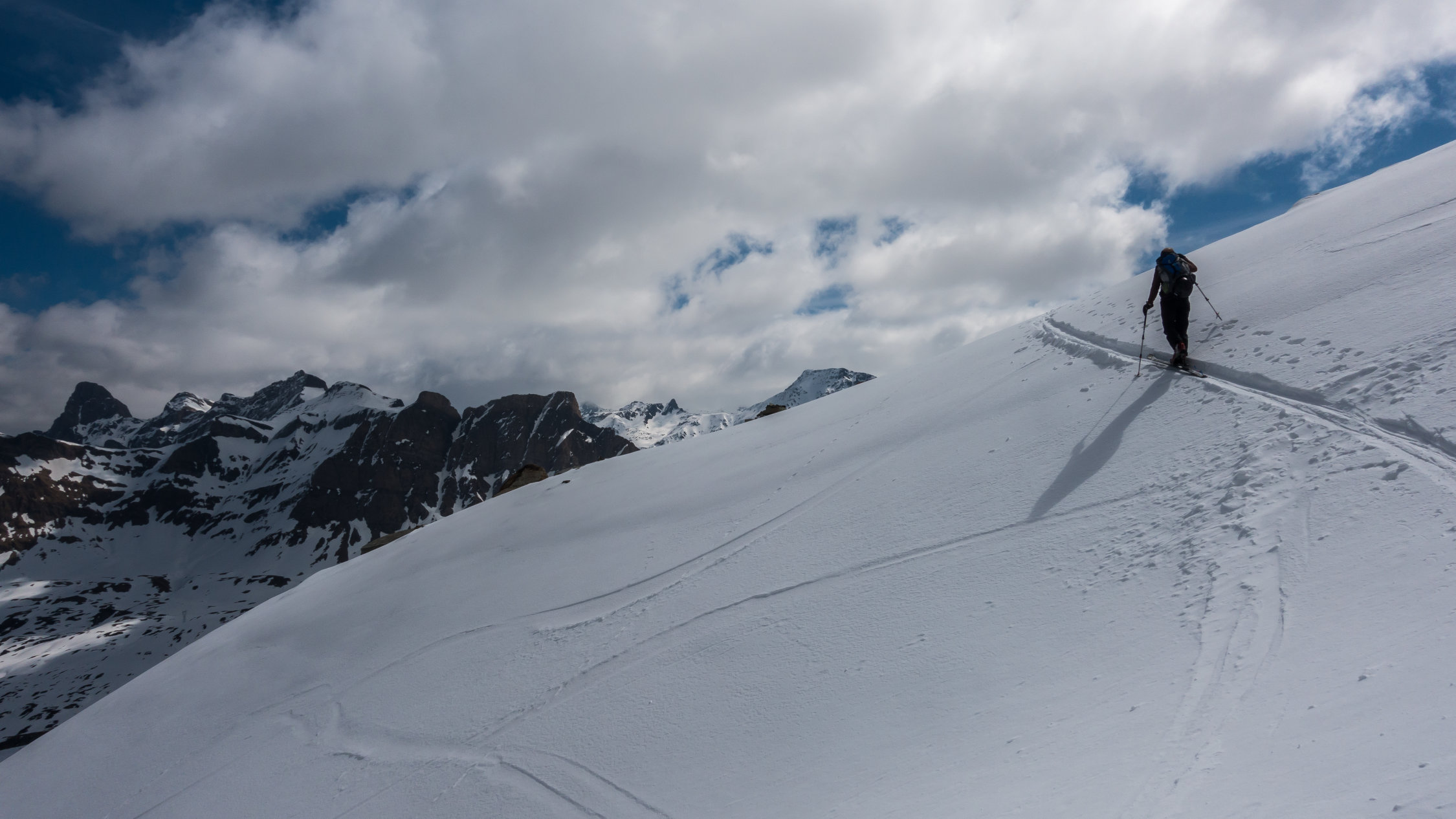 Start um 10 Uhr bei -1°, bewölkt mit Aufhellungen, windig. Schneedecke gefroren. Durch die nördliche Ausrichtung hat es noch Schnee bis fast zum Startpunkt auf ca. 1600m. Direkter Aufstieg westlich des Bachtobels über die Steilstufe mit Harscheisen. Danach ohne Harscheisen einfach über relativ flaches, coupiertes Gelände und dann steil (35°) den Gipfelaufbau hinauf. Gute, griffige Spur. Bei den jetzigen Bedingen einfache Tour. Wir haben heute auf den Gipfel verzichtet und sind kurz davor umgekehrt, da der Schnee im unteren flacheren Teil deutlich besser war.