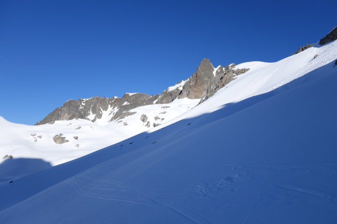 07.45 Uhr Start ab Steingletscher bei mässigem Wind und angenehmen Temperaturen. Abfahrt Gipfel 11.15 Uhr: Perfekte Sulzverhältnisse!