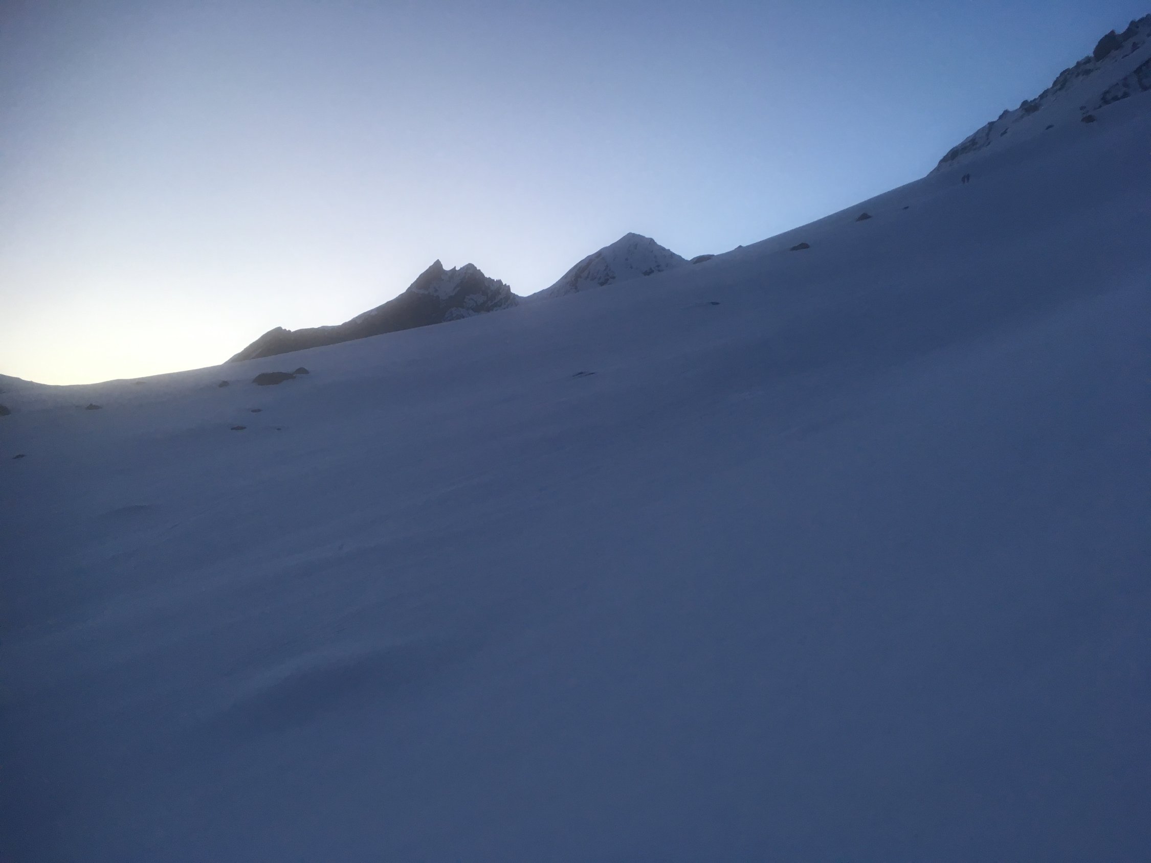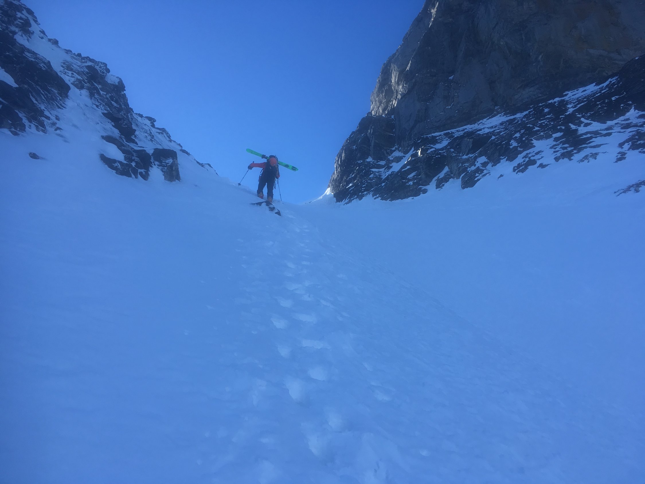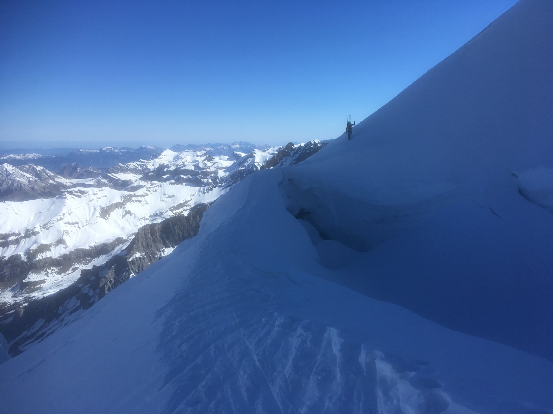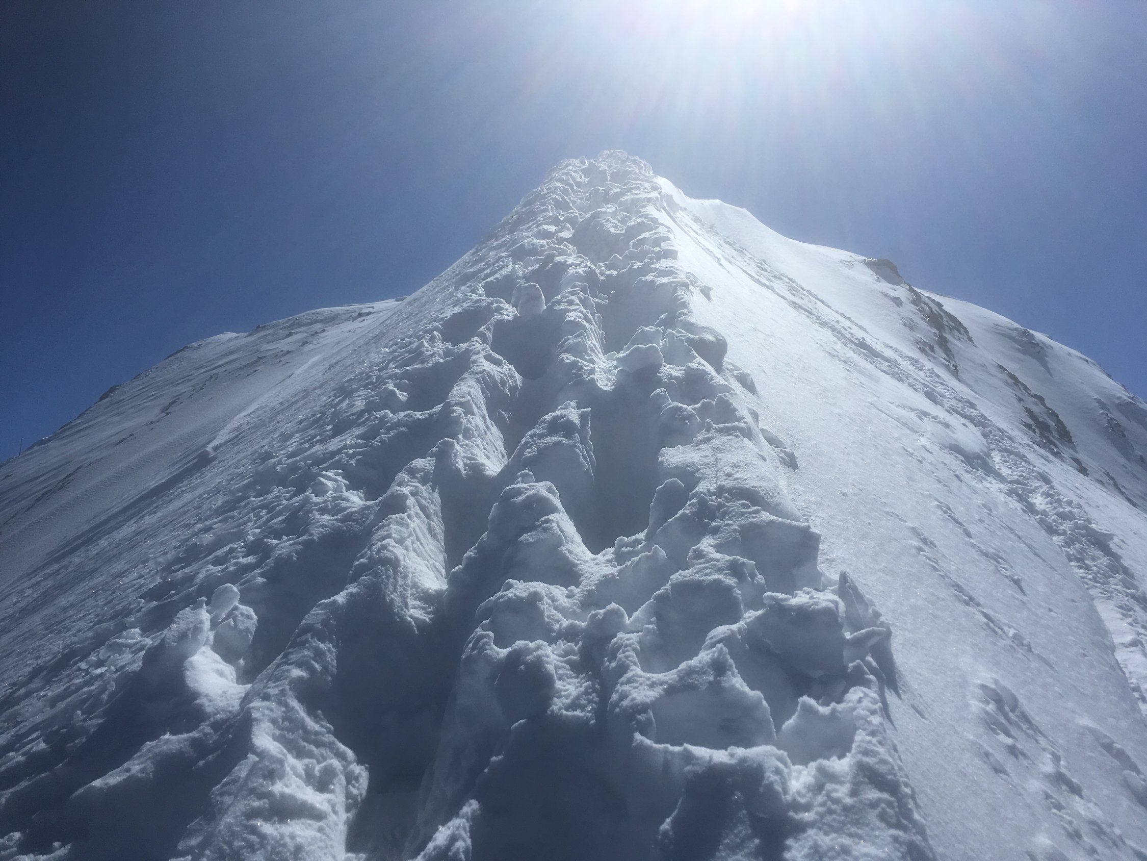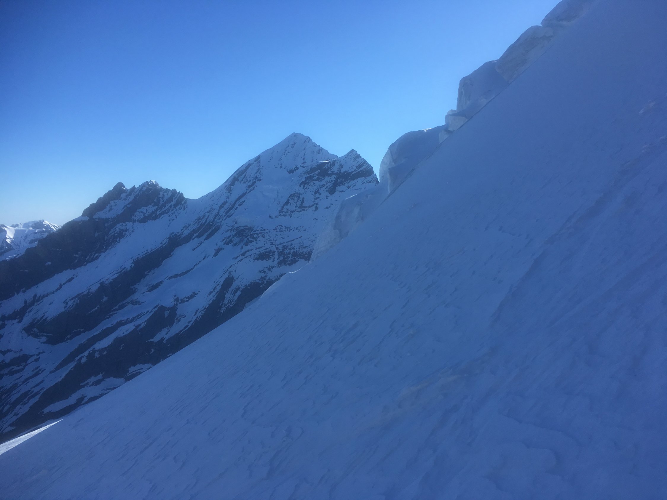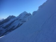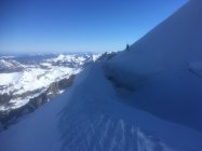 Start in Doldenhornhütte (nur Winterraum offen) um 06:30. Schnee meistens hart (Harscheisen). Couloir sehr gut begehbar (Tritte halten). Gletscher sehr gut eingeschneit. Auf 3350 m quert eine riesige Spalte die ganze Gletscherbreite und nur ganz links ist ein Durchkommen. Die Brücke sieht mittelfristig (Spätfrühjah) nicht sehr haltbar aus. Abfahr vom Gipfel um 12 Uhr. Fast alle Schneearten angetroffen. Noch etwas Pulver, viel Presspulver, harte Oberfläche und Bruchharst. Für Sulzschnee im unteren Teil war ich noch etwas zu früh.