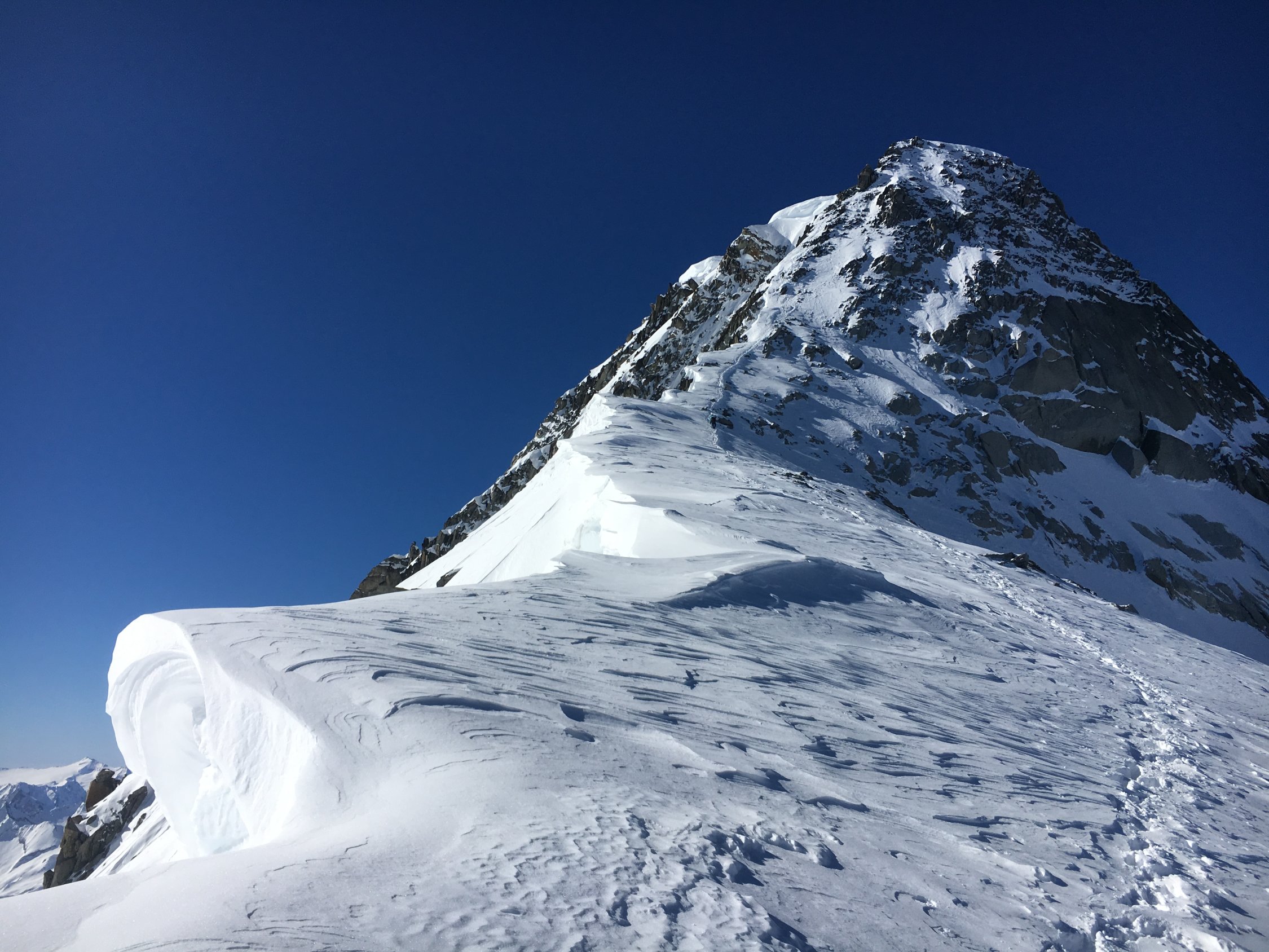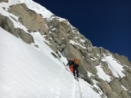 Mit Steigeisen und Pickel erklommen wir die letzten steilen Meter bis zum Grat, auf dem sehr viel Schnee lag, der uns einen angenehmen Weg bis zum Nordgrat bot.