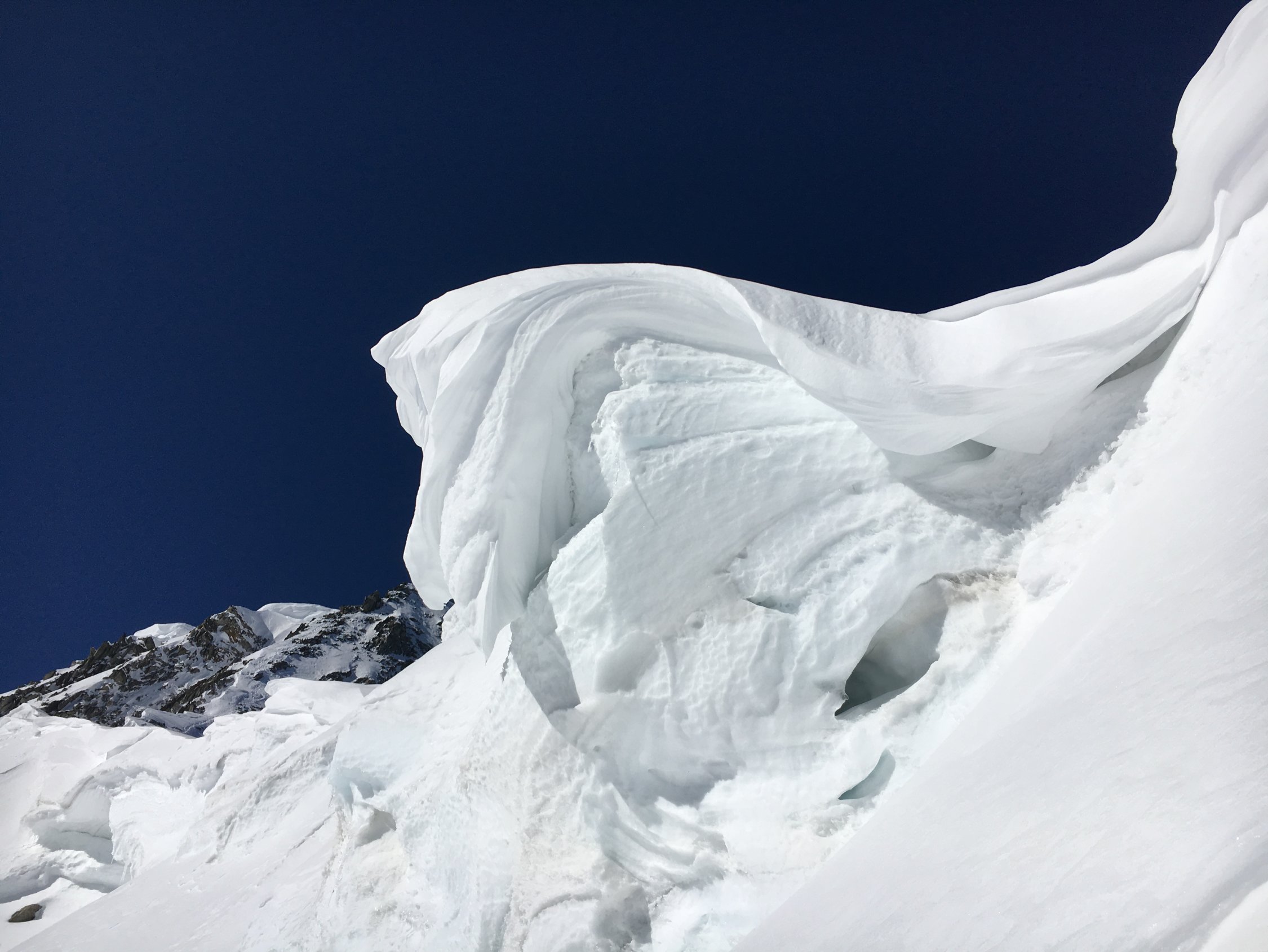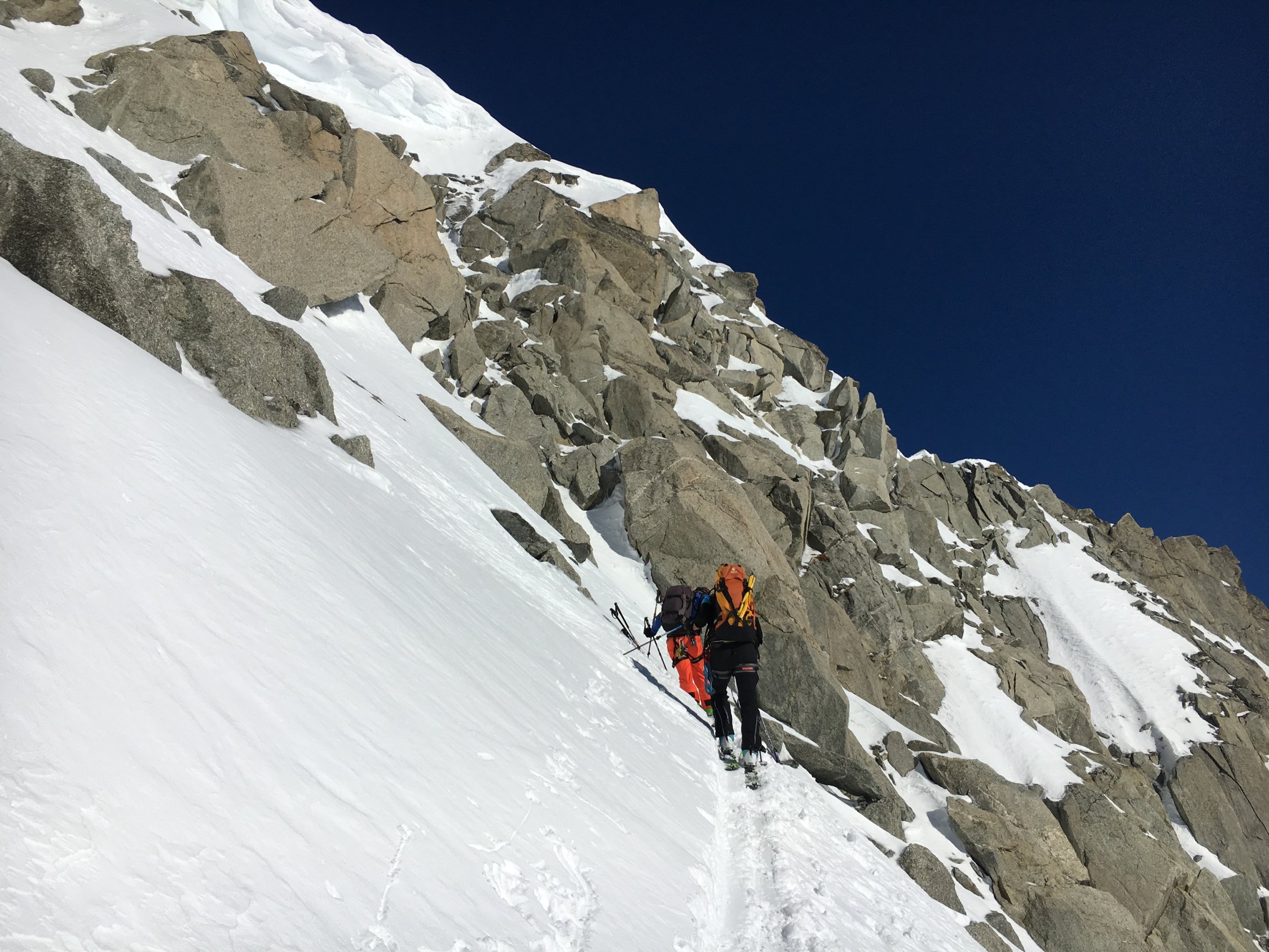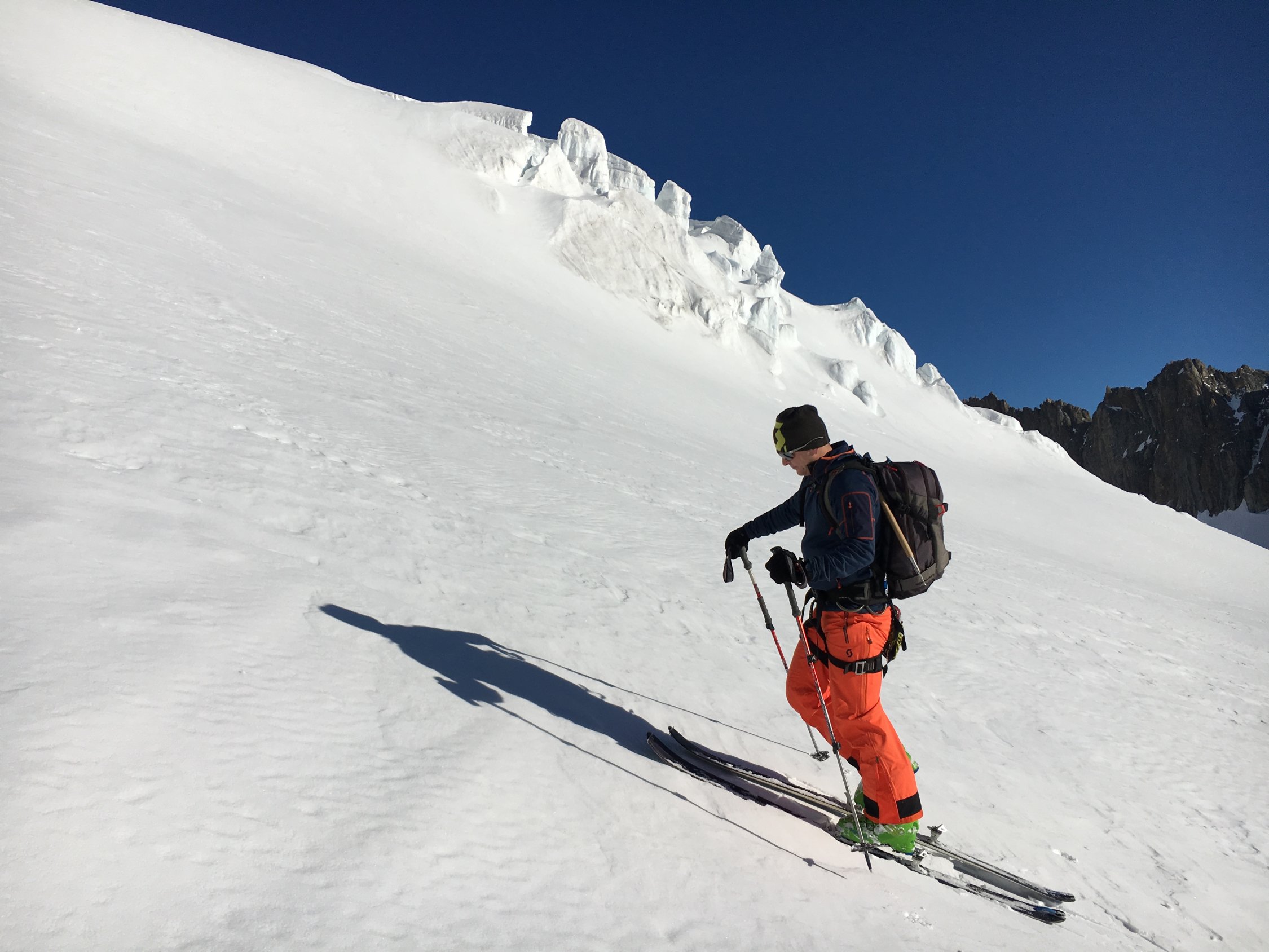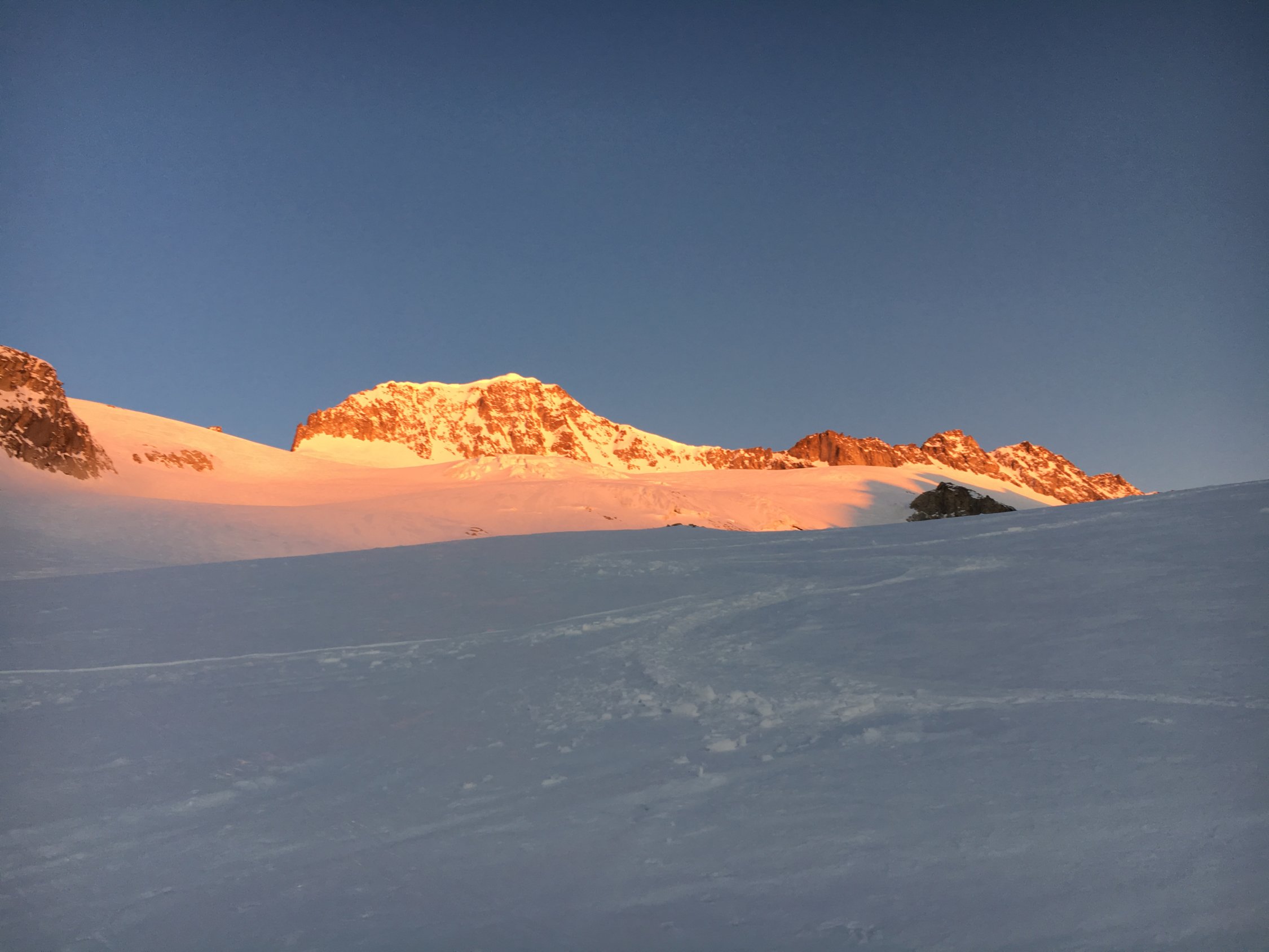 Als die Sonne aufging, waren wir bereits weit oben am Tiefengletscher. In der Höhe der Gletscherbruchs machten wir auf 3'000 die erste Pause. Danach gingen wir zügig bis zum Fuss der Felsen. Wir nützten die das steile Schneefeld, um mit den Skiern so weit wie möglich aufzusteigen und errichteten unser Skidetpot weiter oben als üblich.
