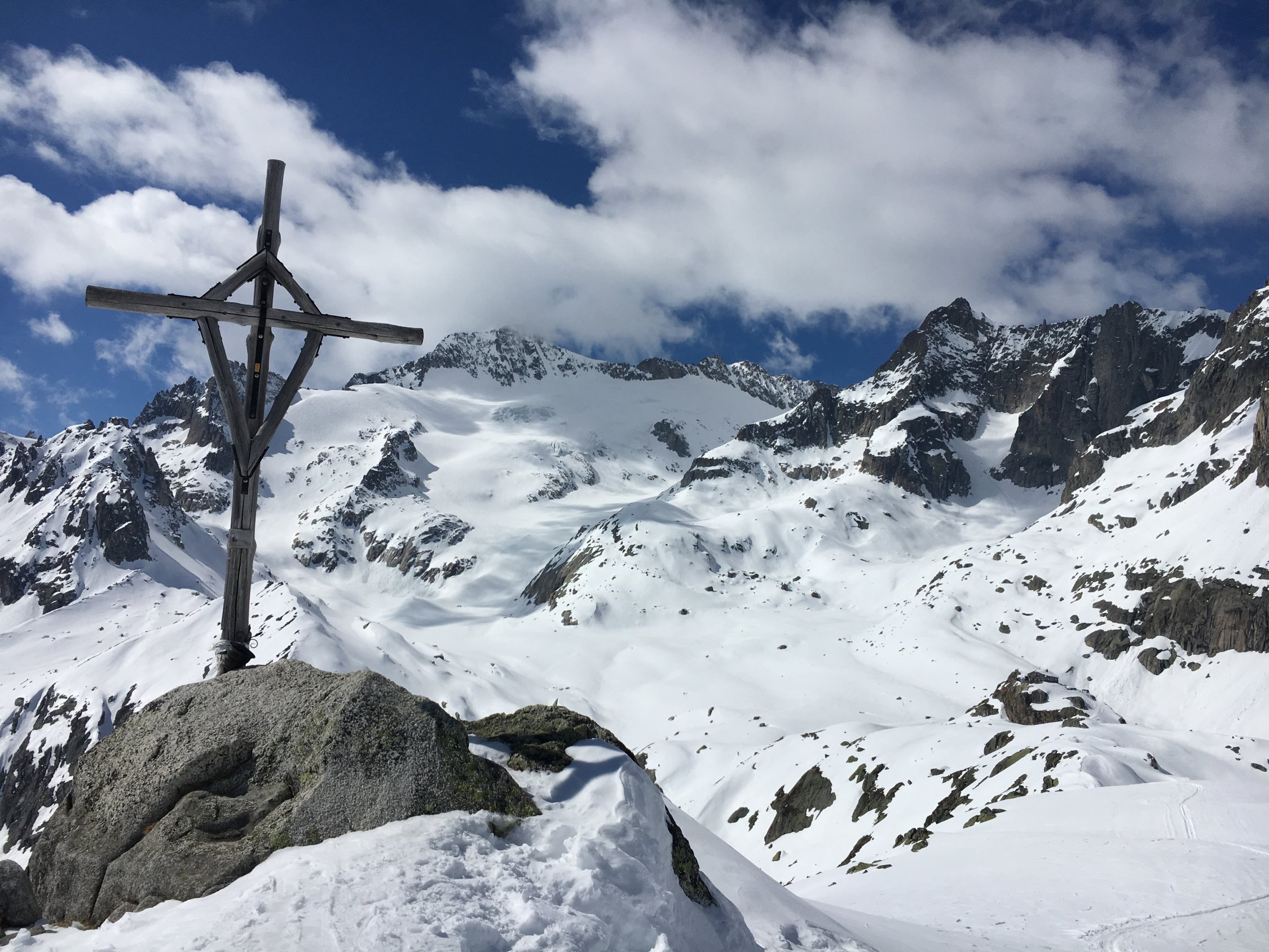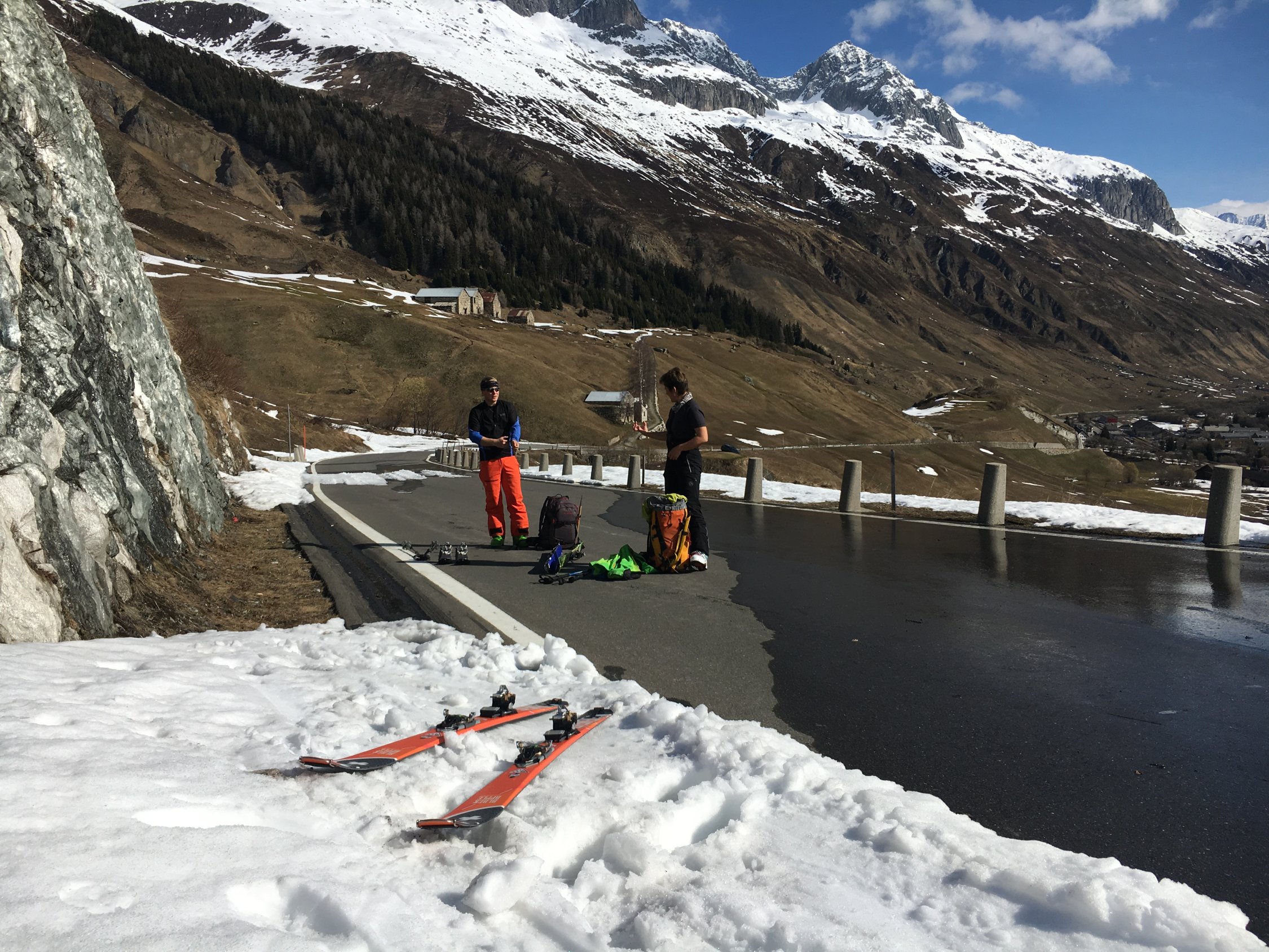 Wir sind am Vortag mit dem ÖV angereist, Ankunft in Realp um 10 Uhr. Wir mussten die Ski ca. 1/2 Stunden schultern bis zu den ersten Schneefeldern und dann nochmals 3 Kehren auf der aperen Passstrasse laufen, bis wir die Schneeuntergrenze erreichten. Als wir in der brütenden Mittagshitze aufstiegen, stellten wir fest, dass viele Autofahrer die Gelegenheit genutzt hatten, bis zum Hotel Galenstock hinaufzufahren.