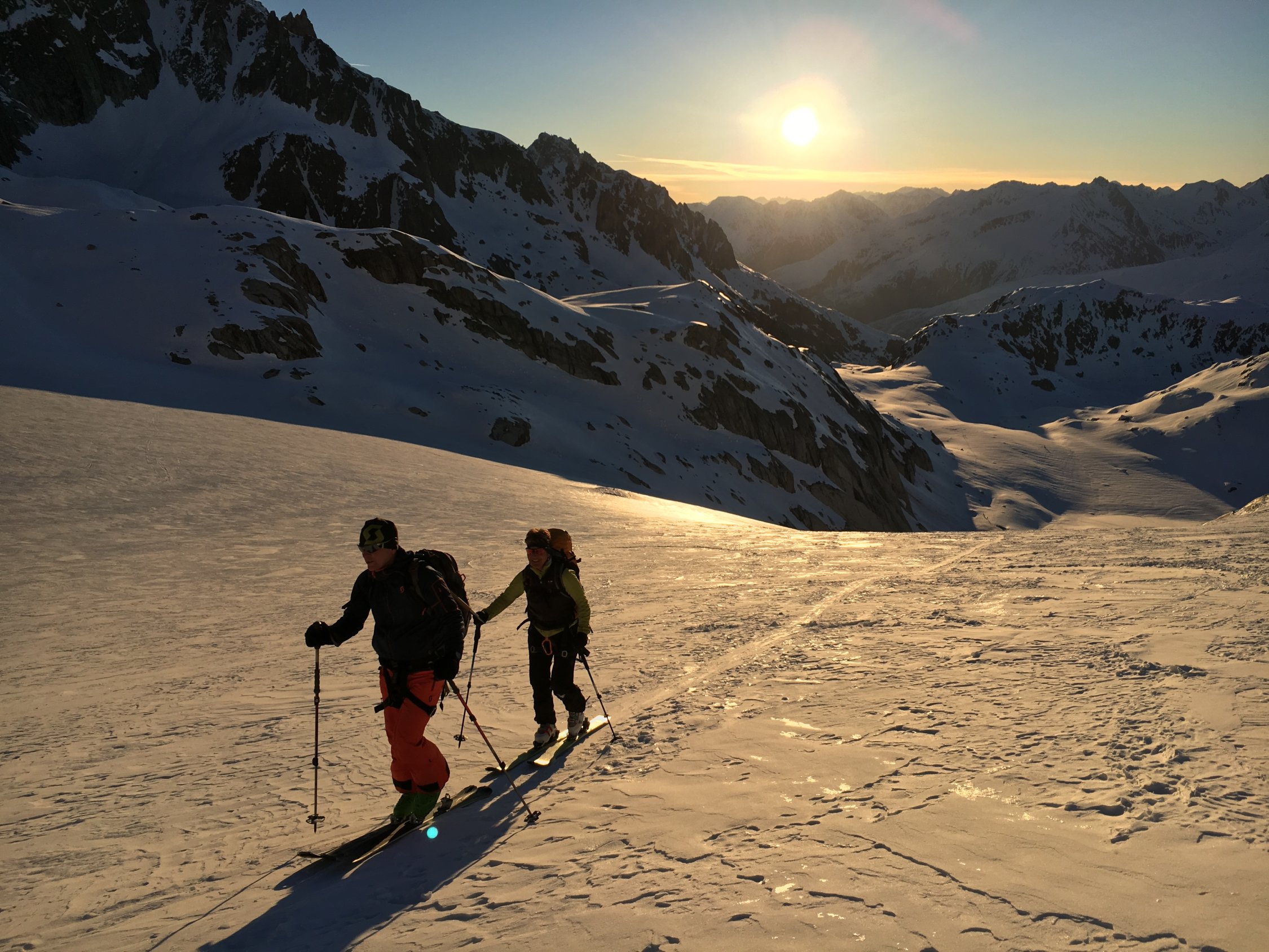 Nach einer kurzen Abfahrt klebten wir die Steigfelle auf und konnten bald die Stirnlampen ausschalten. Die Farben des Morgengrauens waren wunderschön und einen Moment lang beleuchtete die Sonnne den Galenstock blutrot.