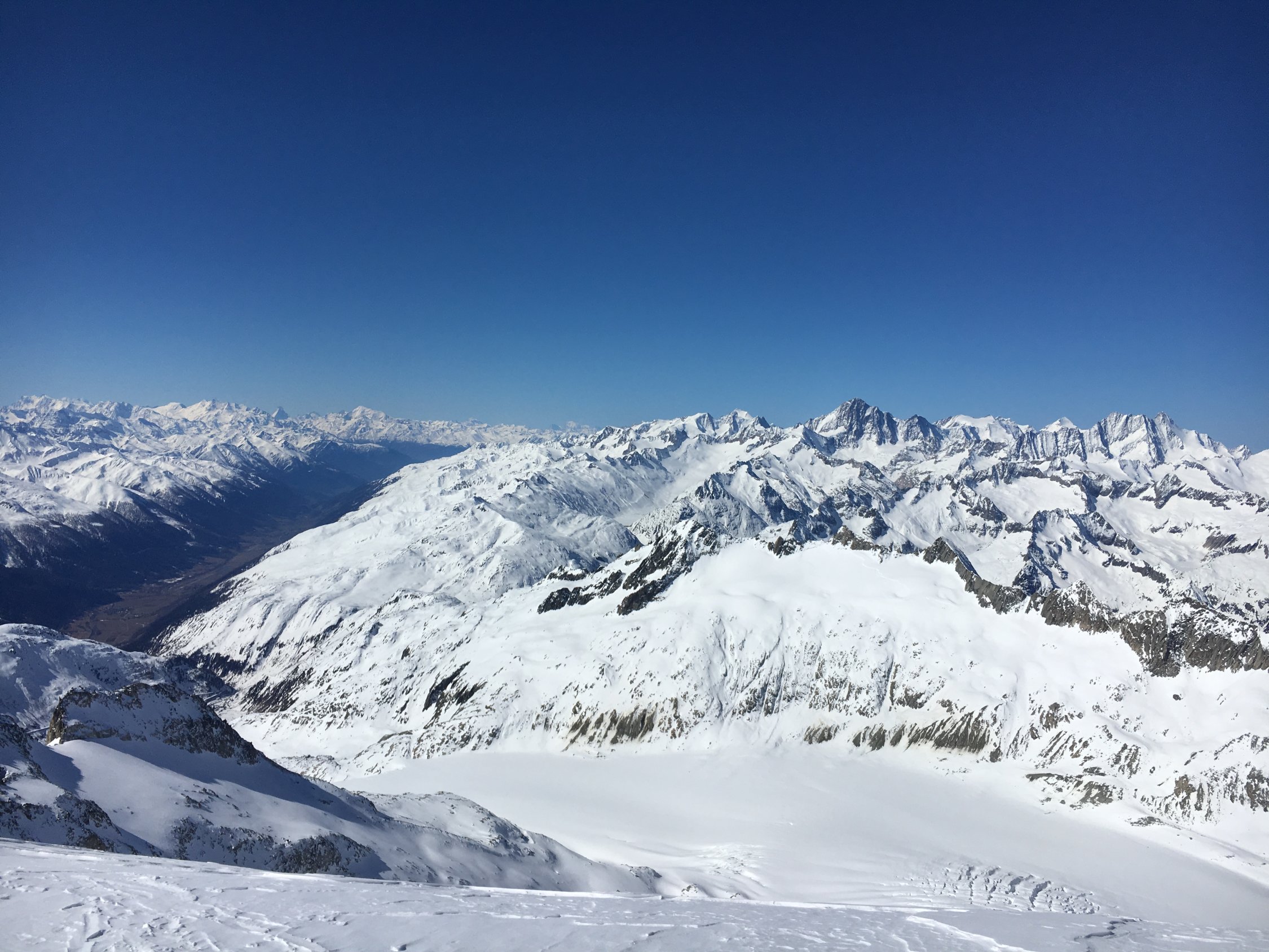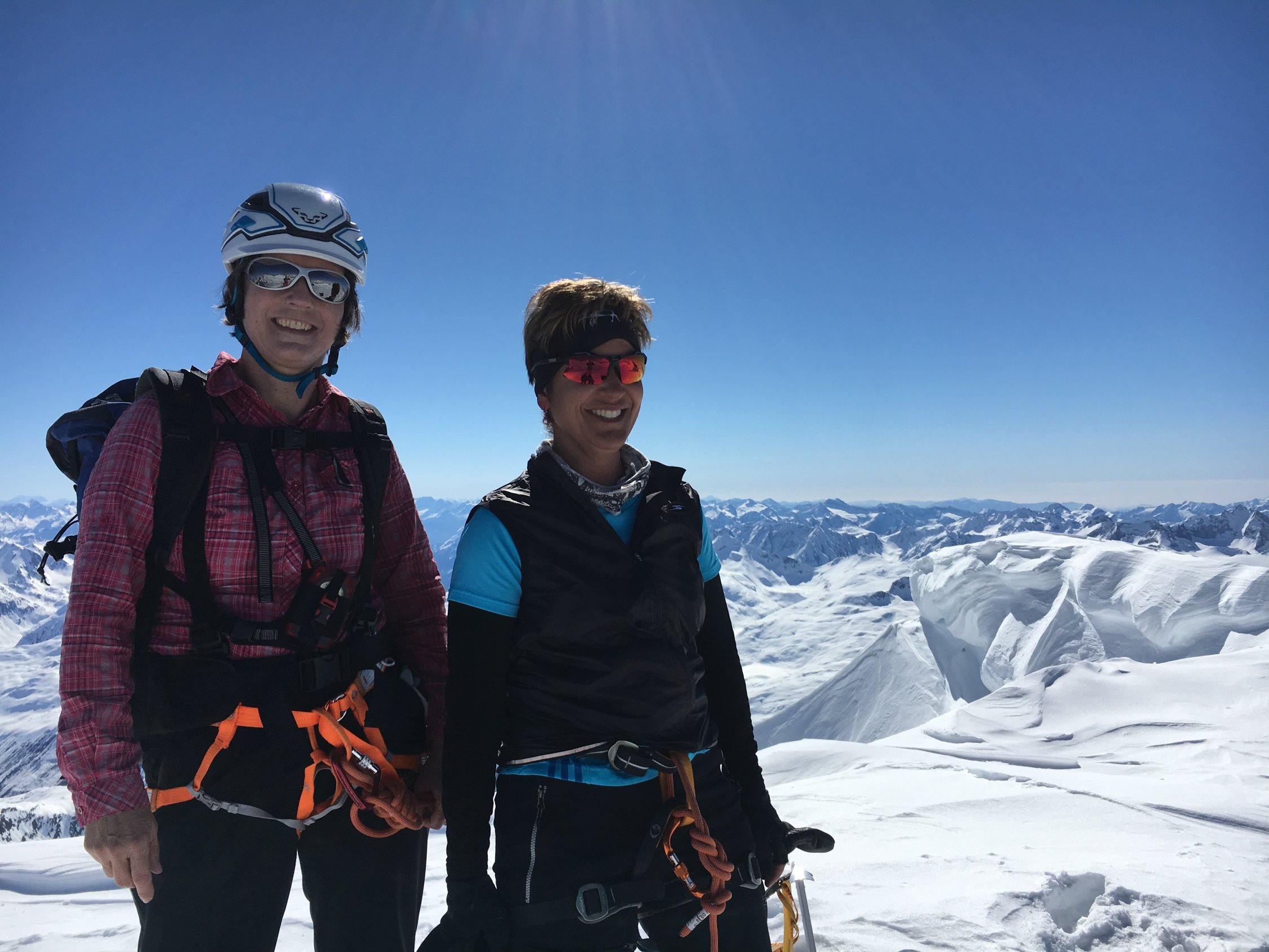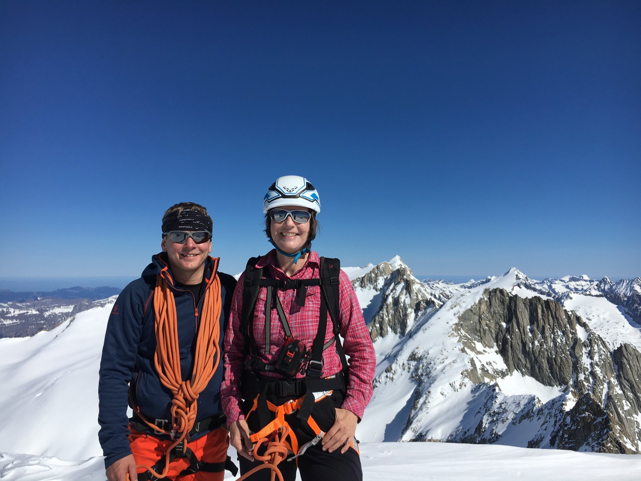 Nach einer kurzen, konzentrierten Kletterpartie erreichten wir um 11 Uhr den Gipfel und genossen den Ausblick auf alle Viertausender der Berner und Walliser Alpen.