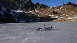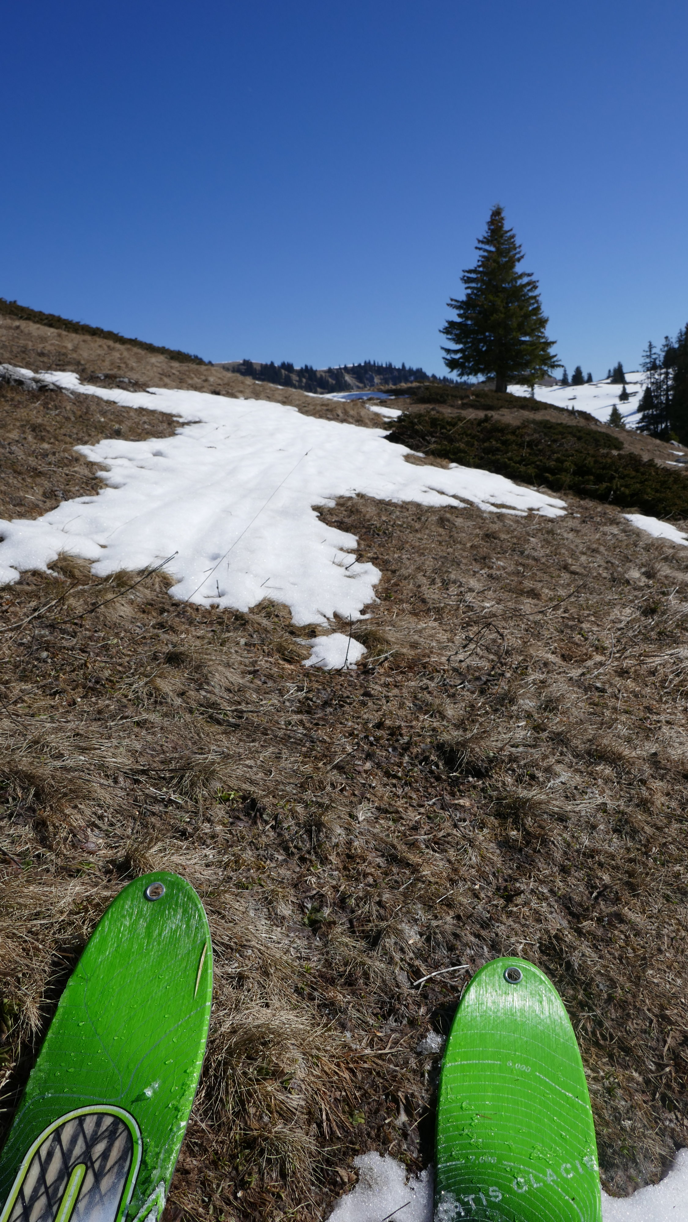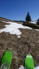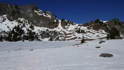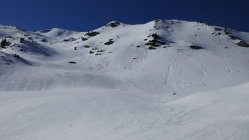Kurz vor dem Ausfluss des Seebergsees bin ich den schneefreien Hang aufgestiegen. Beim Seebergsee war der Schnee um 11:30 in den flachen stücken ohne Skier tragend. Abfahrt direkt vom See über schöne Hänge.