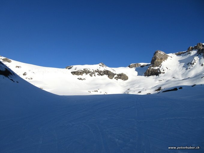 Zuerst zum Wildstrubel dann via Mittelgipfel in die Abfahrt via Frühstücksplatz zur Engstligenalp hinunter. In der Abfahrt meist gepresster Pulver, oft verfahren, unten feuchter aber schön zu fahren. Passage unter dem Frühstücksplatz ist anspruchsvoll, mit vorsichtigem abrutschen gut zu machen. Im Aufstieg hatten etliche Leute ihre Mühe.
