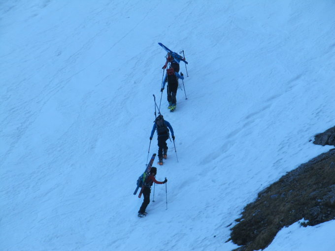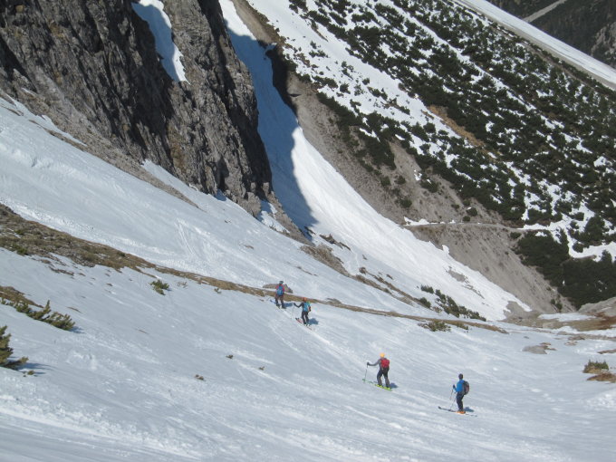 Um 6.30 Uhr in Brand gestartet bei ca. 7 Grad. Den"Bösen Tritt" oberes Teil mit Steigeisen begangen. Der Schnee war beim Aufstieg schon der ideale Abfahrtfirn . Aufstieg im Ganzen gesehen unproblematisch mit durchgehender Schneedecke, ab schon sehr feuchter Schnee. Einige Schneerutsche sind schon am Vortag abgegangen. Abfahrt um 12 Uhr im guten bis schweren Firn.